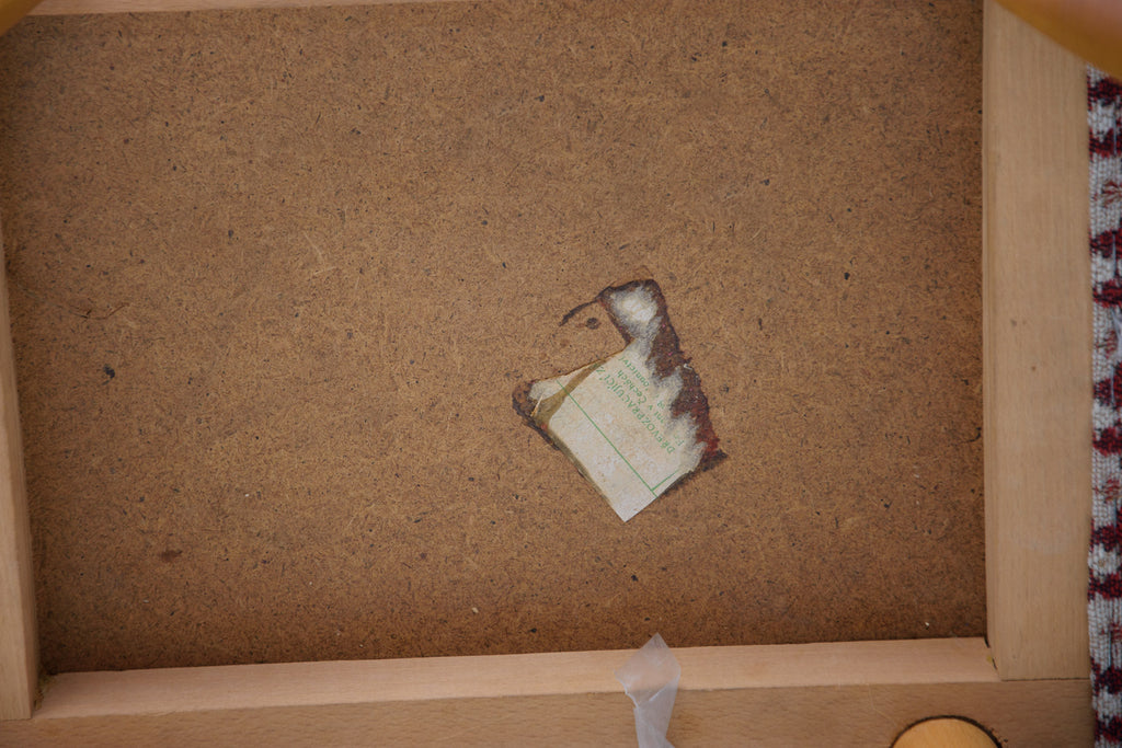 Fabriqué en hêtre, il est recouvert de tissu. Présentant des signes d'usure, le tissu est déchiré dans les coins, mais il est possible de le recoudre.