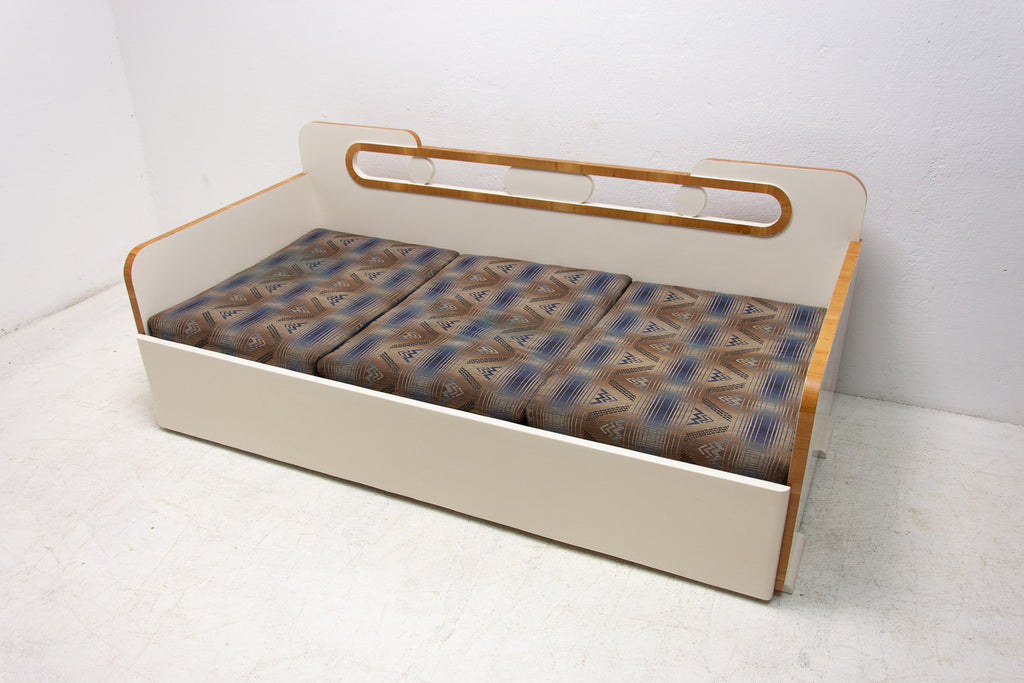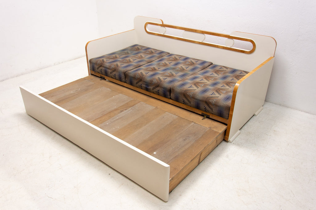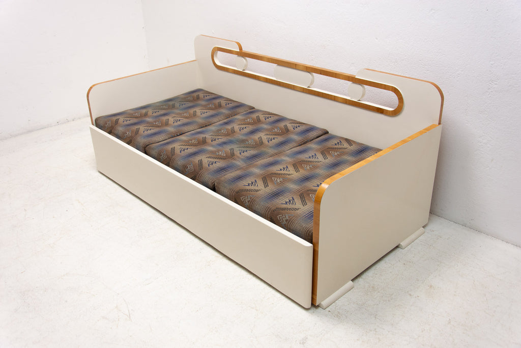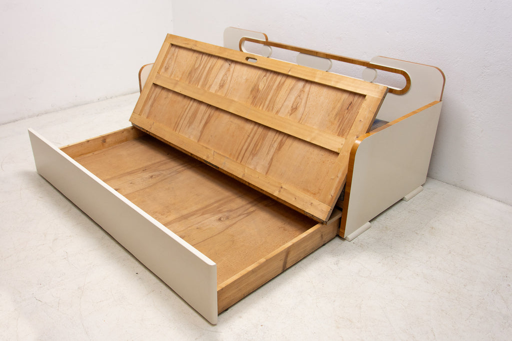 Ce canapé Art déco pliant a été fabriqué dans les années 1930 en ex-Tchécoslovaquie. Il illustre parfaitement le style Art déco tchécoslovaque d'avant-guerre, mêlé à des éléments cubistes. Il se caractérise par une structure en bois peint en blanc et un espace de rangement. Il se déplie comme un lit. Entièrement restauré, le canapé est en excellent état. Les matelas ne sont pas restaurés, mais il est en très bon état.