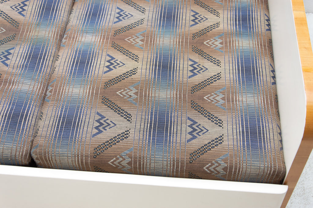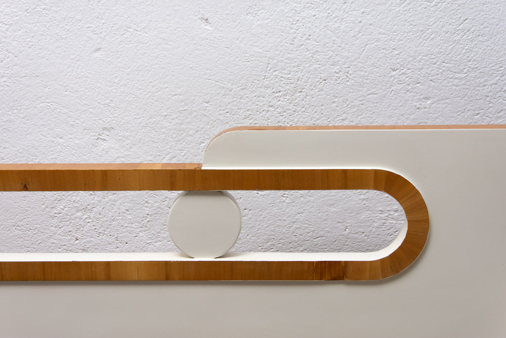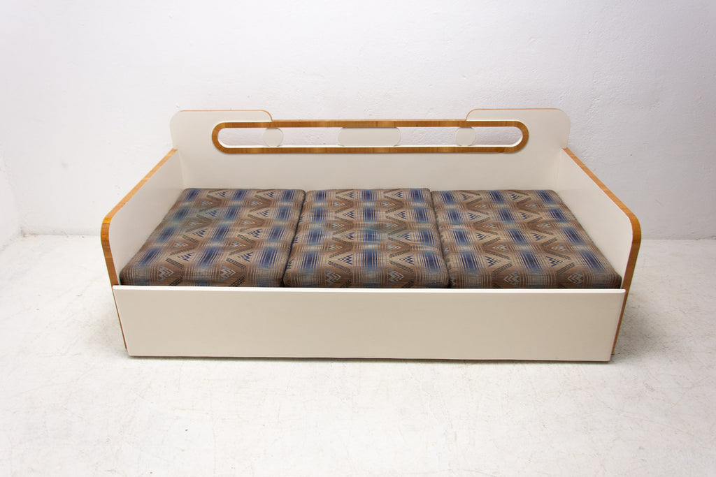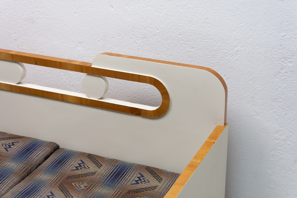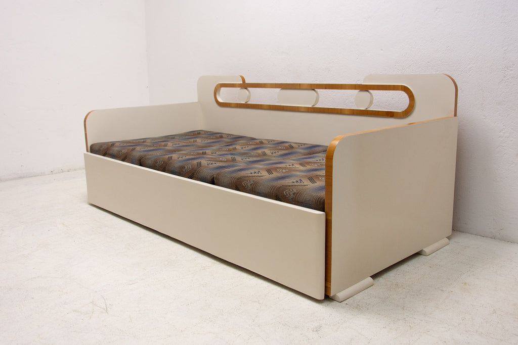 Ce canapé Art déco pliant a été fabriqué dans les années 1930 en ex-Tchécoslovaquie. Il illustre parfaitement le style Art déco tchécoslovaque d'avant-guerre, mêlé à des éléments cubistes. Il se caractérise par une structure en bois peint en blanc et un espace de rangement. Il se déplie comme un lit. Entièrement restauré, le canapé est en excellent état. Les matelas ne sont pas restaurés, mais il est en très bon état.