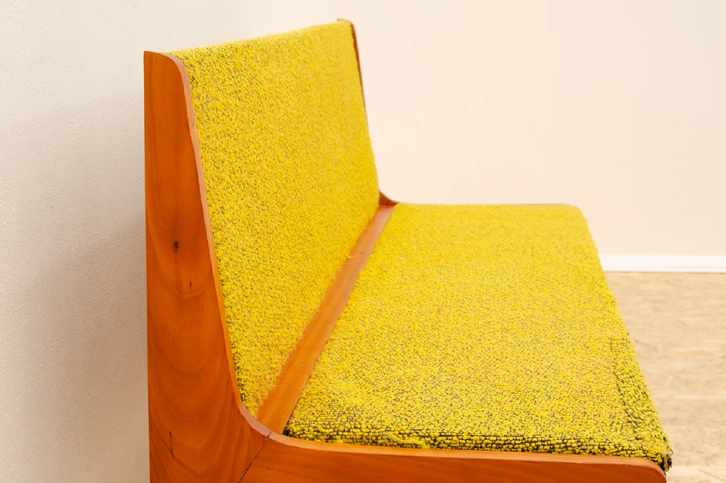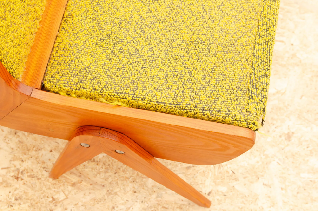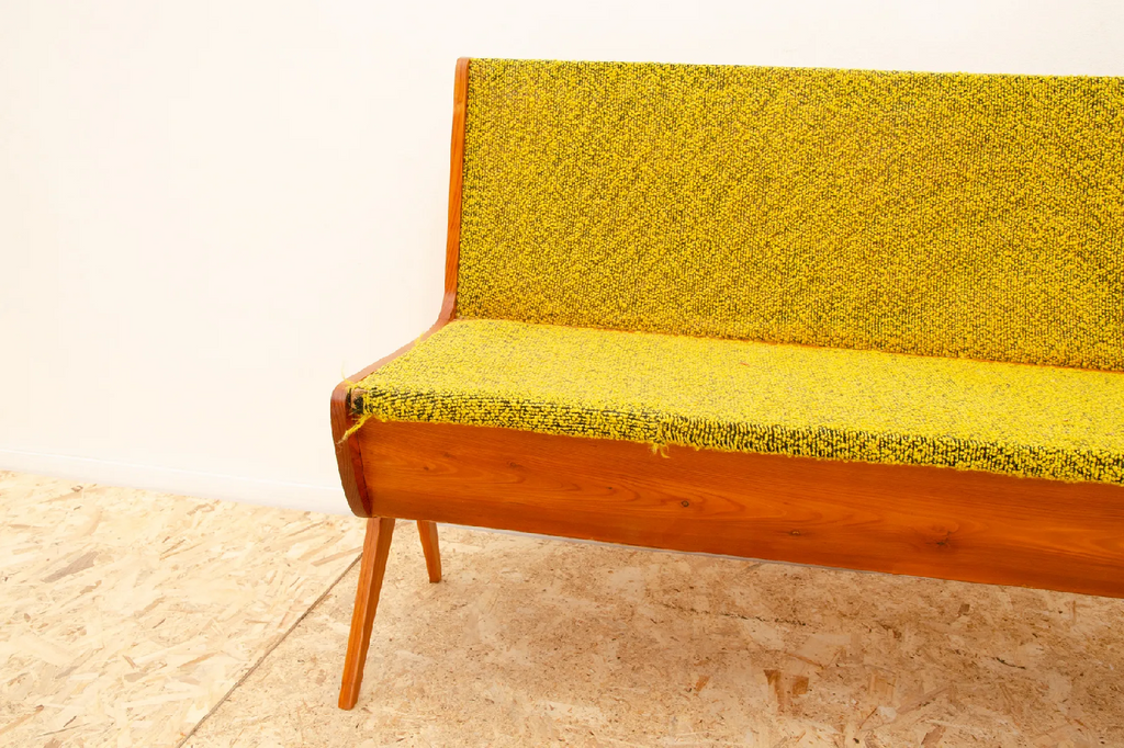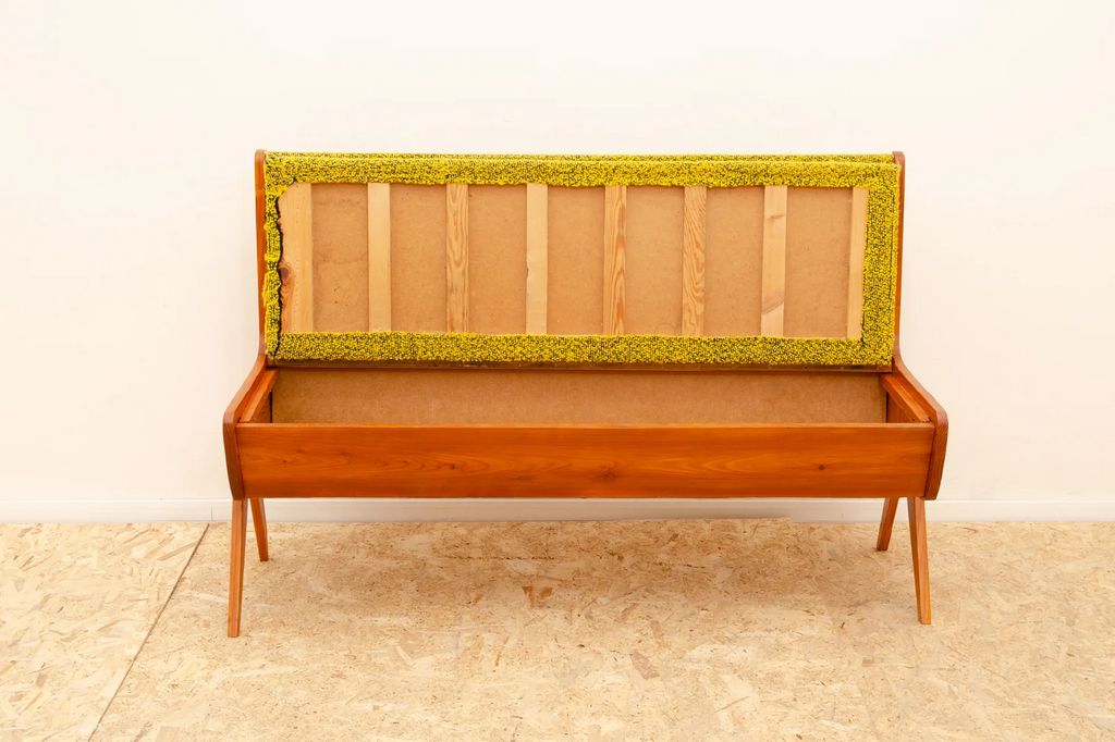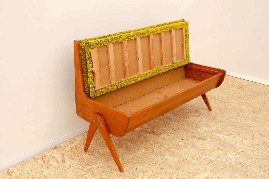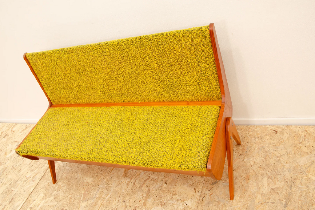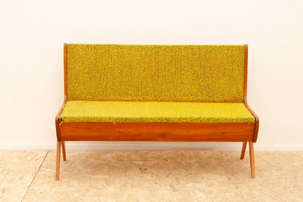 Très intéressant canapé/banc rembourré du milieu du siècle, fabriqué dans l'ancienne Tchécoslovaquie dans les années 1960. Matériaux : hêtre et tissu. Il dispose d'un espace de rangement. Le canapé est en très bon état vintage, présentant de légers signes d'usure.