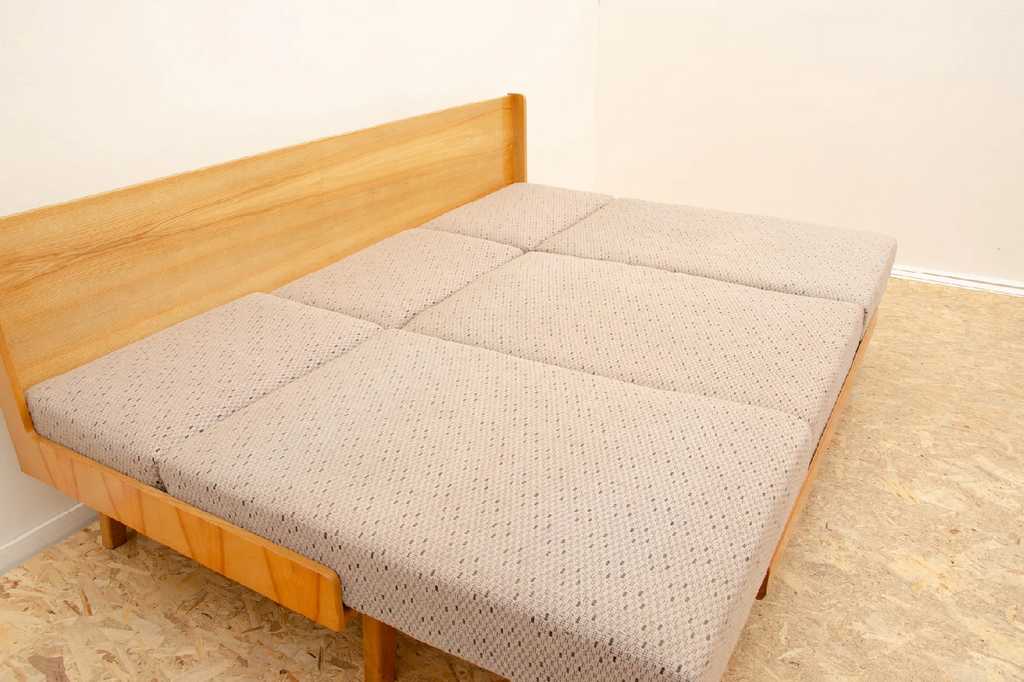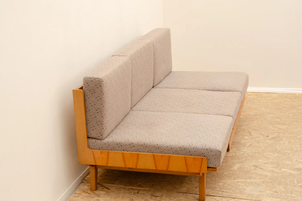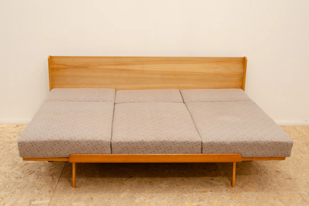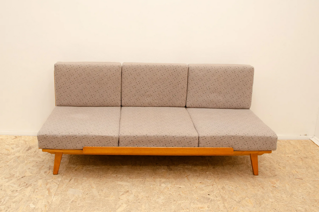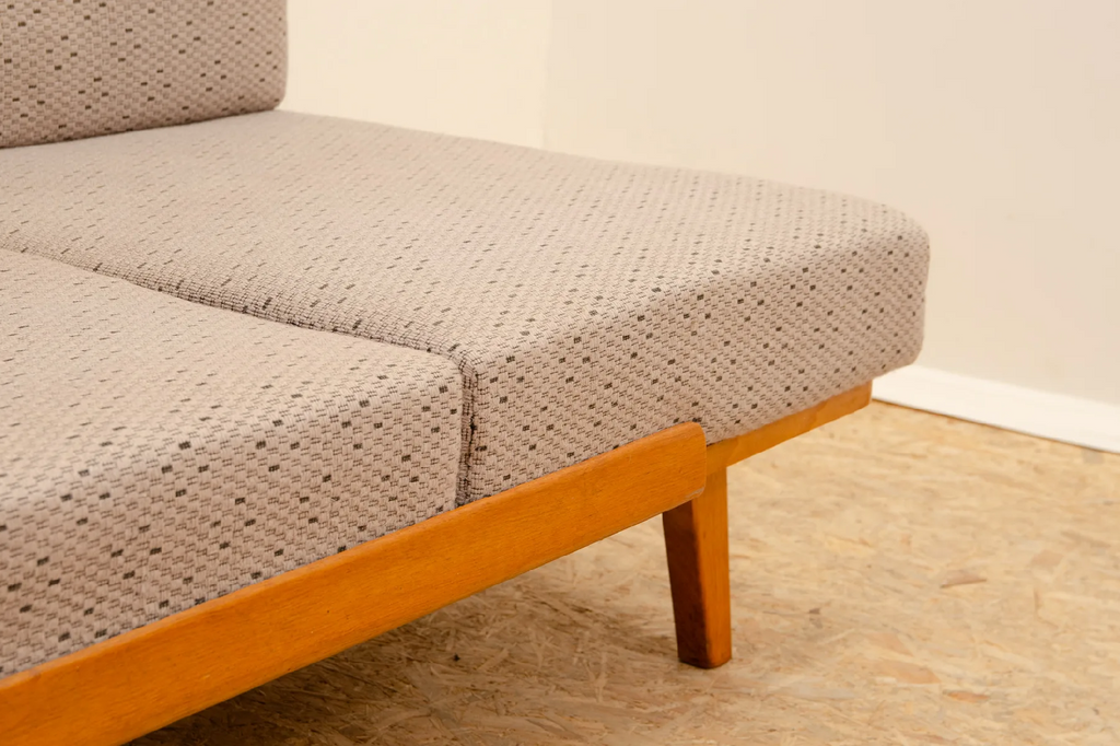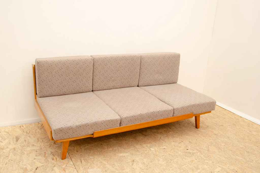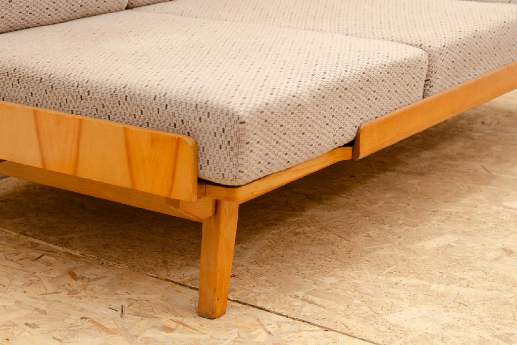 Canapé-lit du milieu du siècle, fabriqué dans l'ancienne Tchécoslovaquie dans les années 1970. Le canapé a une structure en bois de hêtre, il est en très bon état vintage, montrant de légers signes de vieillissement et d'utilisation.