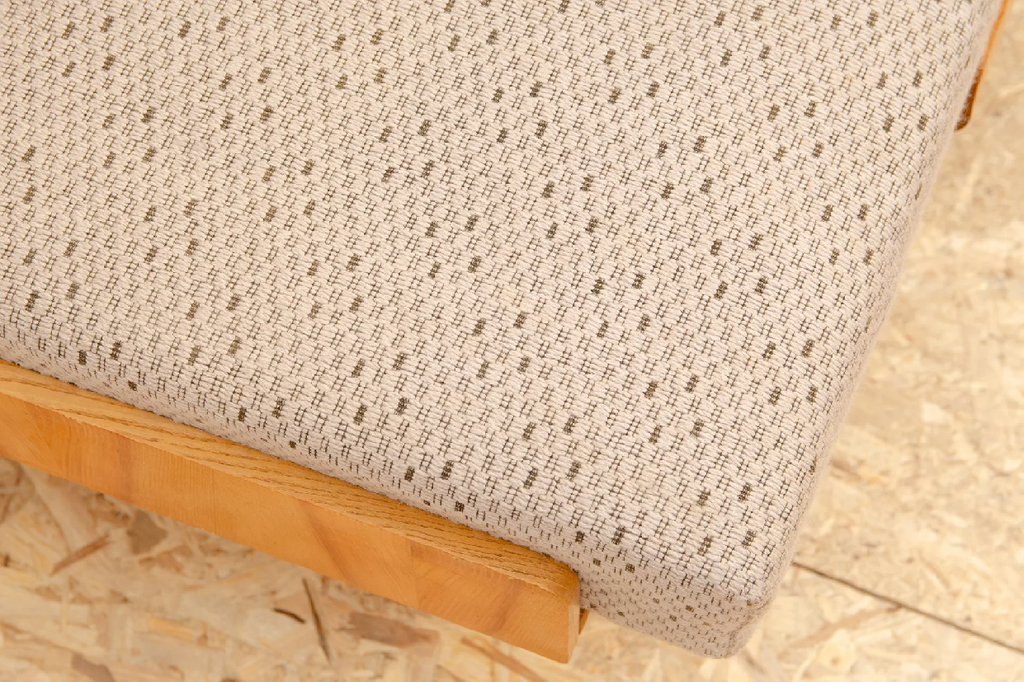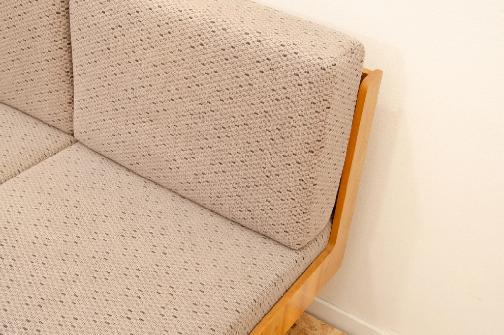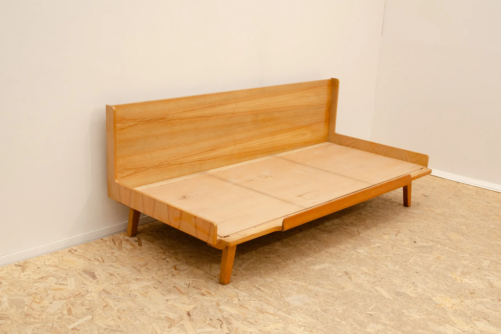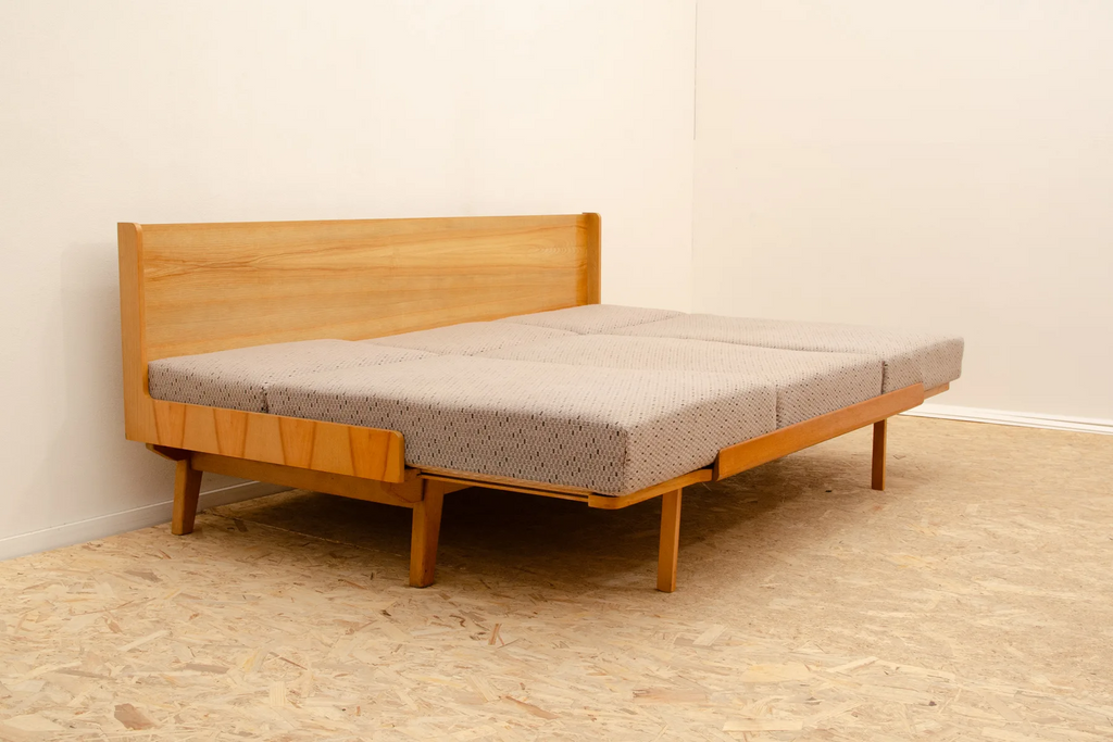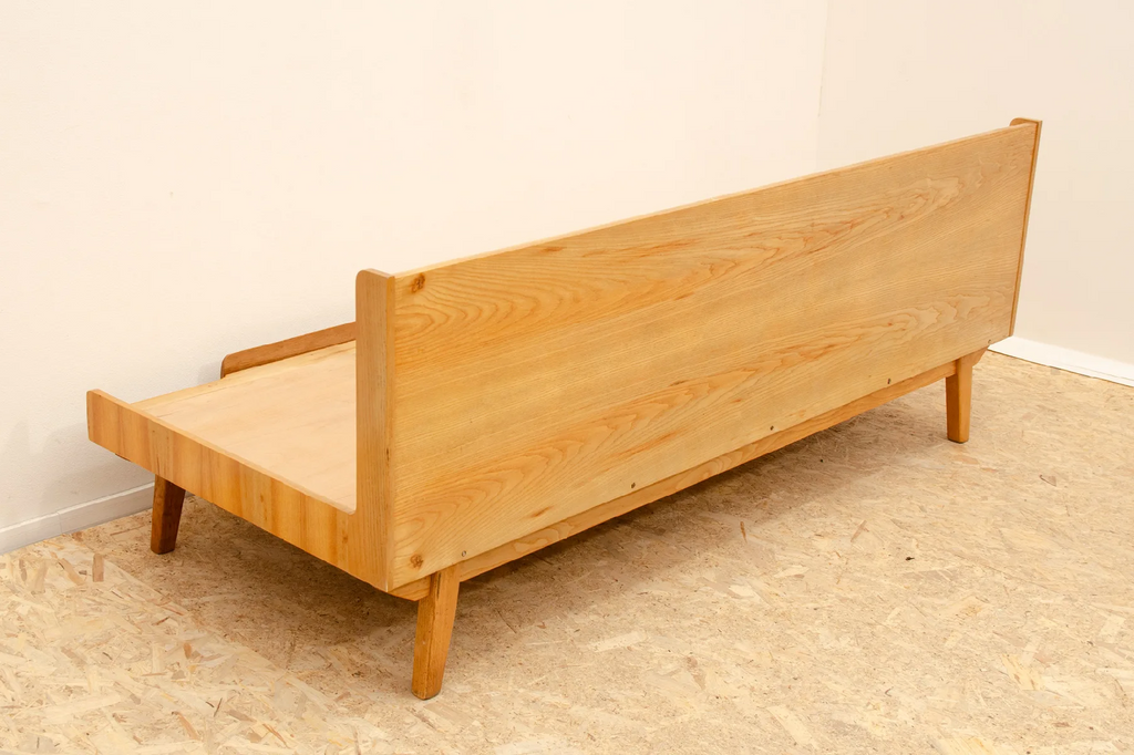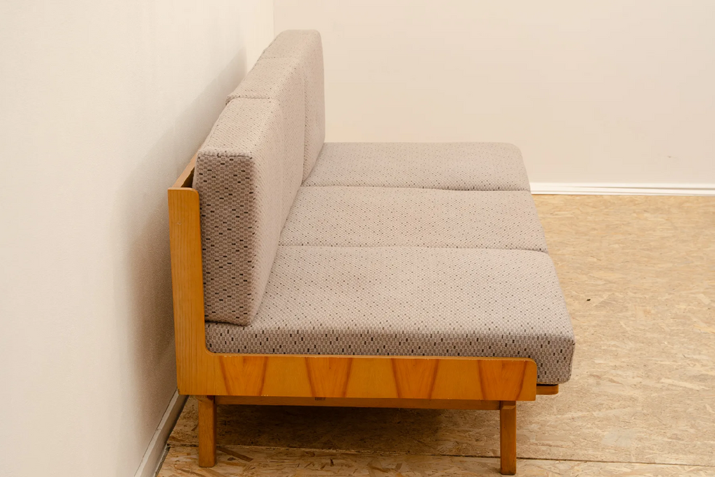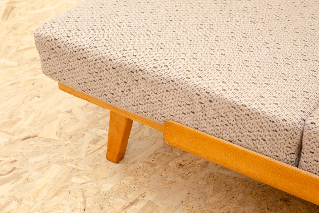 Canapé-lit du milieu du siècle, fabriqué dans l'ancienne Tchécoslovaquie dans les années 1970. Le canapé a une structure en bois de hêtre, il est en très bon état vintage, montrant de légers signes de vieillissement et d'utilisation.