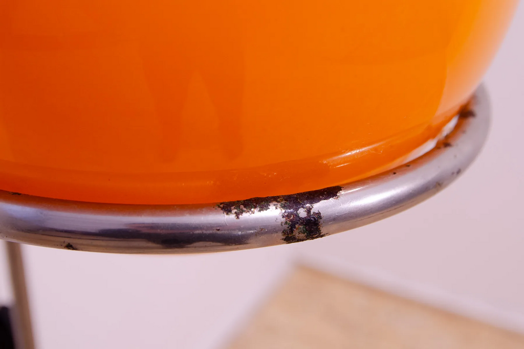 Ce lampadaire chromé a été conçu et fabriqué dans l'ancienne Tchécoslovaquie dans les années 1930. Il est en acier chromé avec un abat-jour en verre laiteux. Sa forme épurée évoque l'époque du Bauhaus, époque où les formes minimalistes ont fait leur entrée dans les arts appliqués. Allumée, la lampe diffuse une agréable lumière. Entièrement fonctionnelle, elle est équipée d'un câblage neuf en bon état d'origine. Le chrome présente de légères traces d'usure. Hauteur : 177 cm, largeur : 40 cm, profondeur : 40 cm, diamètre de la sphère : 25 cm.