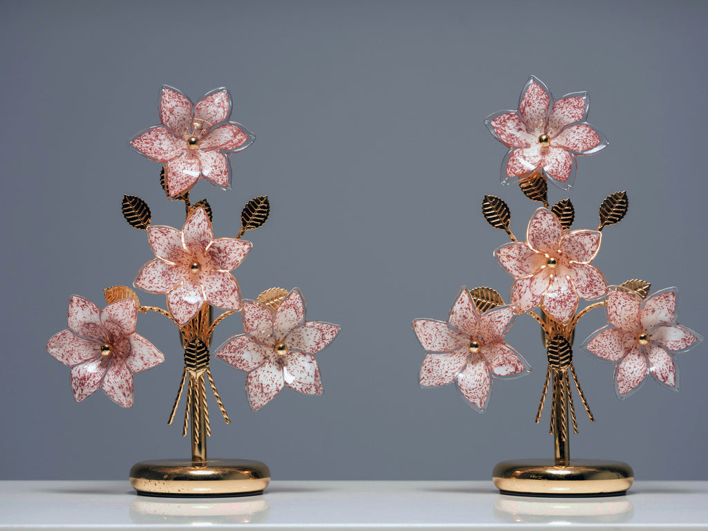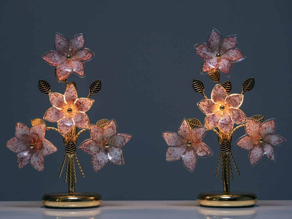 Each piece is crafted from metal and glass, with well-formed flowers that create a soft decorative rhythm when illuminated. The surfaces are preserved in undamaged vintage condition, maintaining the clarity of the glass and stability of the metal frames.