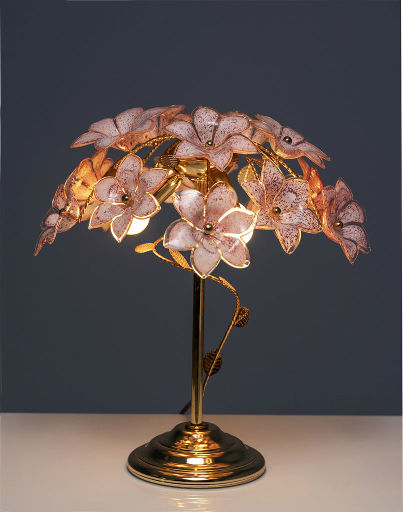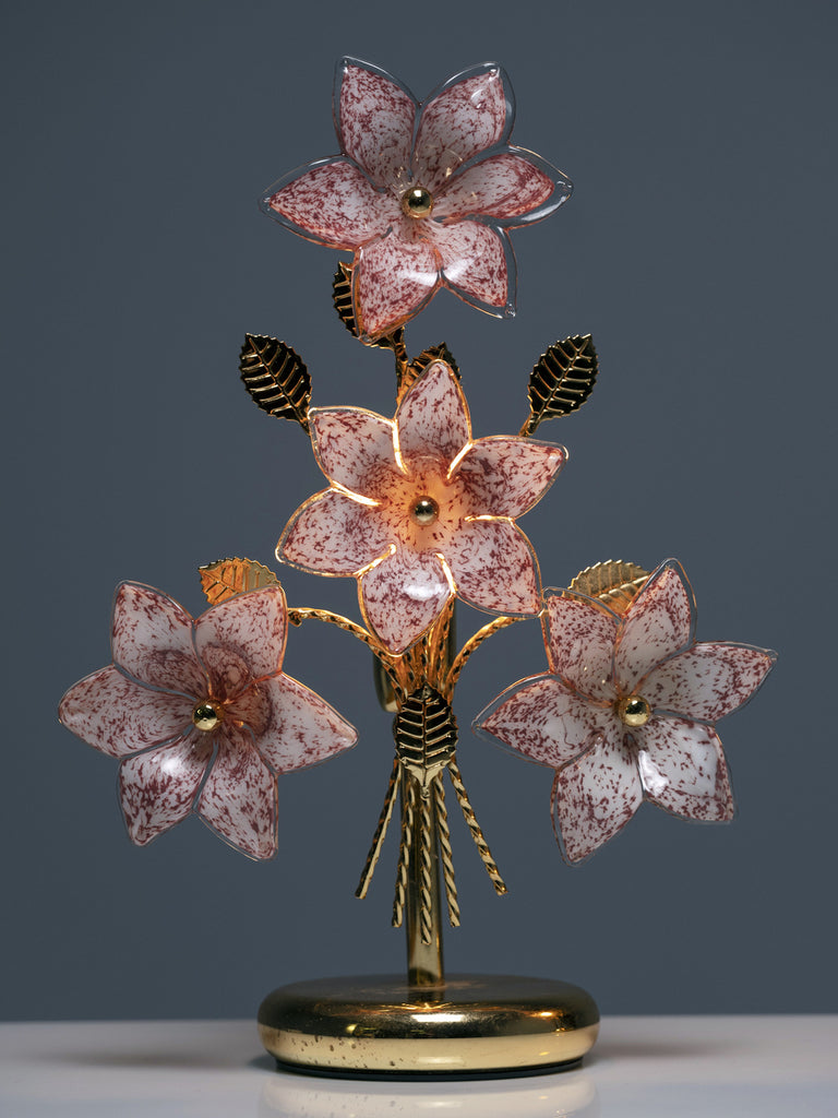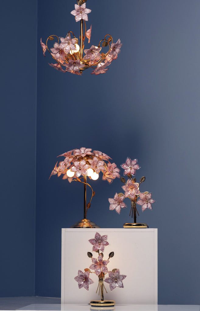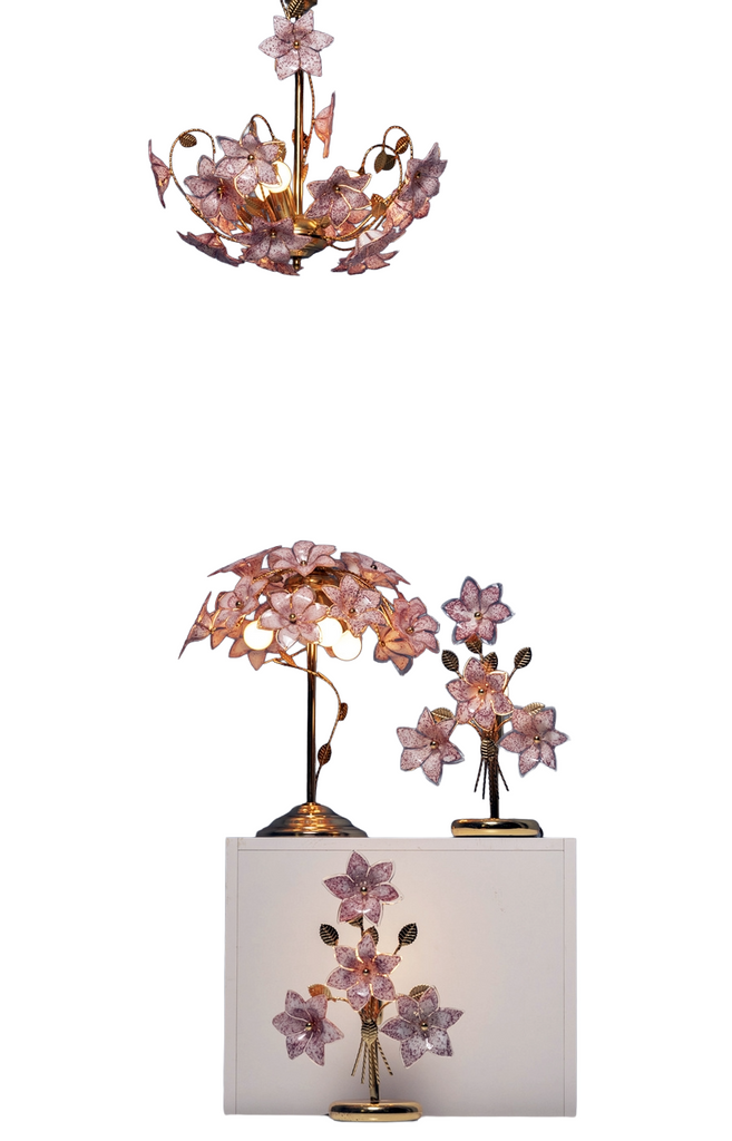 This four-piece Italian lighting set features a distinctive floral composition of glass blossoms and metal stems, produced between the 1990s and early 2000s. The collection includes a pair of bedside lamps, a larger table lamp, and a coordinating chandelier, all sharing the same sculptural “bouquet” motif.