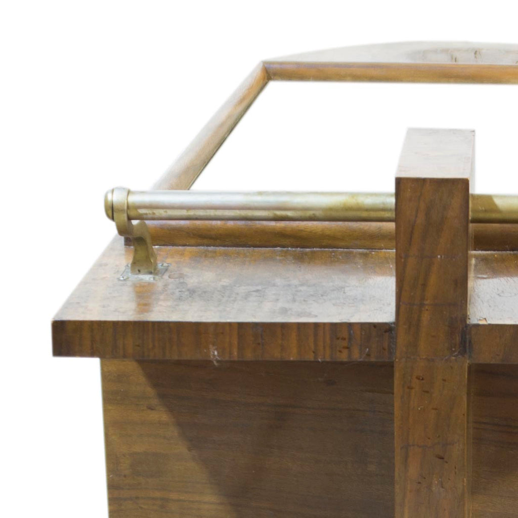 Luxury glazed serving trolley, Bauhaus period. Walnut veneer. The front part housing a smaller wheel, the rear part housing larger wheels. Overall good condition, water damage to the top veneer, (see photo). Chrome handles, glass shelves and sliding glass doors. Visible signs of use and age. Beautiful example of European functionalism.
