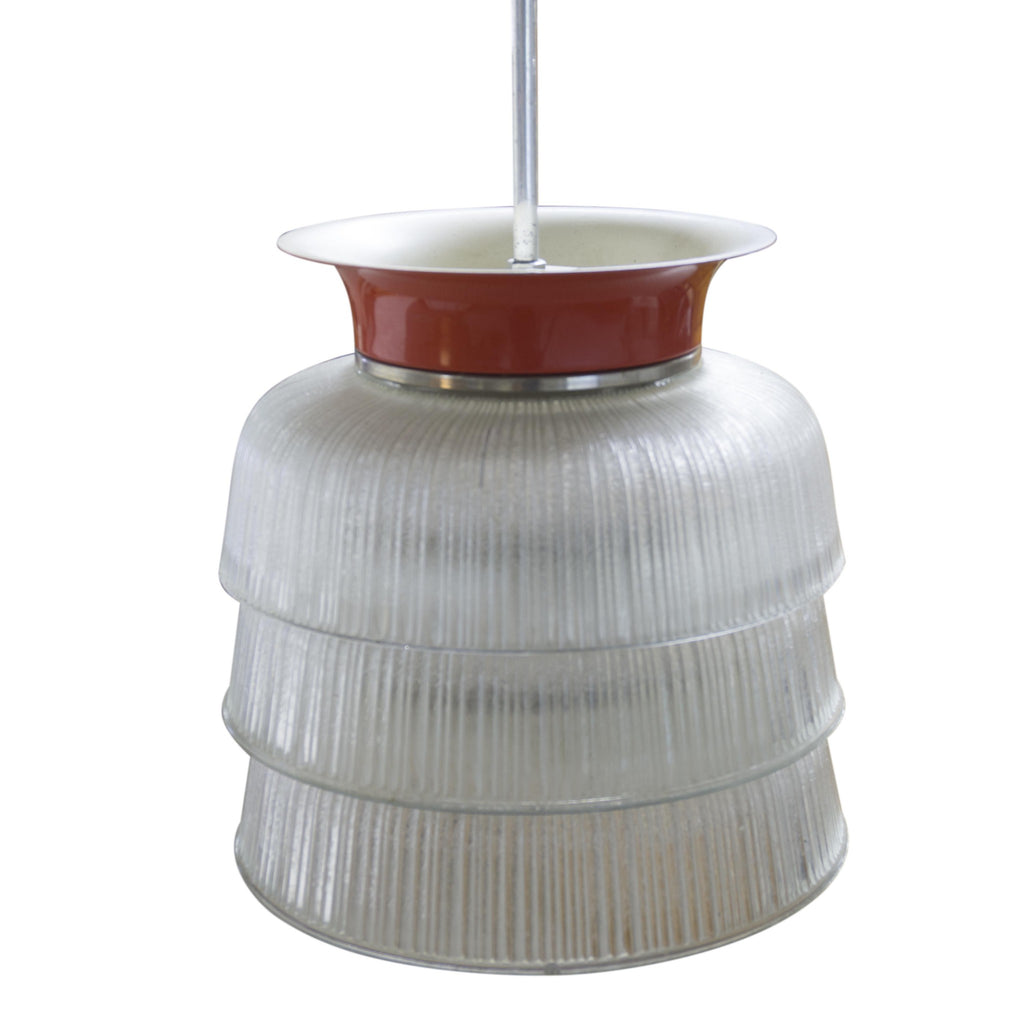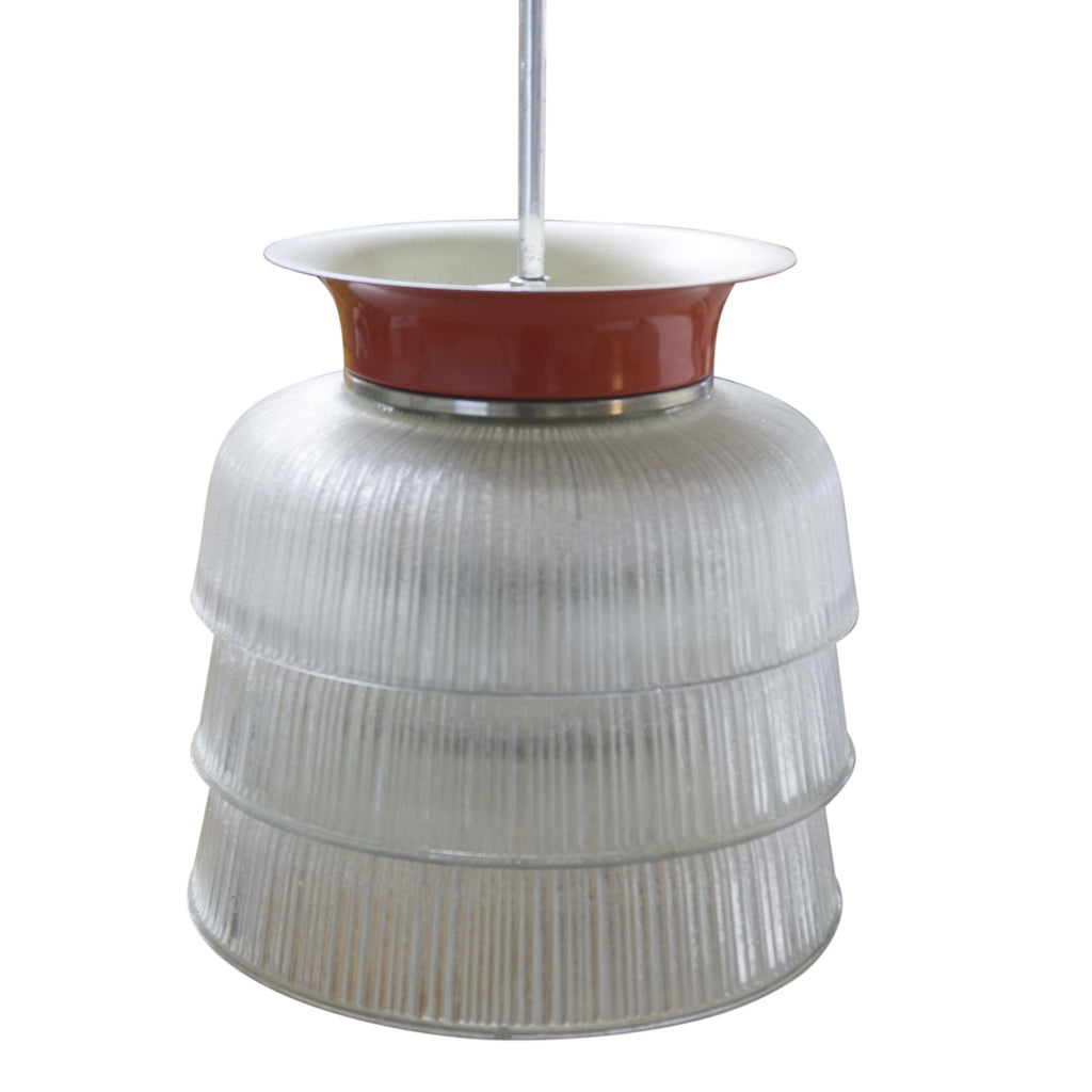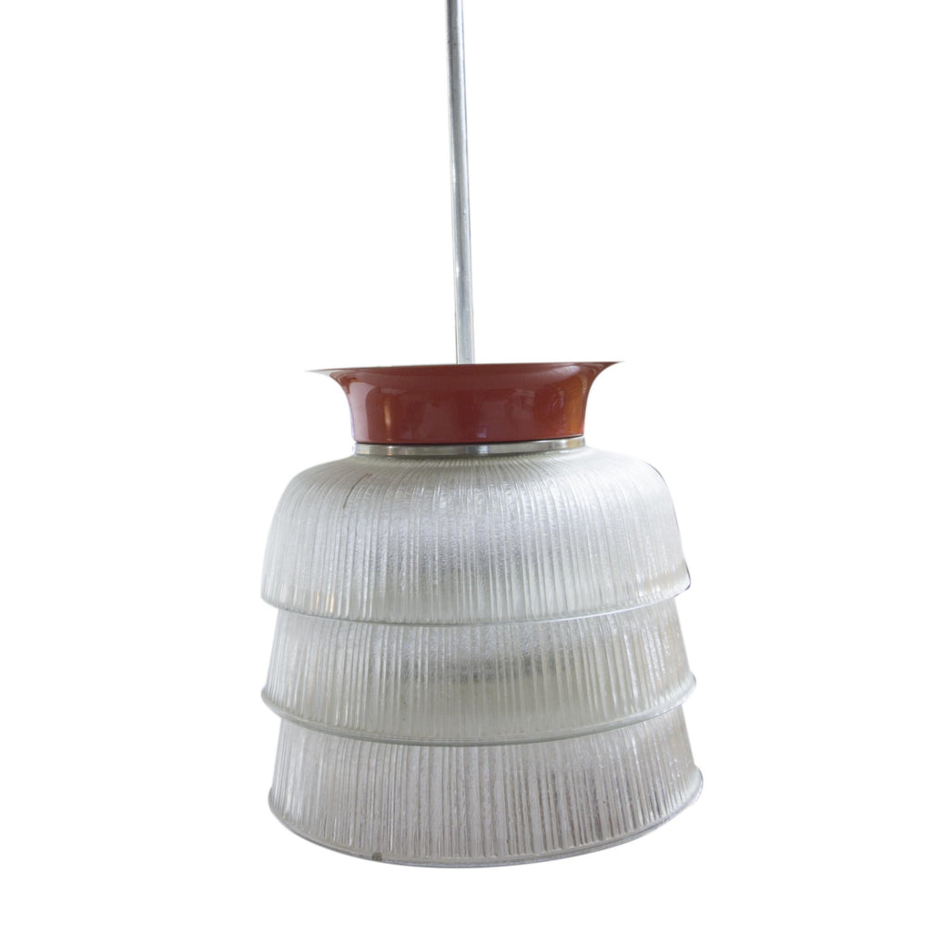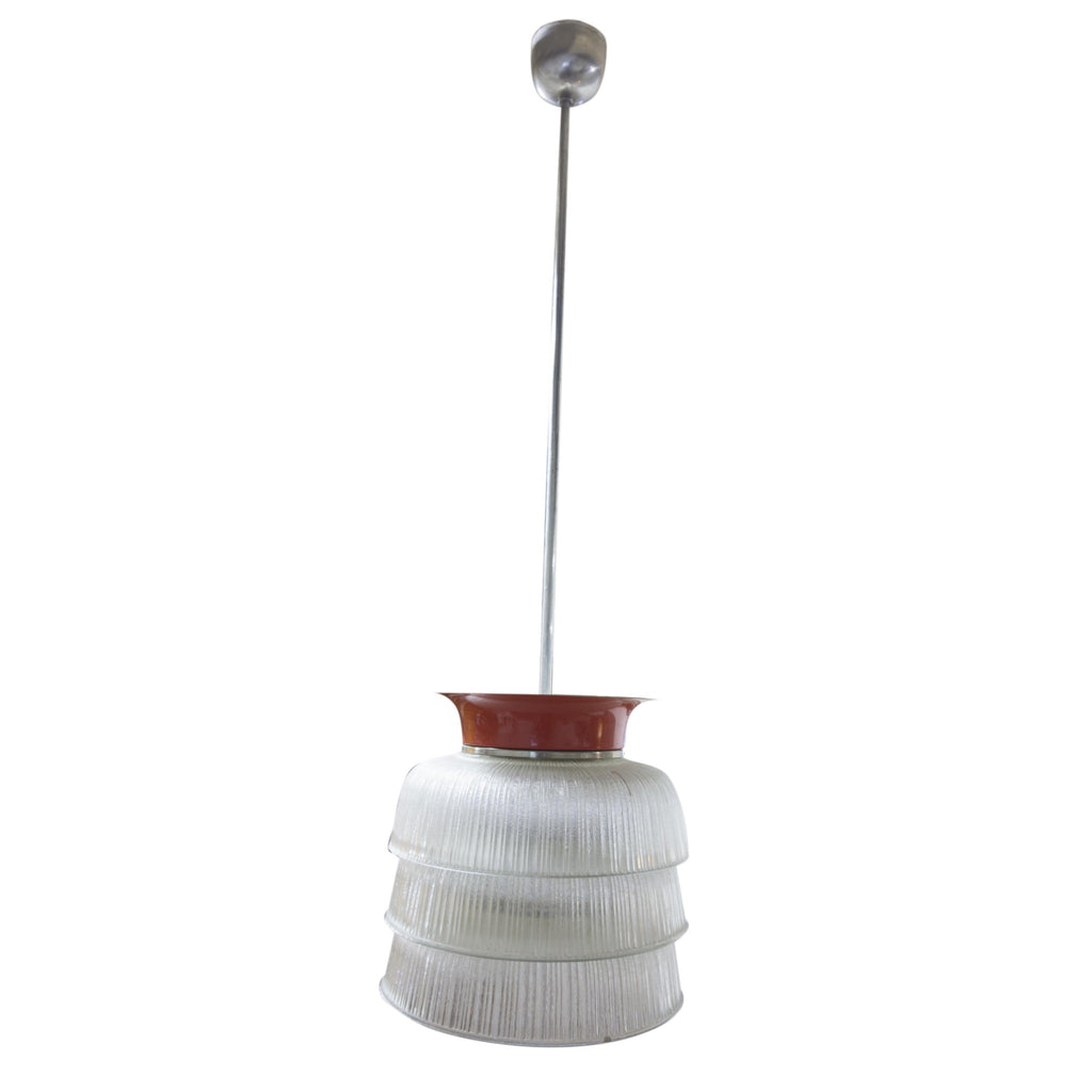 Vintage hanging chandelier, made in the 60s, Middle Europe. The chandelier is suspended on chrome rod. It consists of a three-storey glass lampshade. Material: cut glass and sheet metal. Preserved condition. Electricity original.
