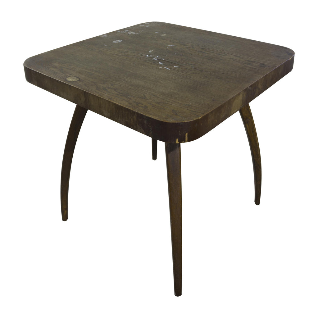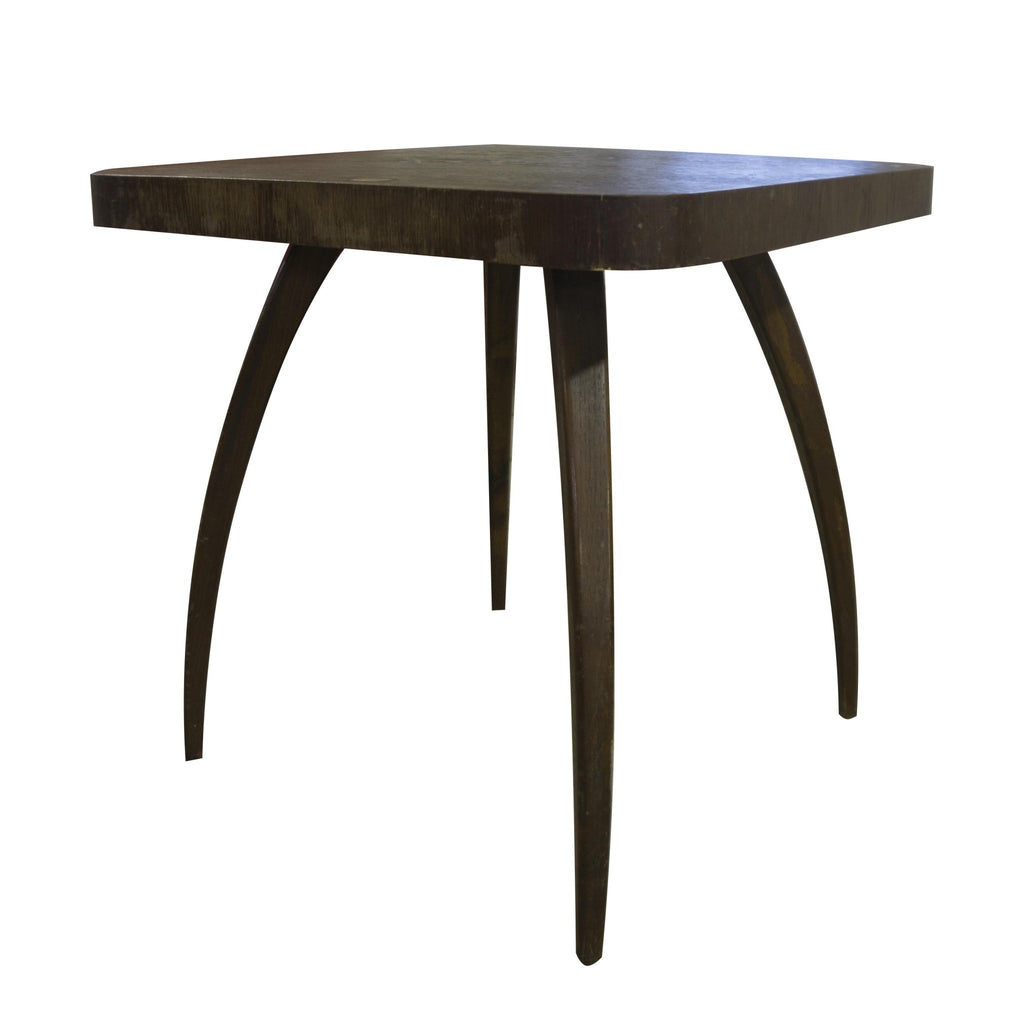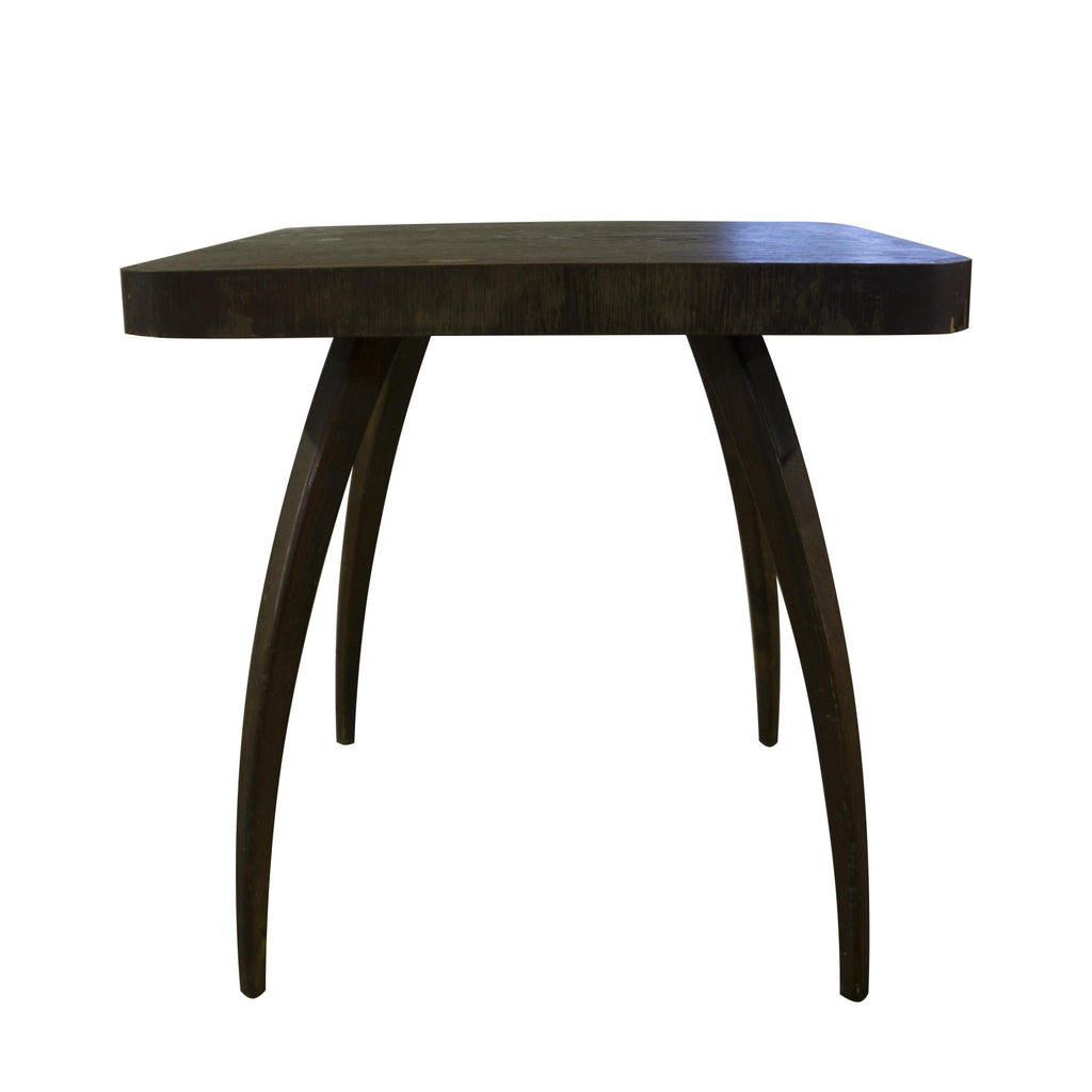 Square coffee table in the shape of spider designed by Jindřich Halabala, produced UP Závody, with distinctive curved legs, rounded corners. Construction of the table in very good condition. Stained oak. The surface of tabletop slightly damaged in a few places. Small cleaved of veneer. See photos.