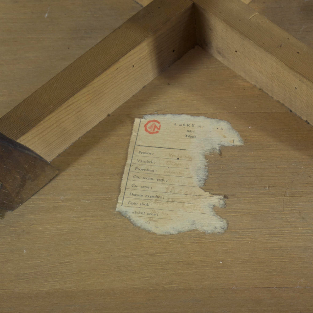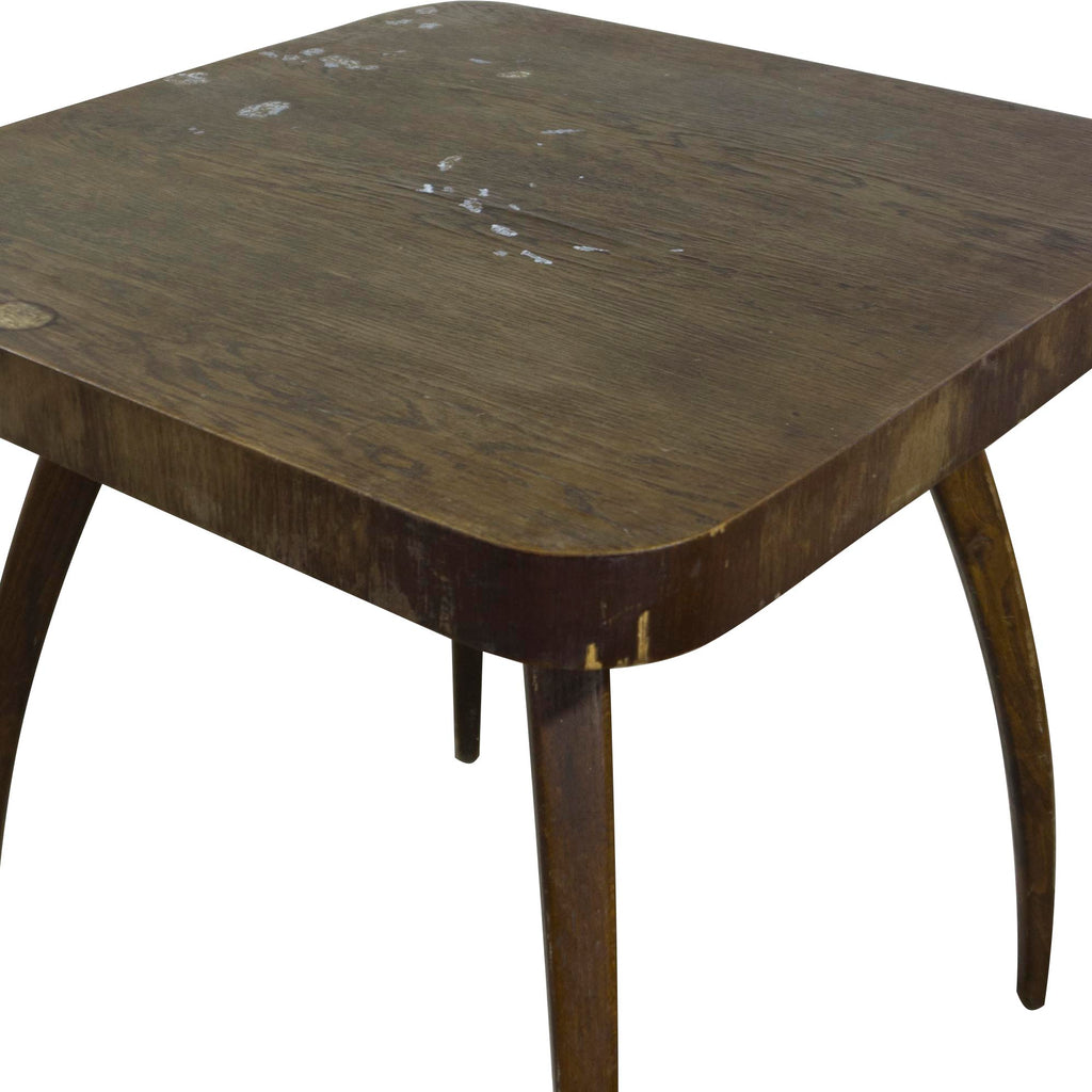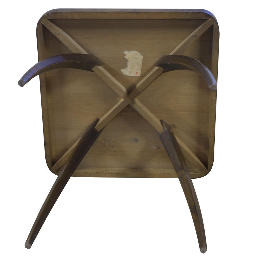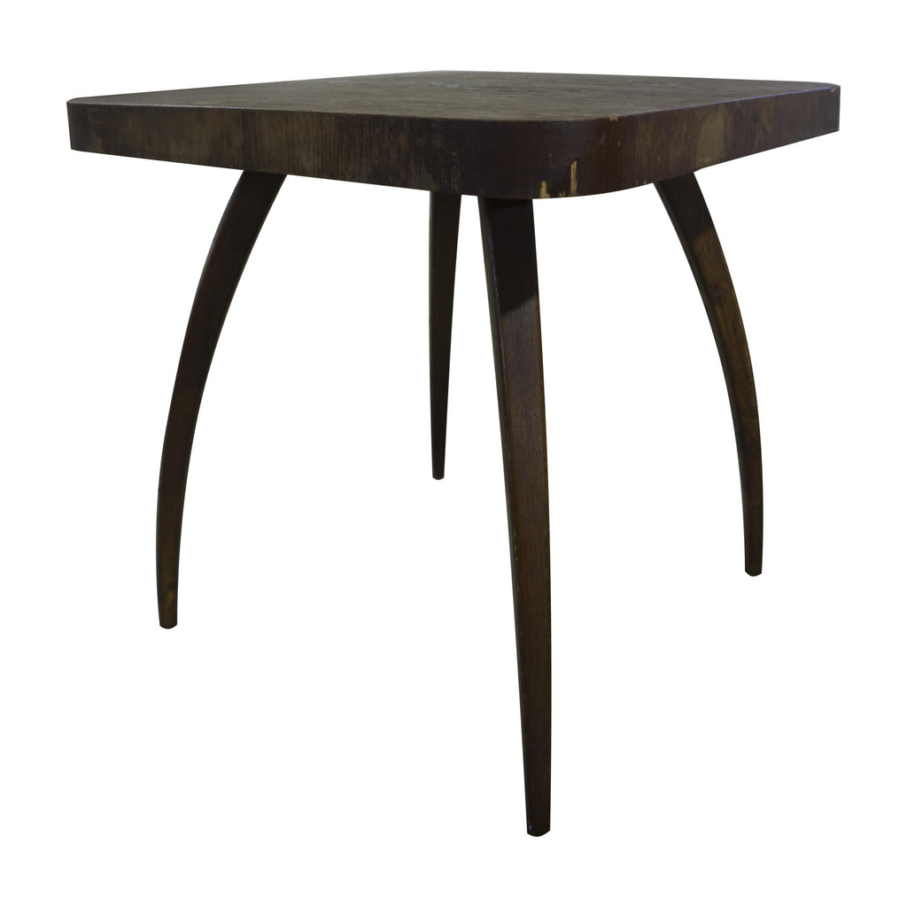 Square coffee table in the shape of spider designed by Jindřich Halabala, produced UP Závody, with distinctive curved legs, rounded corners. Construction of the table in very good condition. Stained oak. The surface of tabletop slightly damaged in a few places. Small cleaved of veneer. See photos.