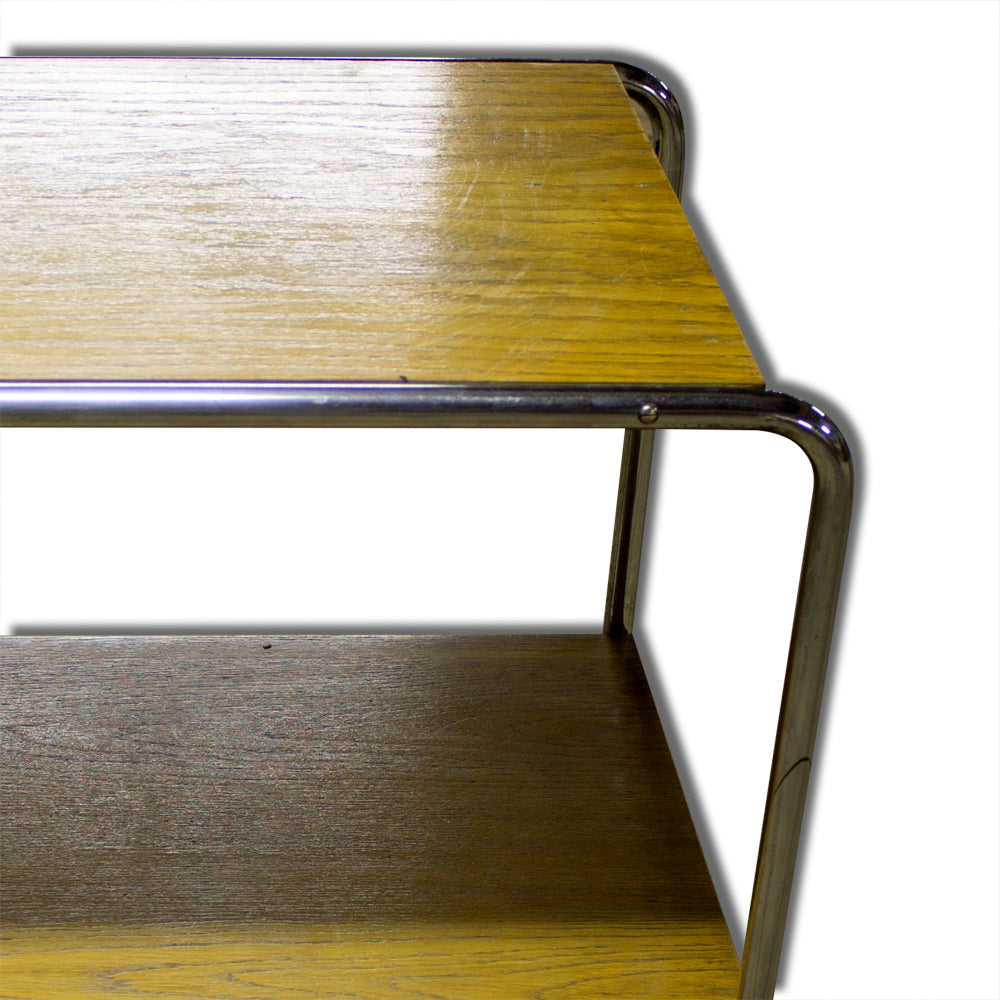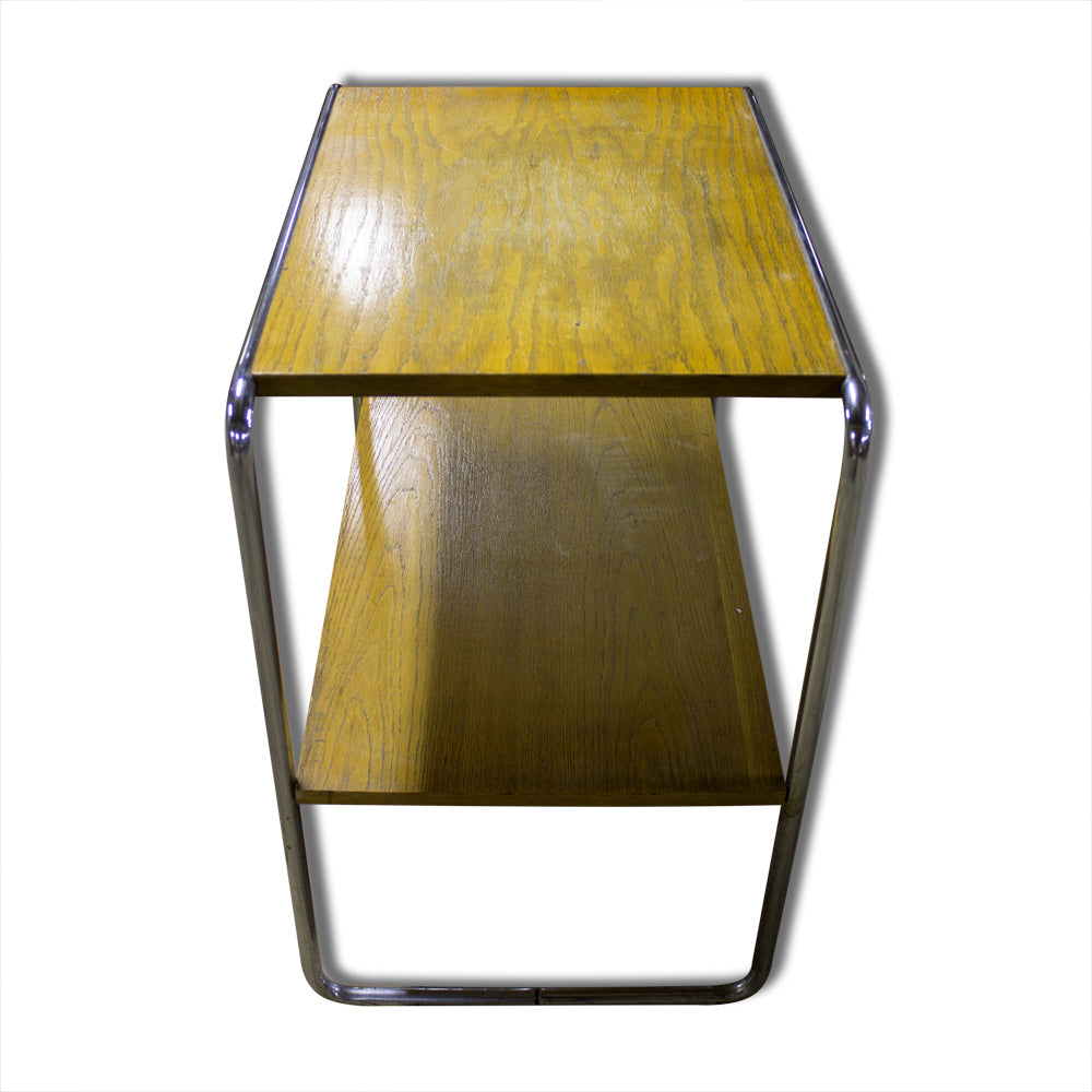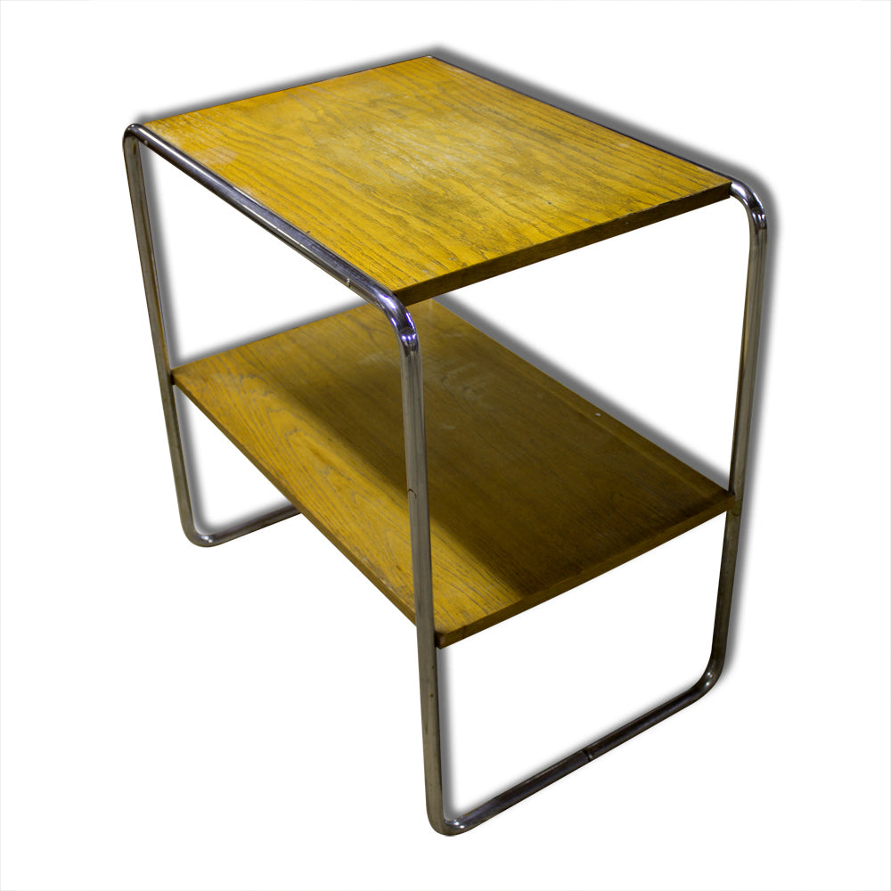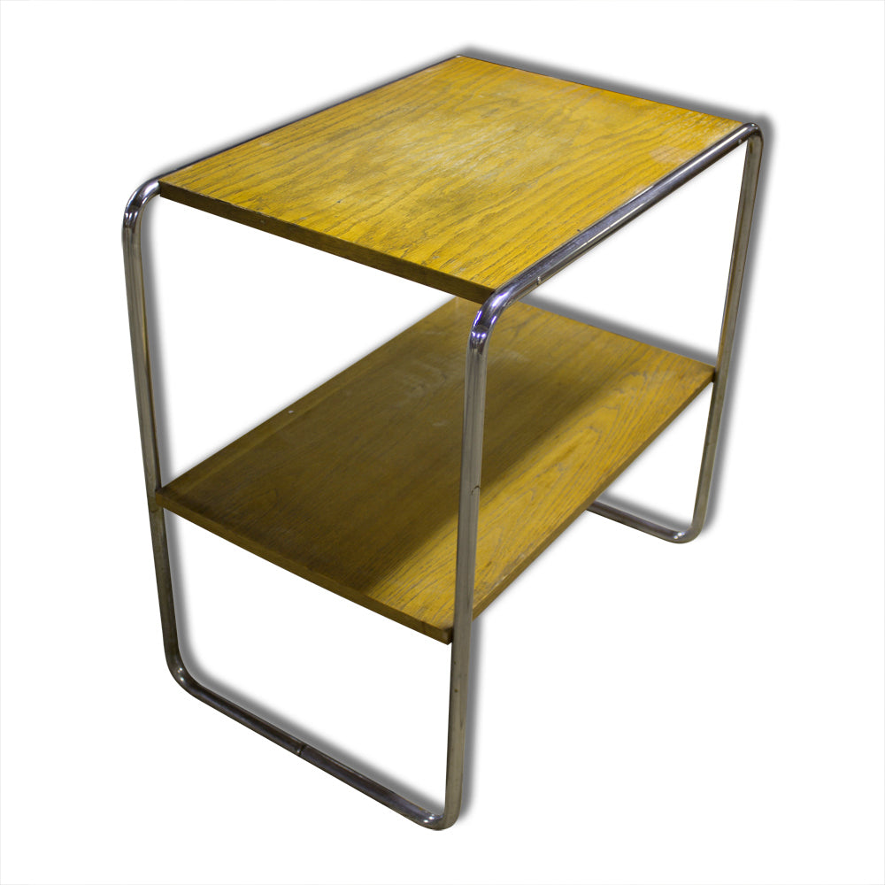 Chromium plated side table in the manner of Breuer B-12 side table, made in Bohemia, 1930´s, period Bauhaus, manufactured probably by Mücke & Melder. Chromium-plated base metal, beech wood table plates, in very good original Vintage condition. For detailed image please use the magnifying glass on photos.