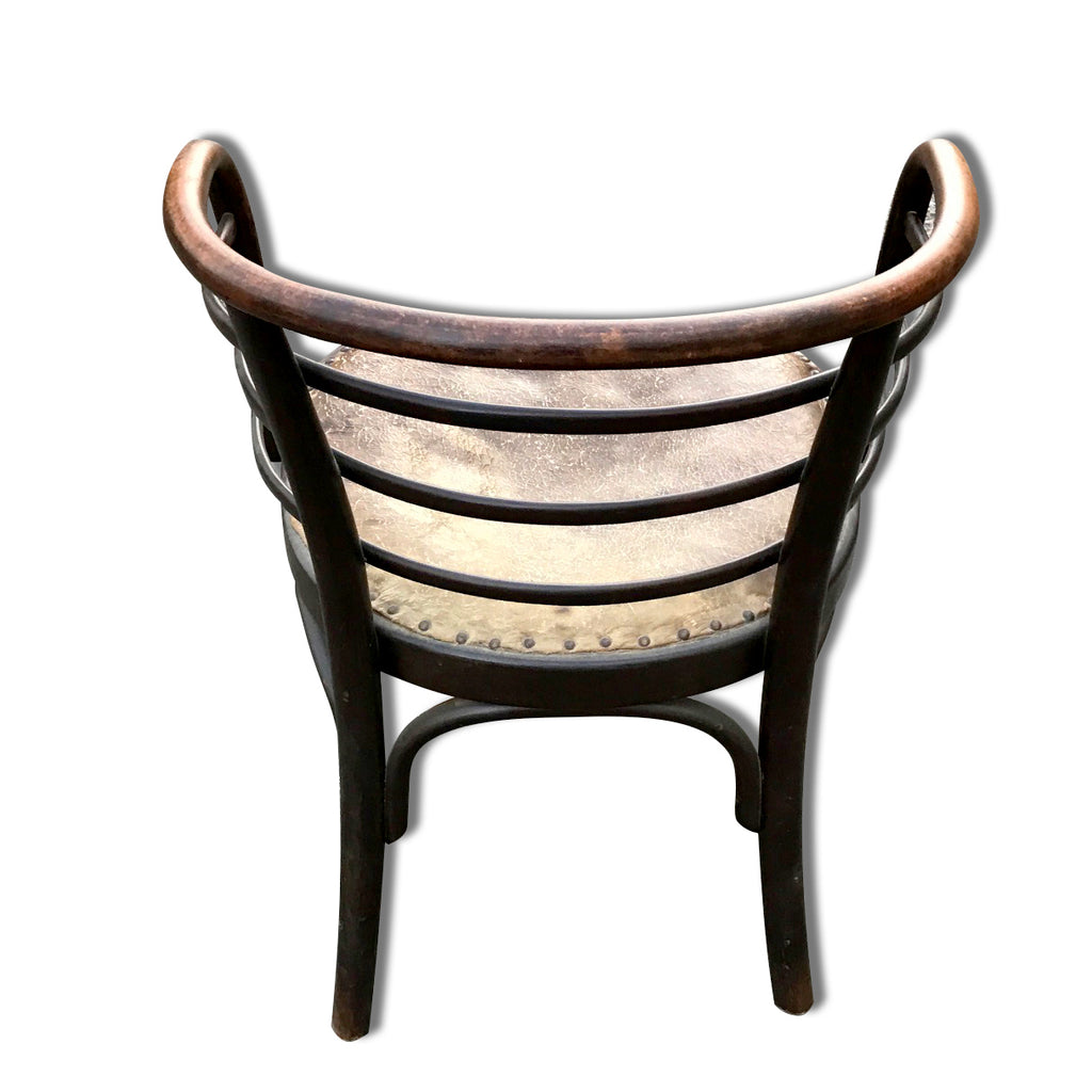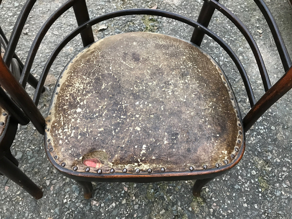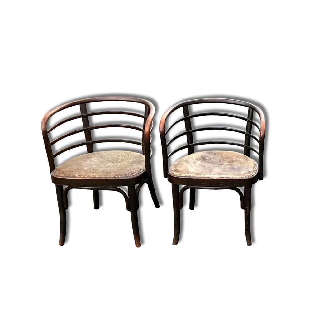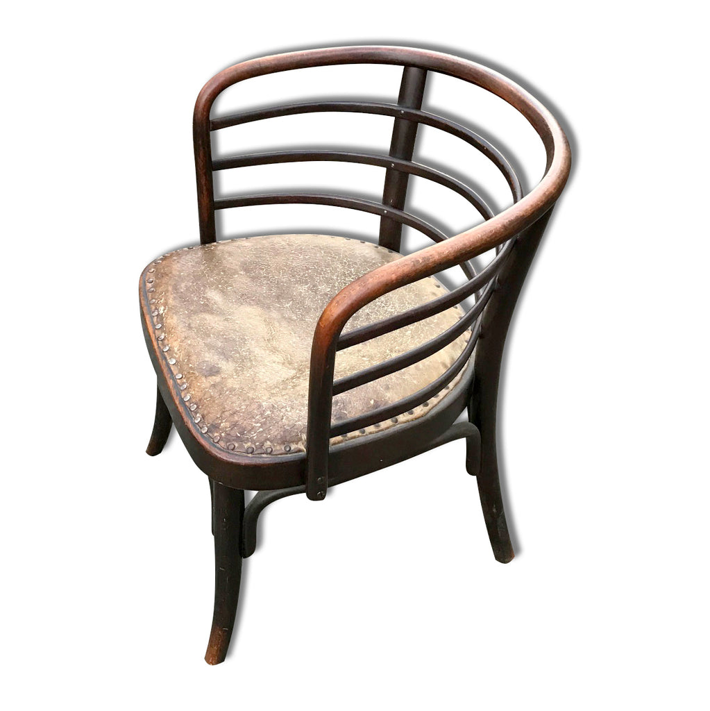 These chairs are really occuring seldom currently. It was designed by Josef Frank and manufactured in Austria by Thonet company. Dark stained beech wood and bentwood construction, leather upholstery. Originally probably with a Pedigo strings which were probably replaced by. All the chairs are marked Thonet. Unusual and very interesting design of these chairs. The chairs are in a fair vintage condition with wear consistent with age and use. One chair has a smaller damage leather-look at the pictures.
