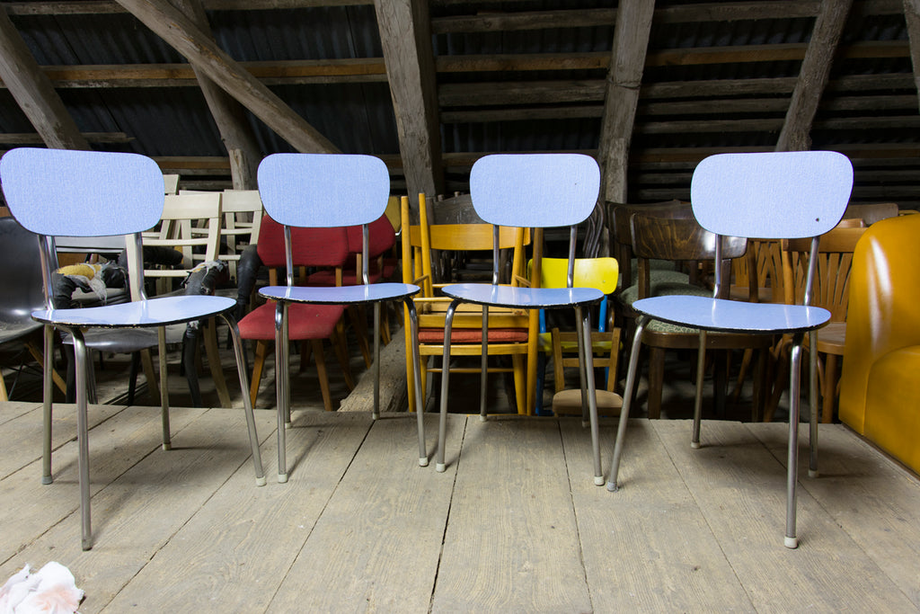 Mid century coloured formica cafe or dining chairs with chrome legs. Made in the 1960's. In good Vintage condition. Price is for the set of four.