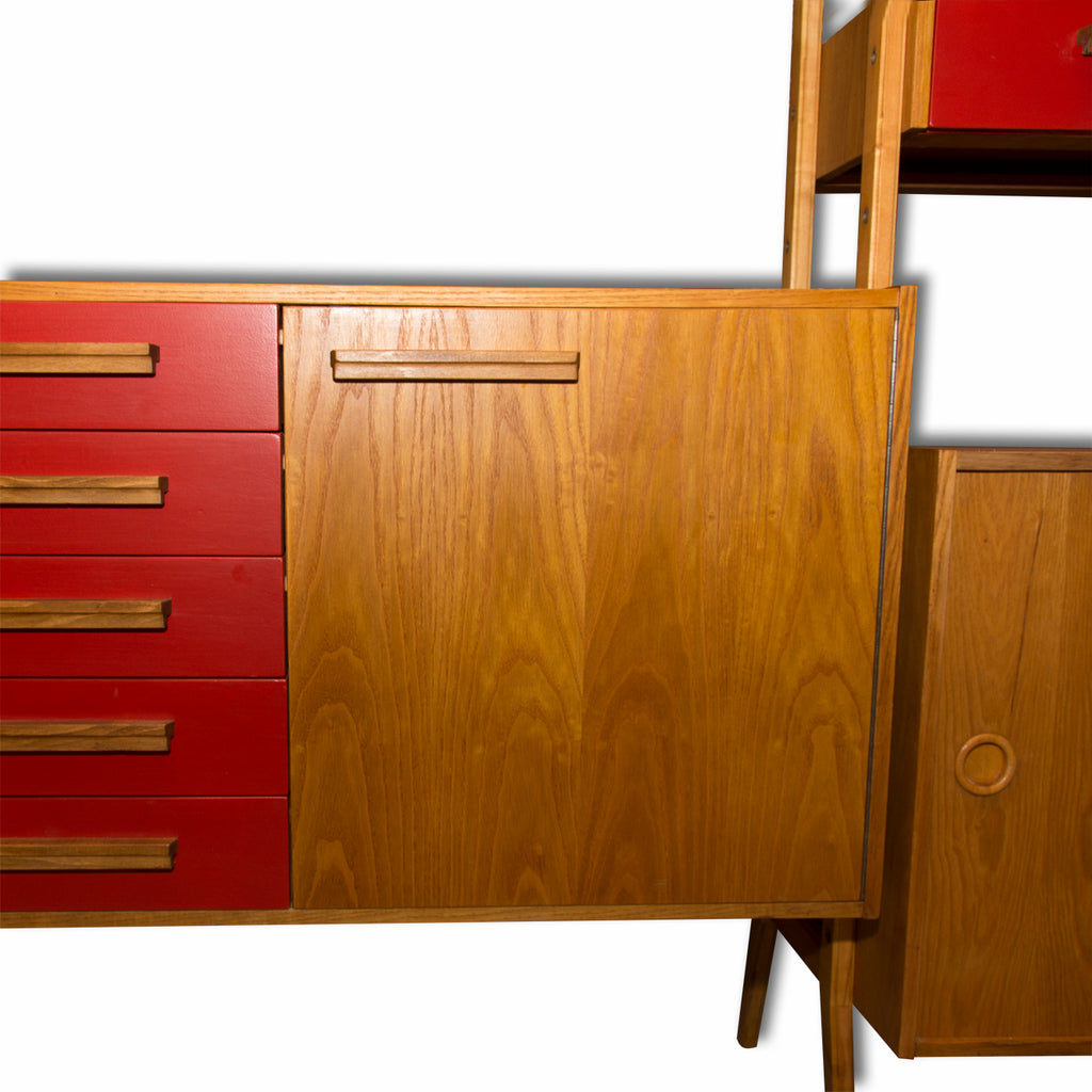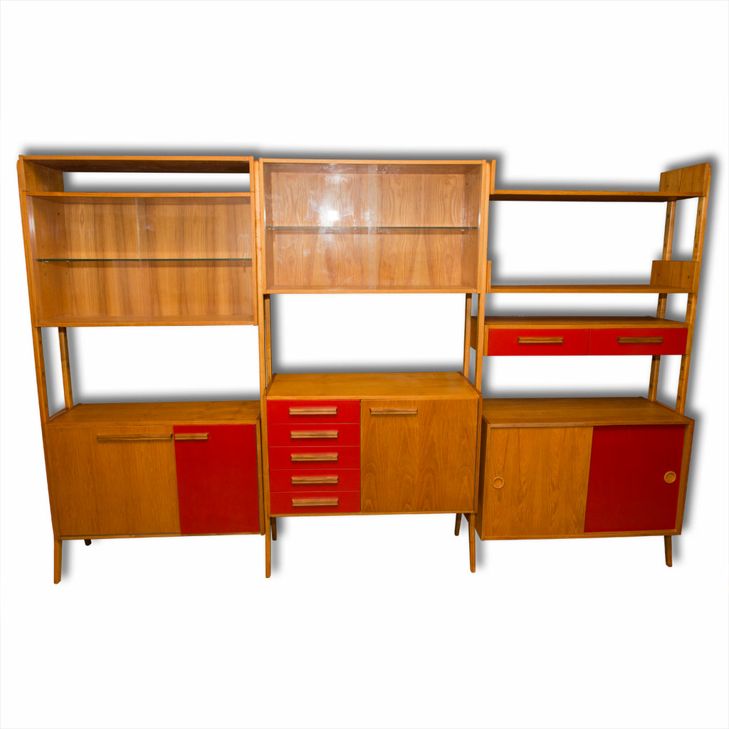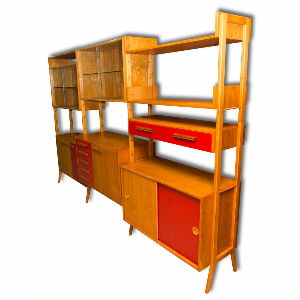 Mid Century Czechoslovak modernist beech unit shelf system by Frantisek Jirak for Tatra nabytok. Made in Czechoslovakia during the 1960´s. The system is made of beech wood and plywood and has a colorful parts. The unit is in excelent condition because of the refurbish.
