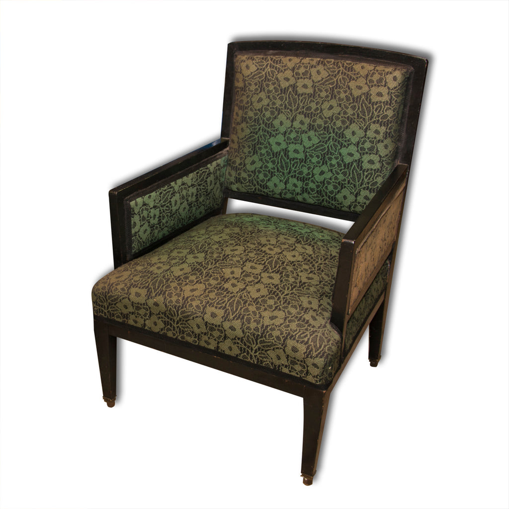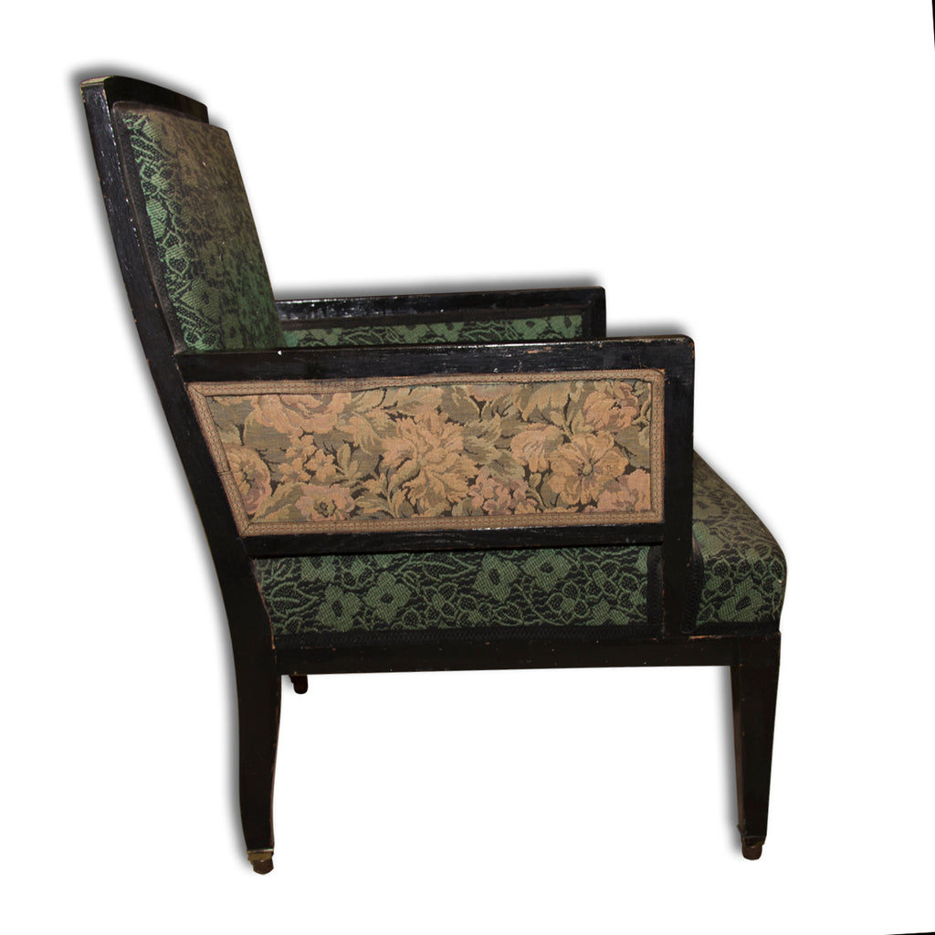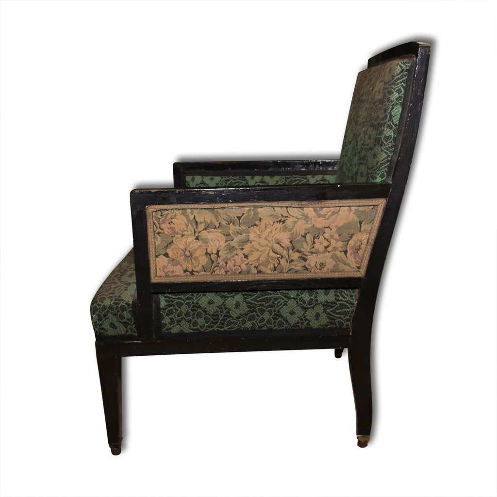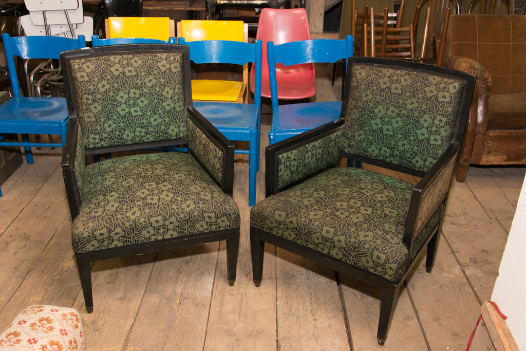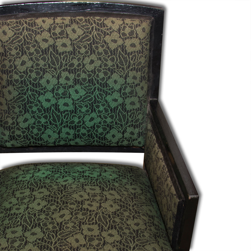 A pair of oak office armchairs, late secessionist, circa 1915. Austria-Hungary. Probably original upholstery with floral motifs, a black lacquered wood and metal ends of legs with wheels. Price is for the pair