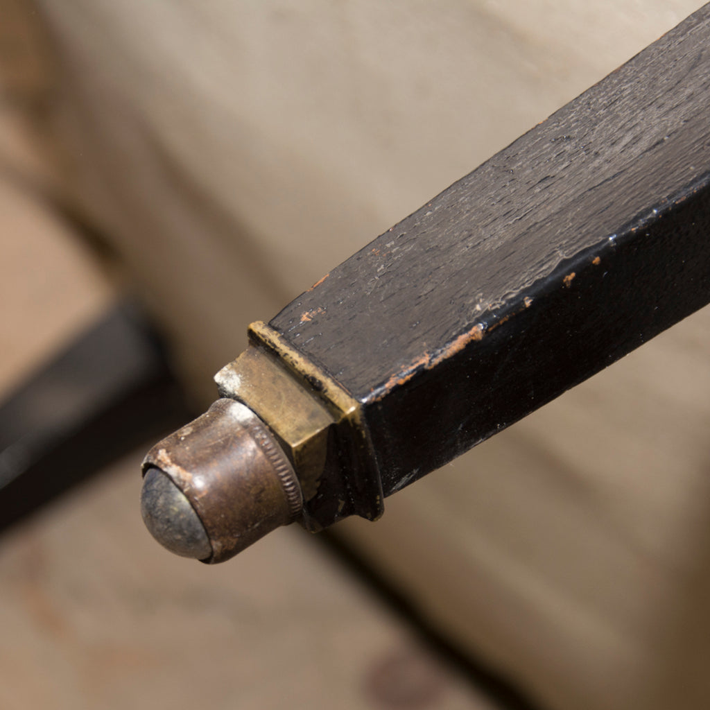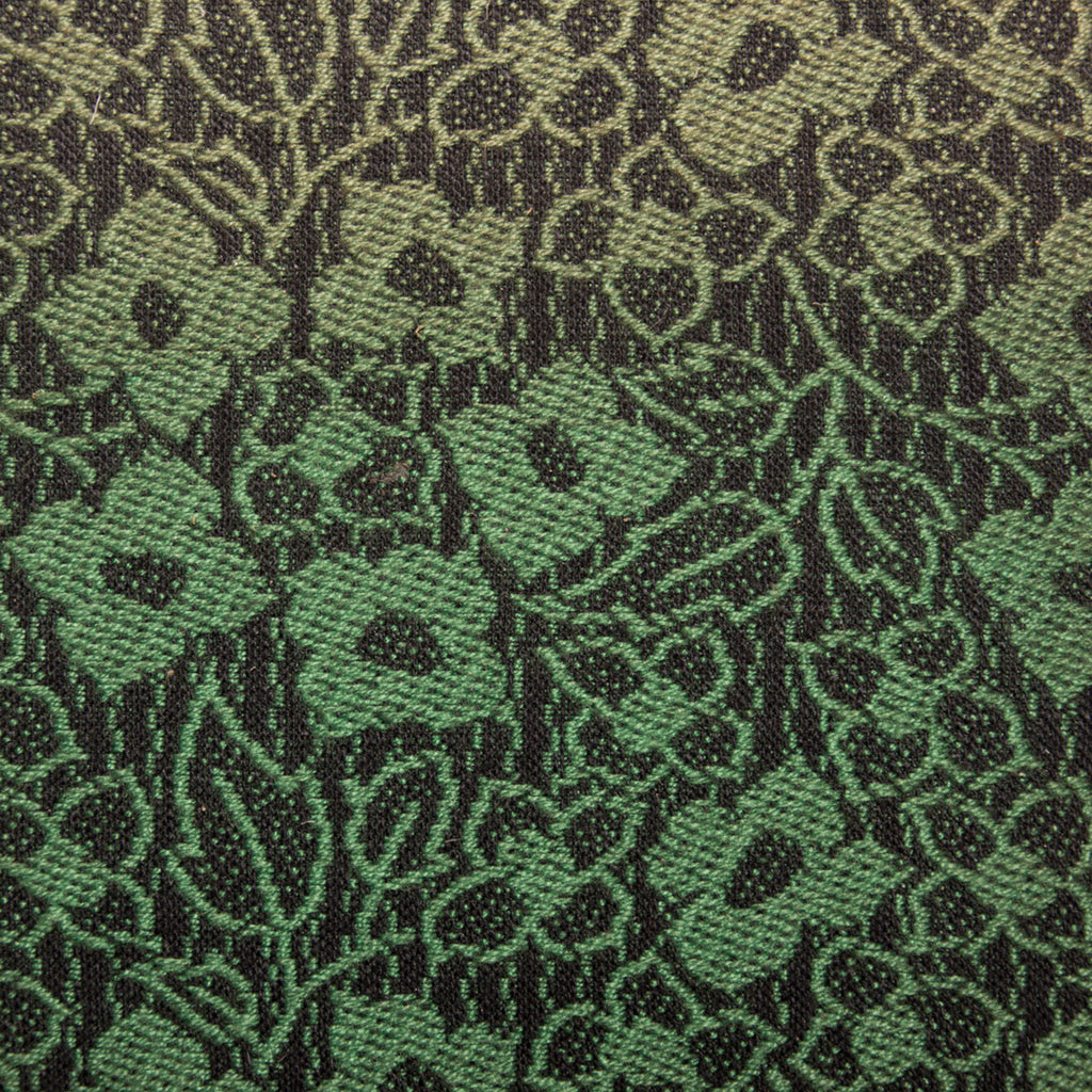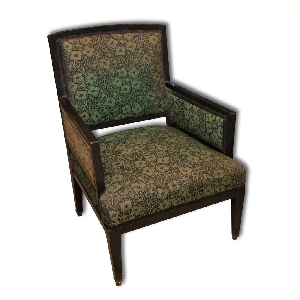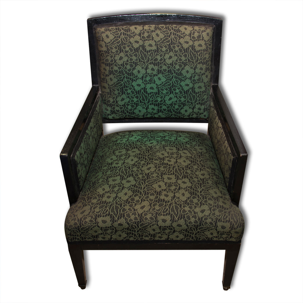 A pair of oak office armchairs, late secessionist, circa 1915. Austria-Hungary. Probably original upholstery with floral motifs, a black lacquered wood and metal ends of legs with wheels. Price is for the pair
