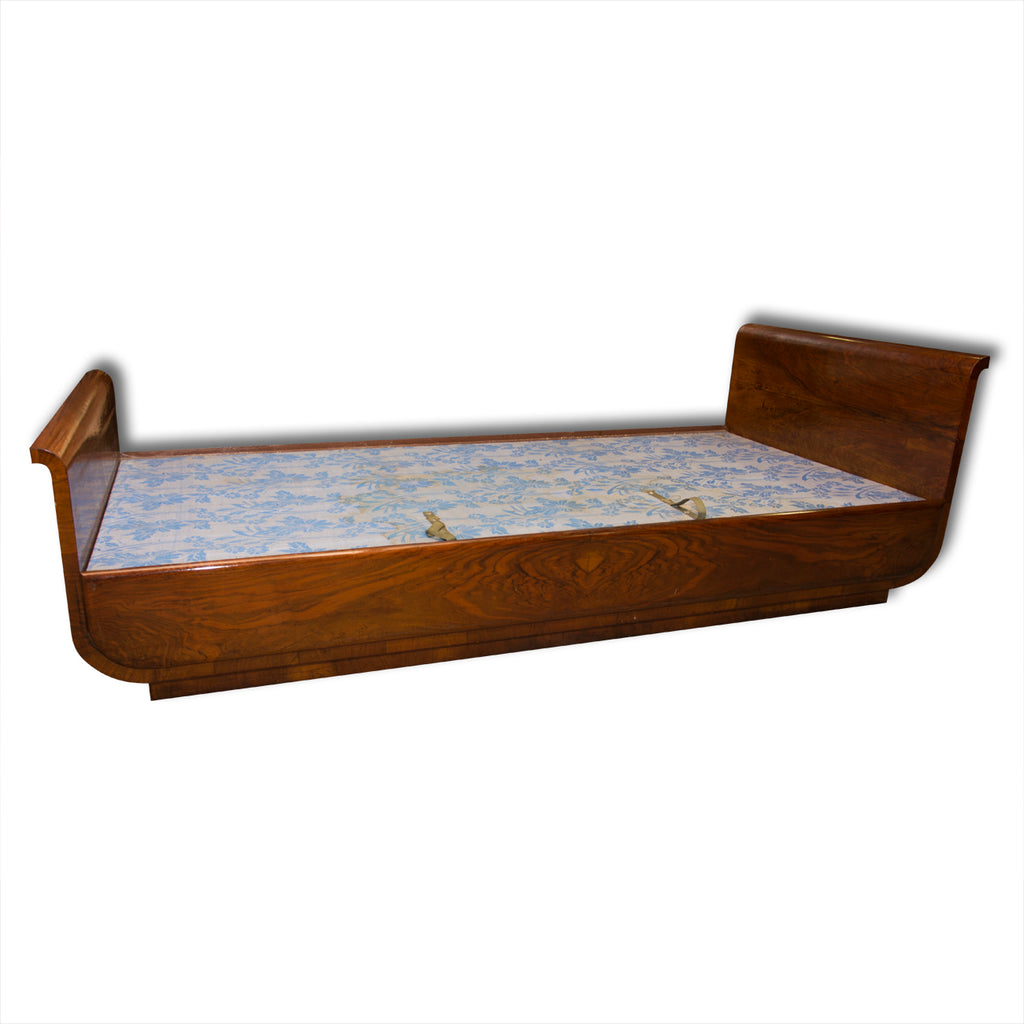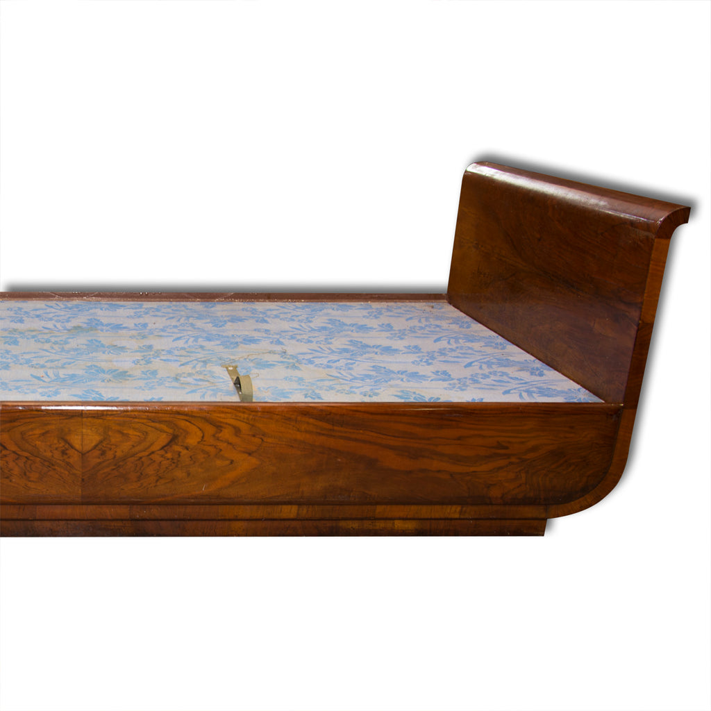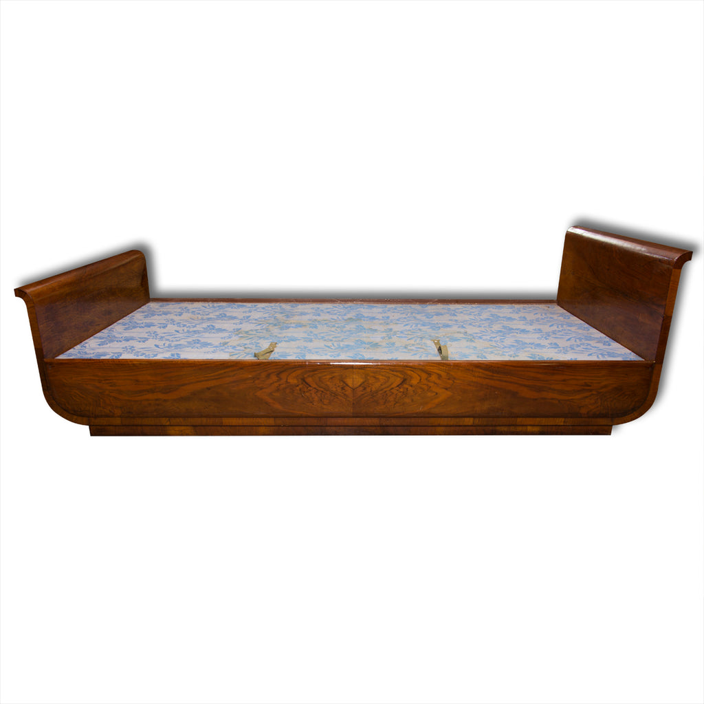 This ART DECO daybed in the shape of a tulip was designed by architect Jindrich Halabala in the 1930s for UP Zavody. The piece is an example of the Czechoslovak Pre-war ART DECO style and it features a wooden structure that is veneered in the walnut with original mattresses. The daybed is in very good condition— it has been refurbished and polished to a high gloss finish with a shellac.
