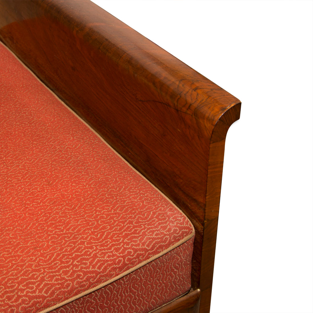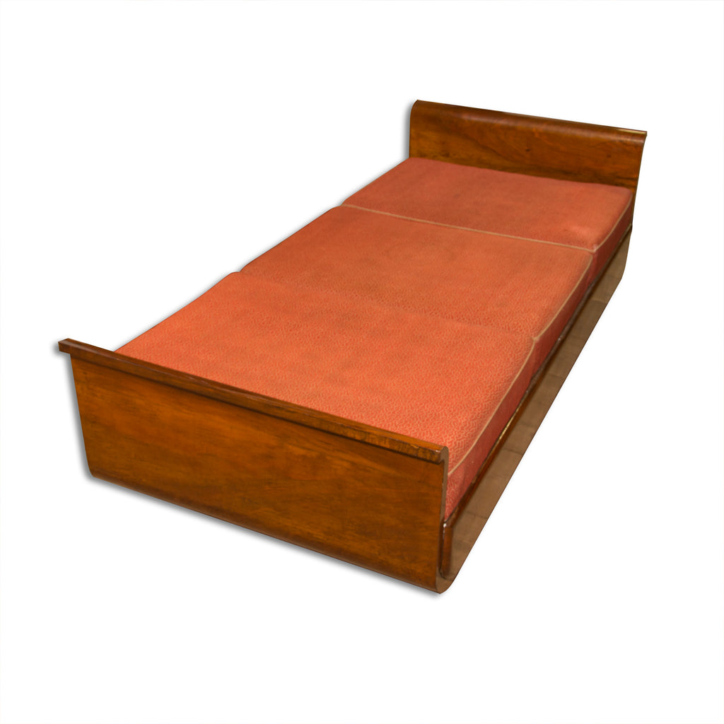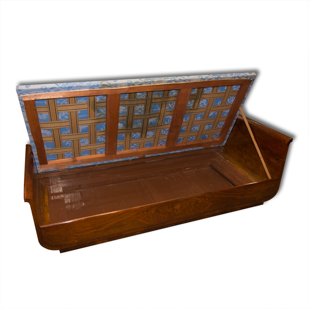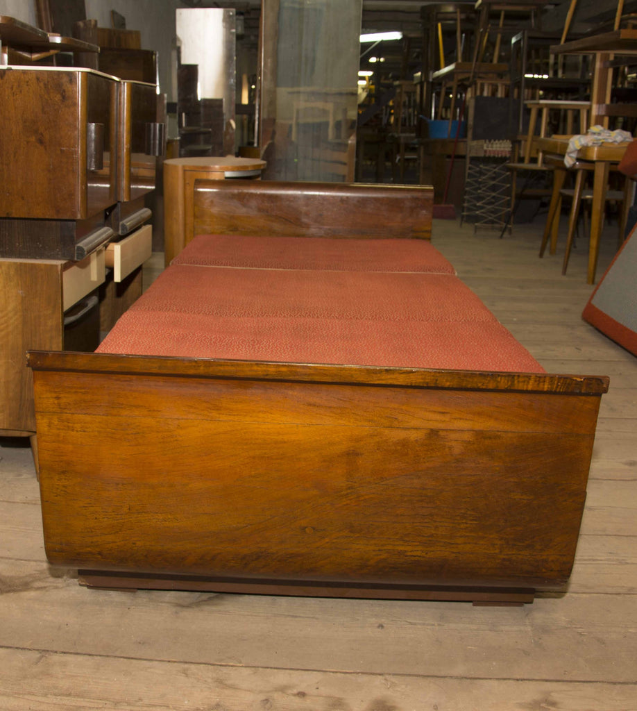 This ART DECO daybed in the shape of a tulip was designed by architect Jindrich Halabala in the 1930s for UP Zavody. The piece is an example of the Czechoslovak Pre-war ART DECO style and it features a wooden structure that is veneered in the walnut with original mattresses. The daybed is in very good condition— it has been refurbished and polished to a high gloss finish with a shellac.