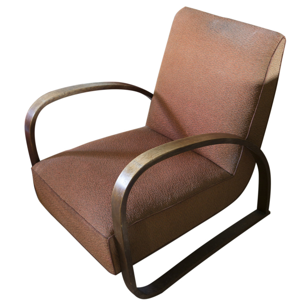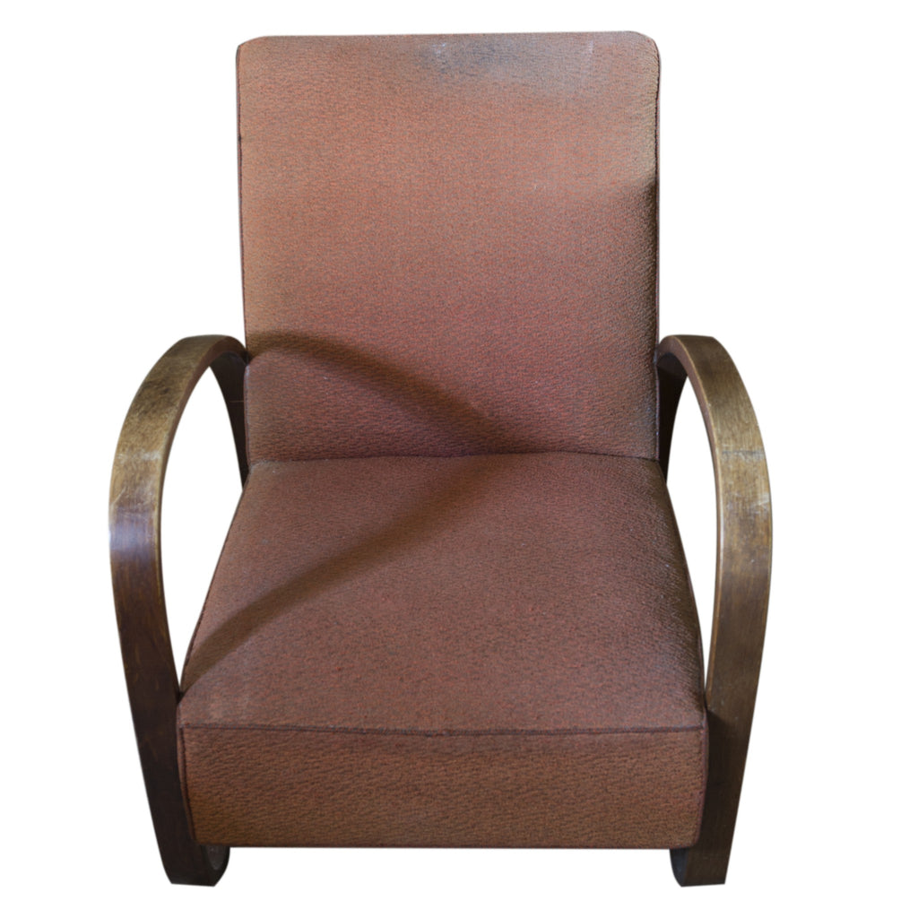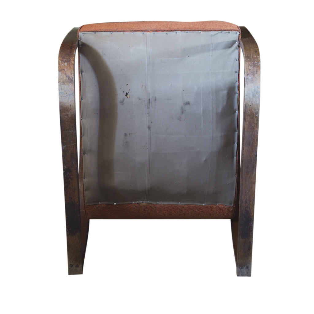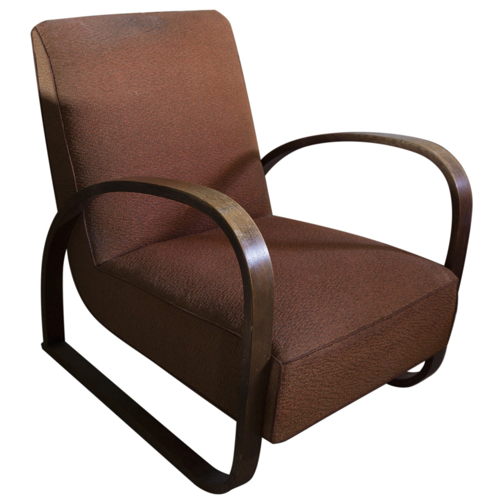 Art Deco ebonized bentwood armchair No. H-70 designed by Jindřich Halabala in the 1930´s. it features an original upholstery. The wooden structure is in good original condition.