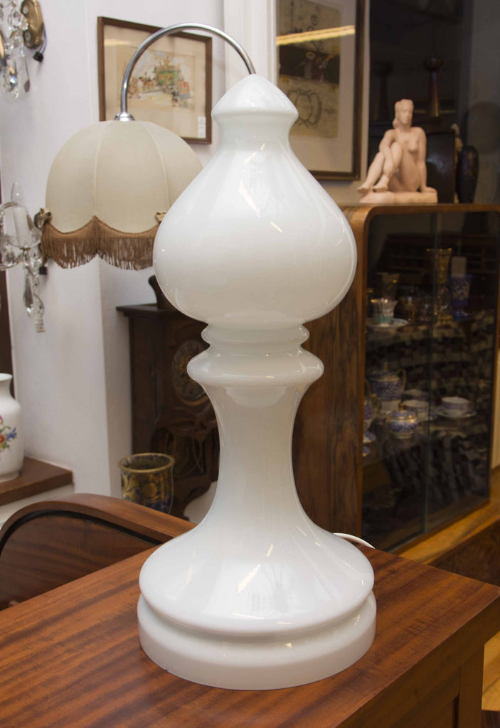 Glass lamp made of white milk glass in the shape of a chess shooter. It was designed by Ivan Jakes in the early 1970s and was produced by OS Valasské Meziříčí. The lamp has a very pleasant dim light and can also be used as an interesting decoration. The lamp is in excellent Vintage state and remains fully functional.