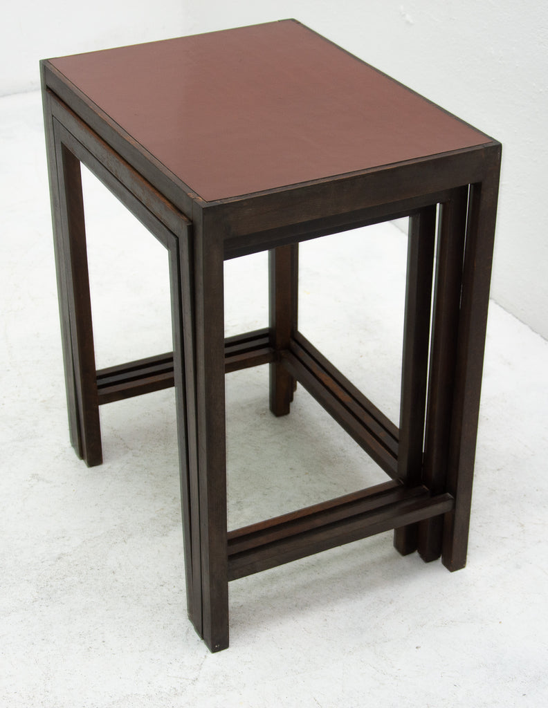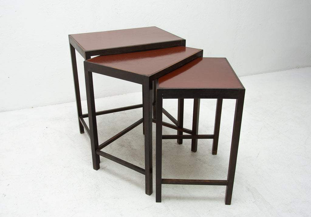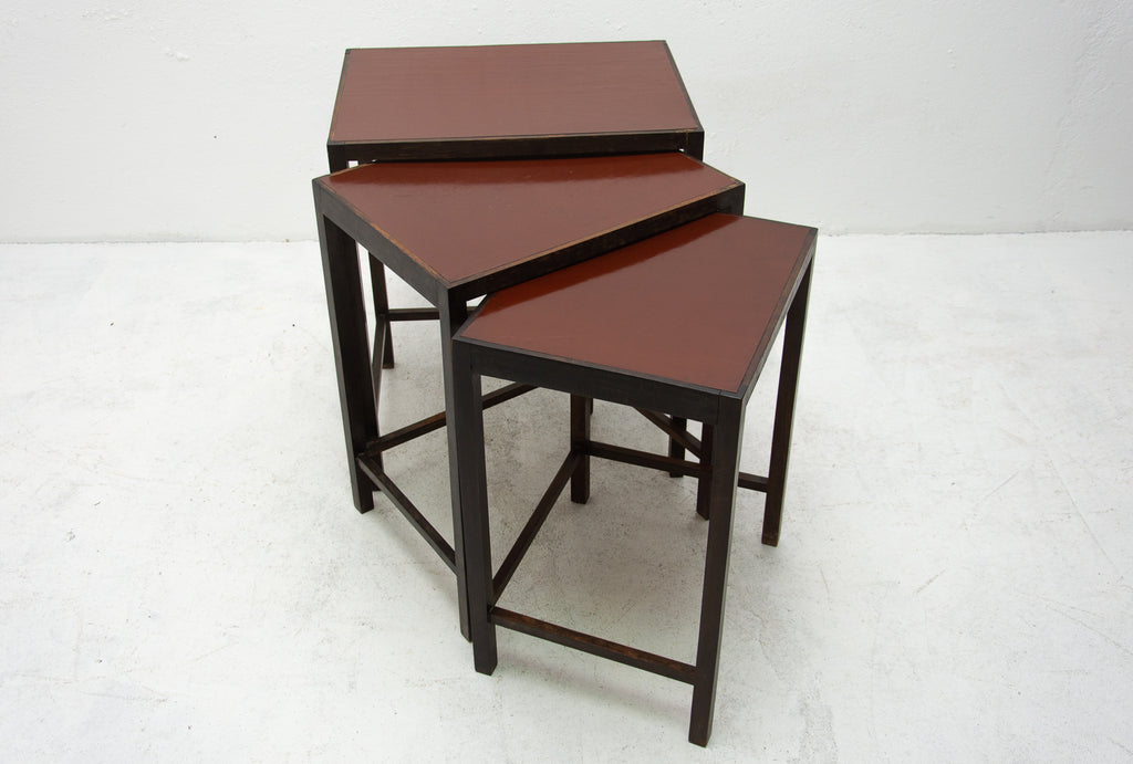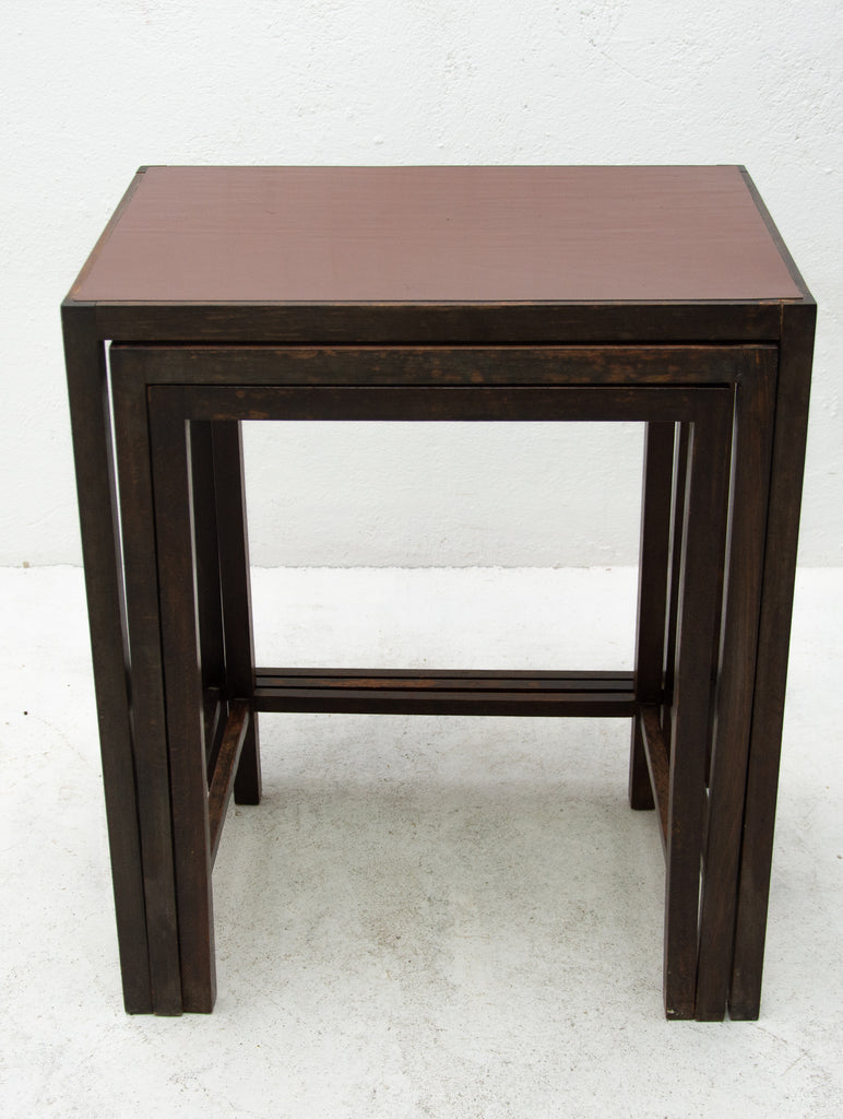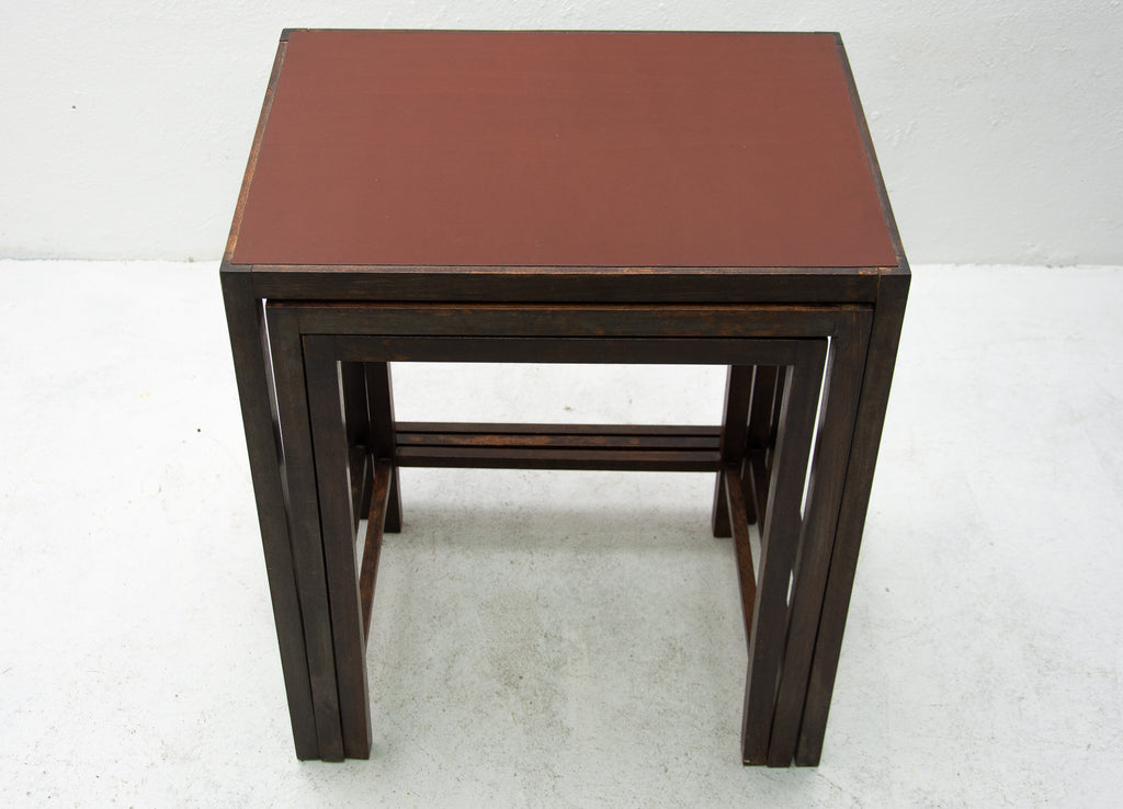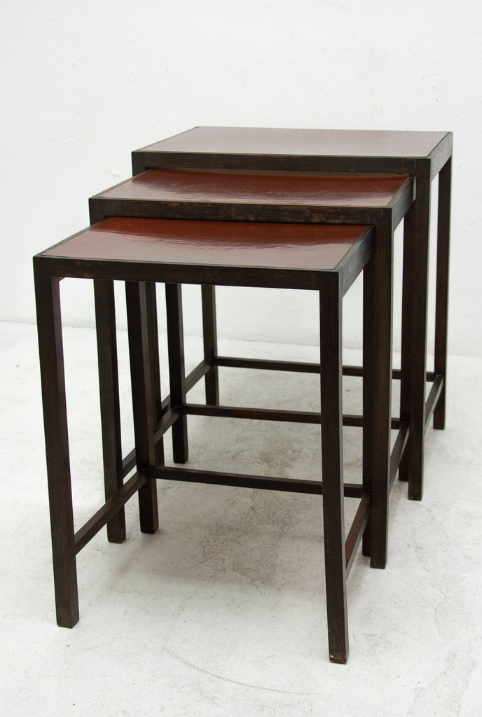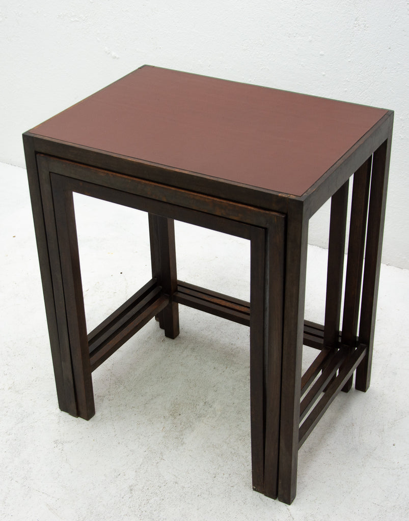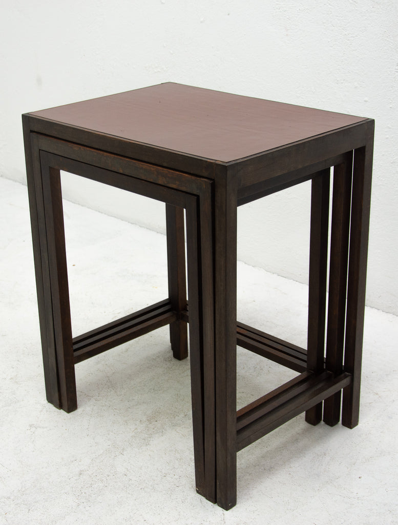 Jindrich Halabala, a famous set of three nesting tables catalogue no. H-50, designed in the 1930s and produced in the 1950s. It´s made of stained beech wood and it features a dark red bakelite tops. It is in good vintage condition, showing signs of age and use.