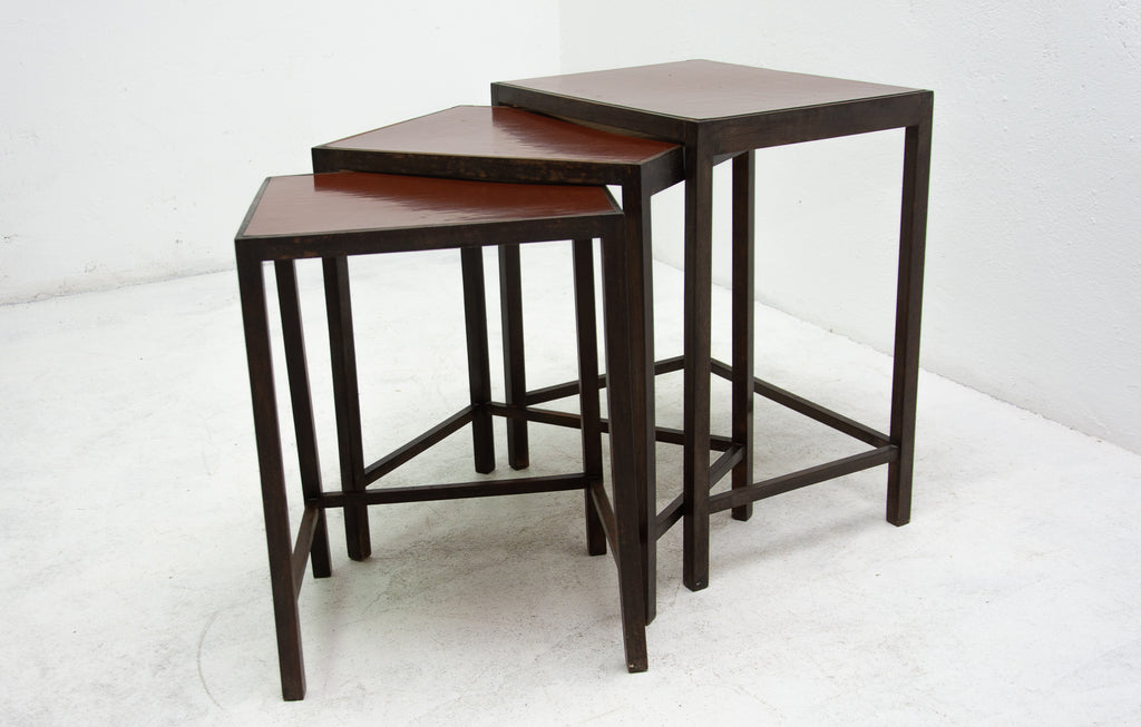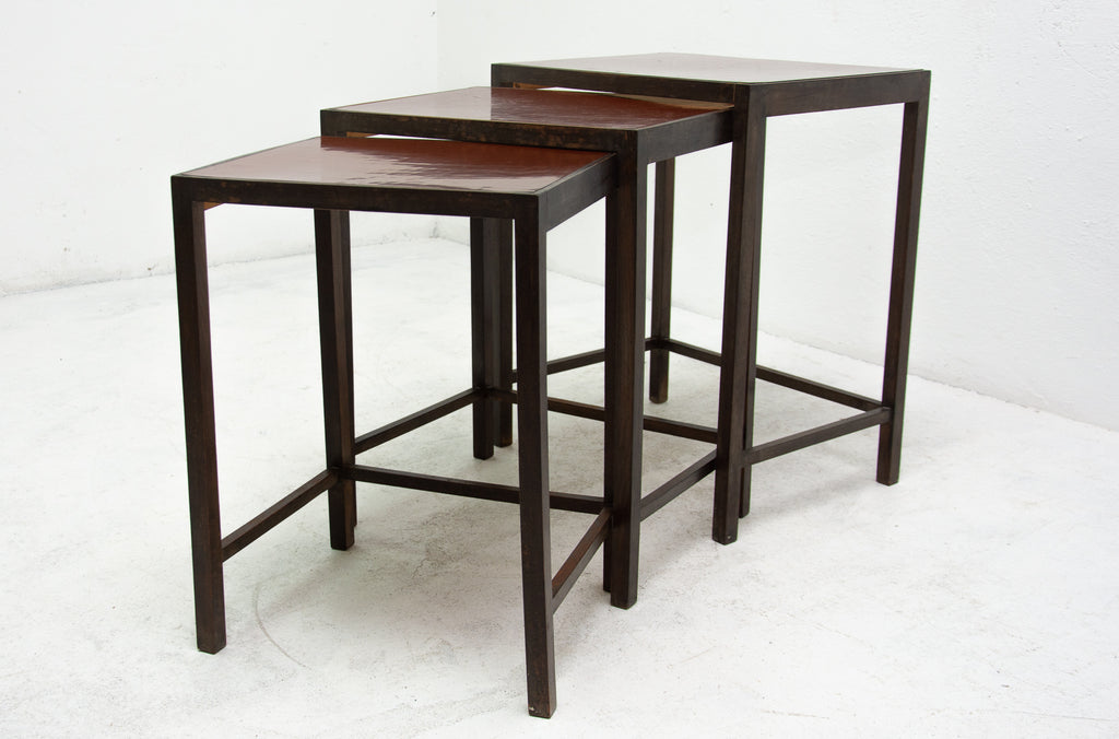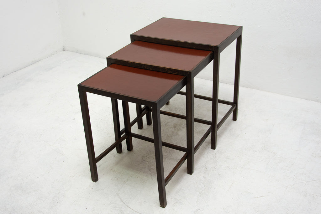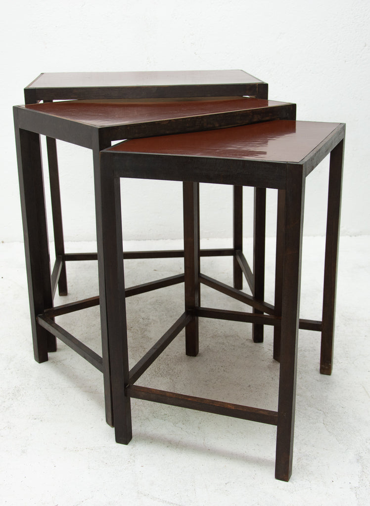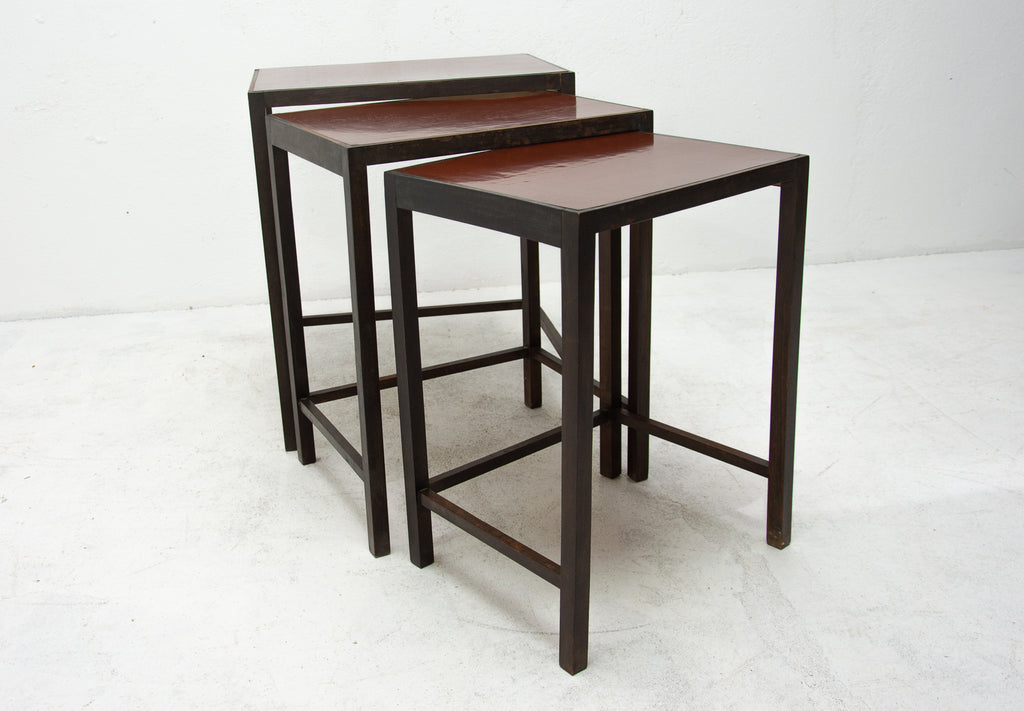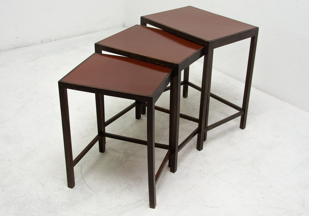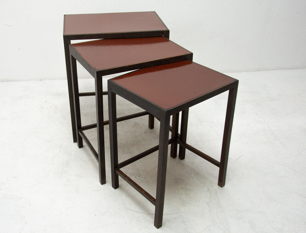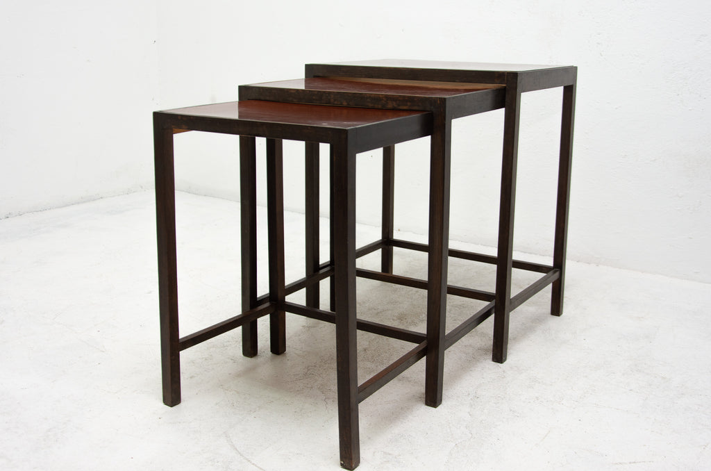 Jindrich Halabala, a famous set of three nesting tables catalogue no. H-50, designed in the 1930s and produced in the 1950s. It´s made of stained beech wood and it features a dark red bakelite tops. It is in good vintage condition, showing signs of age and use.
