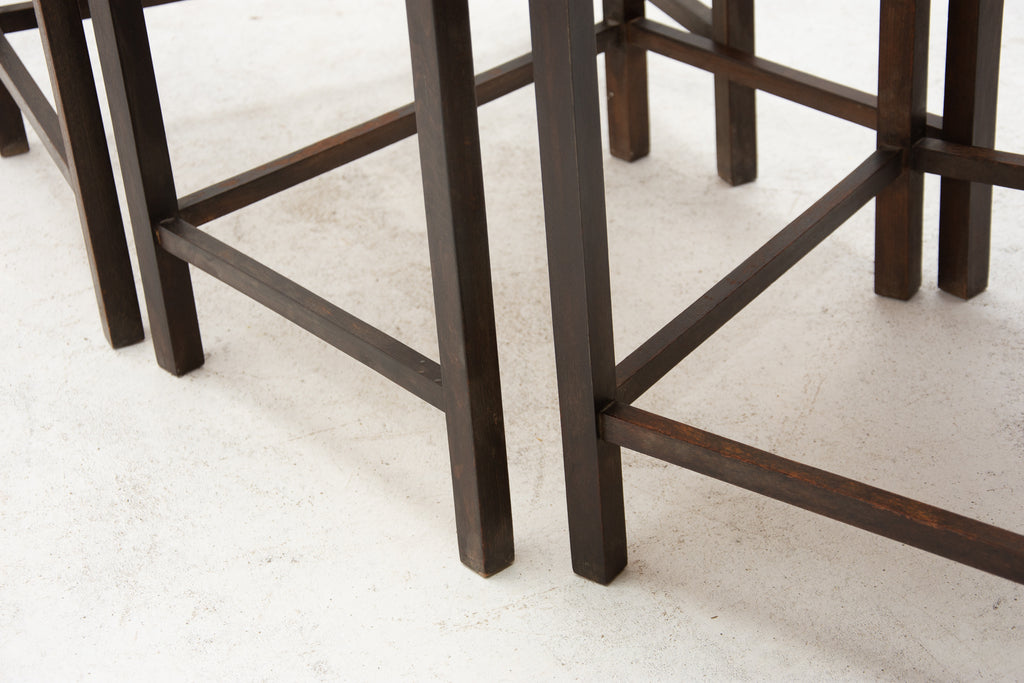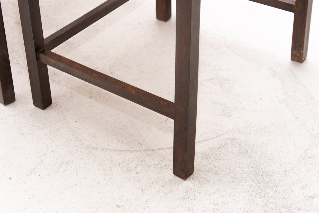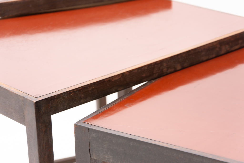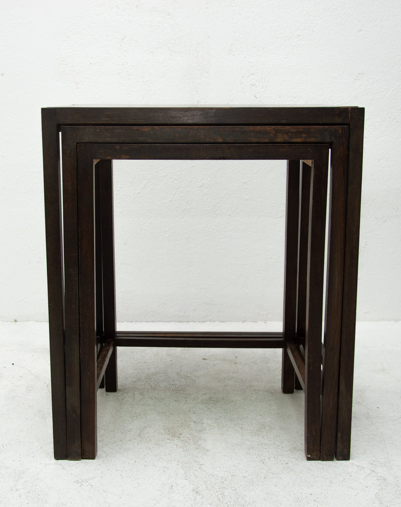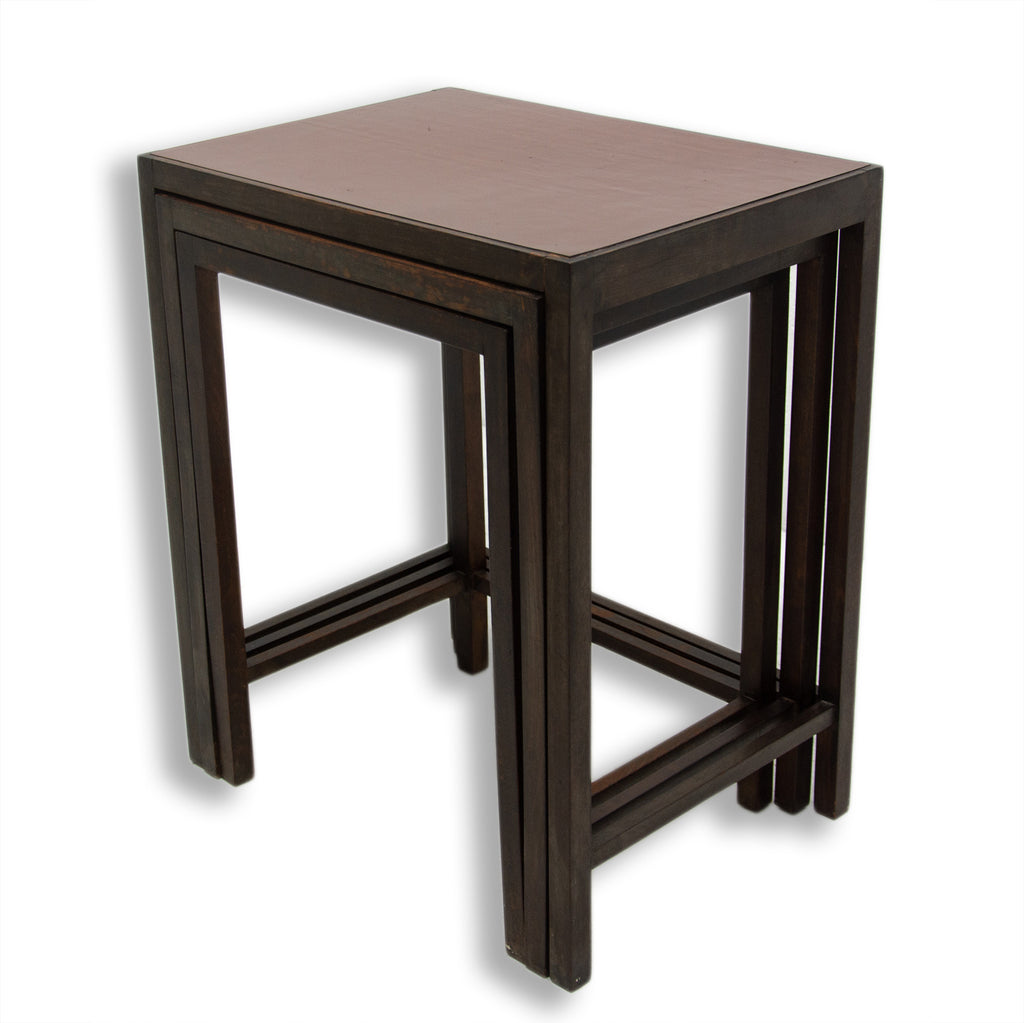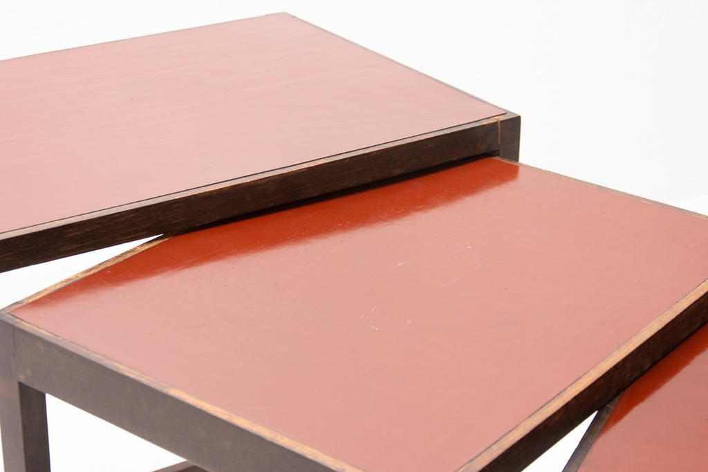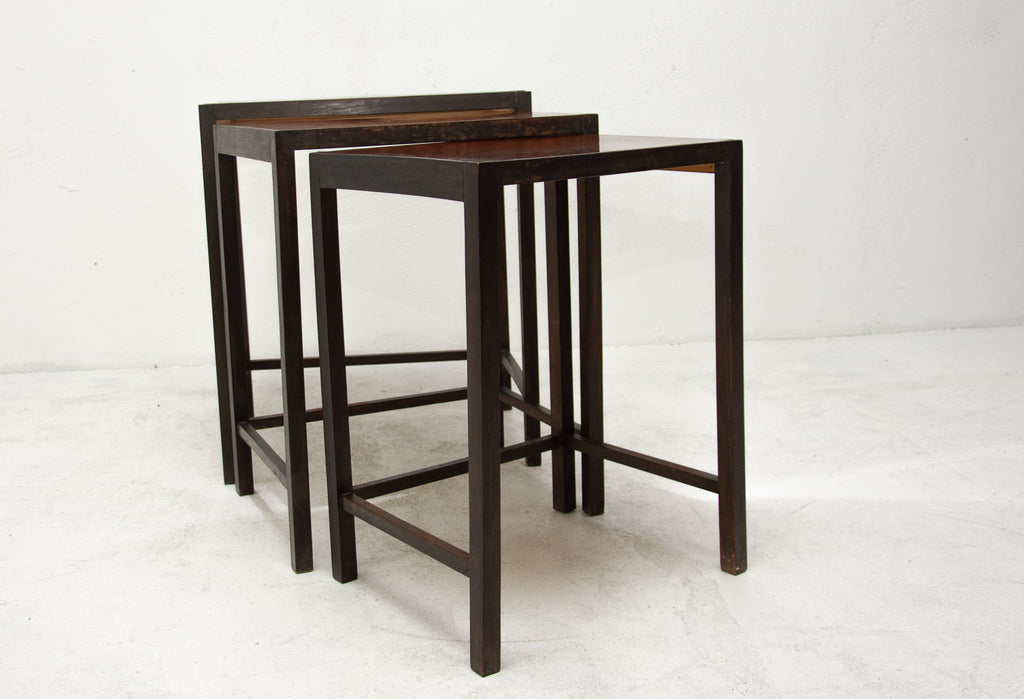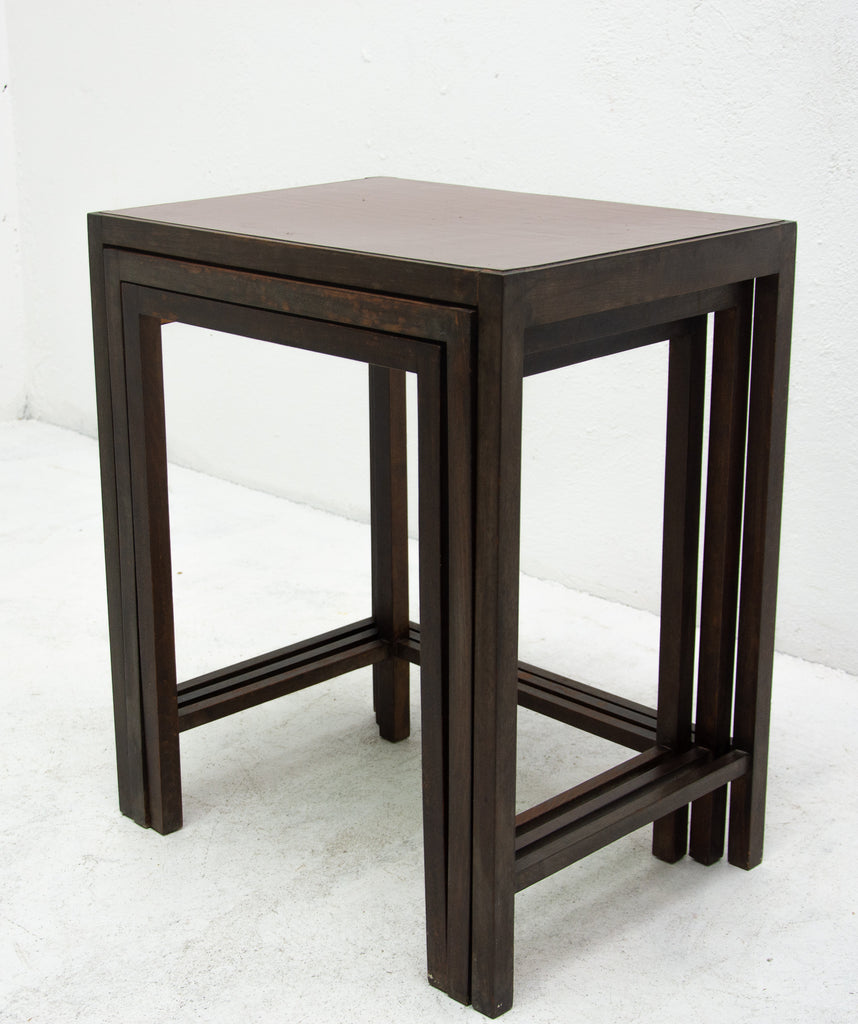 Jindrich Halabala, a famous set of three nesting tables catalogue no. H-50, designed in the 1930s and produced in the 1950s. It´s made of stained beech wood and it features a dark red bakelite tops. It is in good vintage condition, showing signs of age and use.