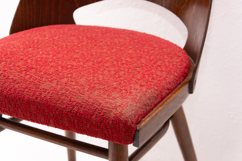 An interesting vintage chairs designed by Radomír Hofman for ÚP Závody. It was made in the former Czechoslovakia in the 1960´s. Upholstered, bent plywood, dark stained beech wood veneer. An interesting example of Czechoslovak design after the huge success of the Czechoslovak pavilion at Expo 58 in Brussels. The wooden structure and upholstery are in their original condition. The chairs are in very good Vintage condition, bears signs of age and using. Price is for the set of four.
