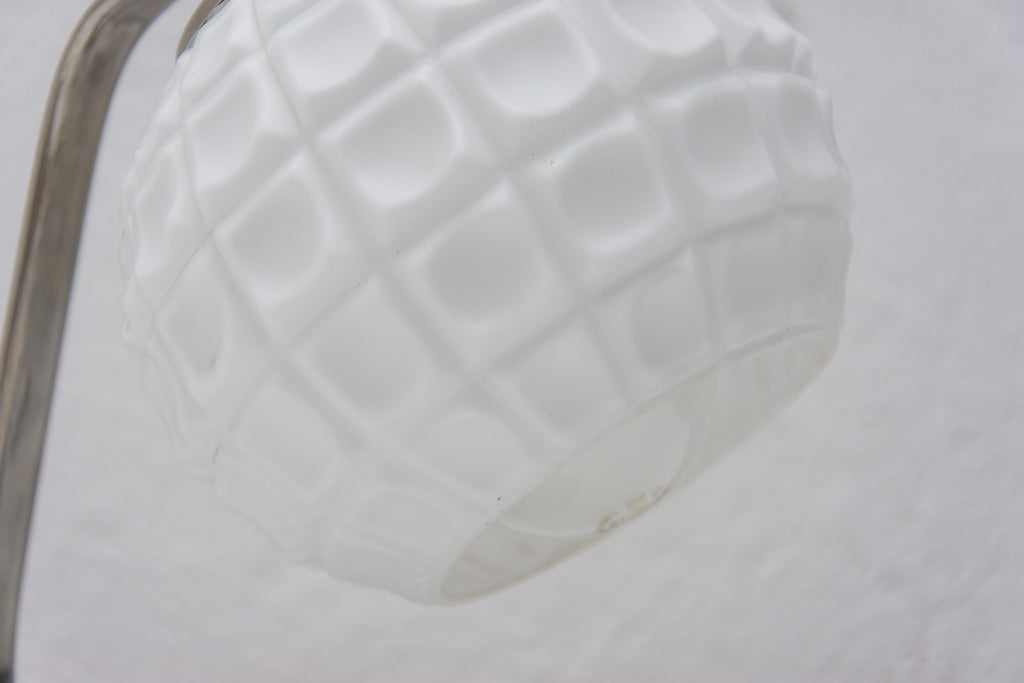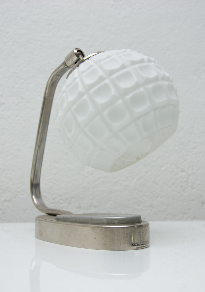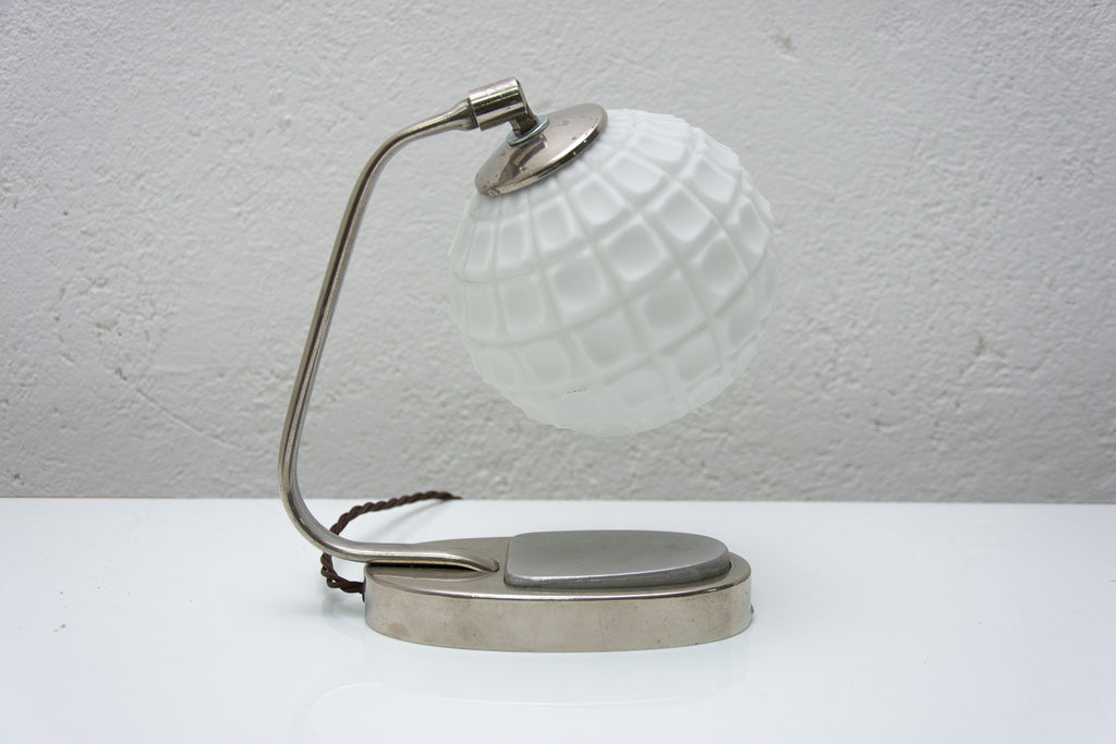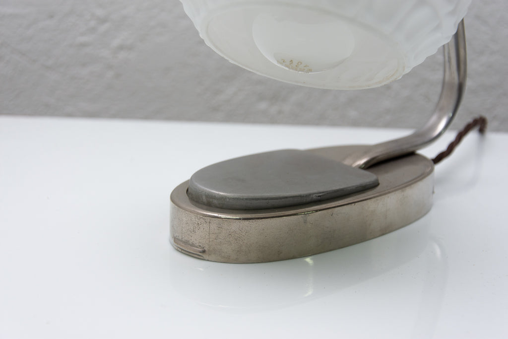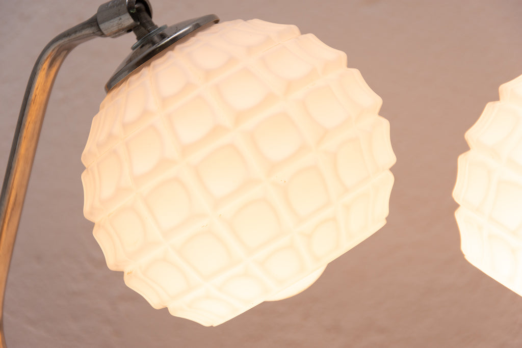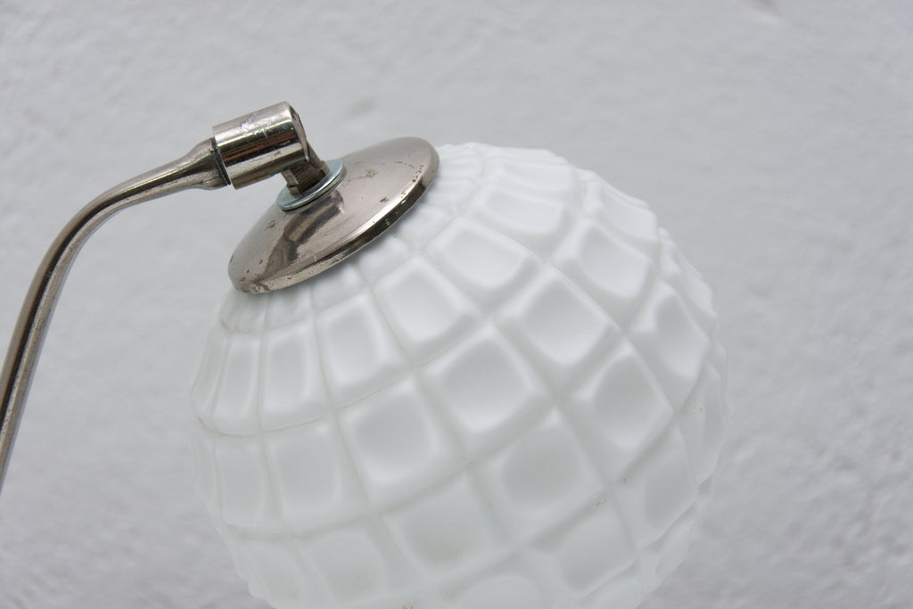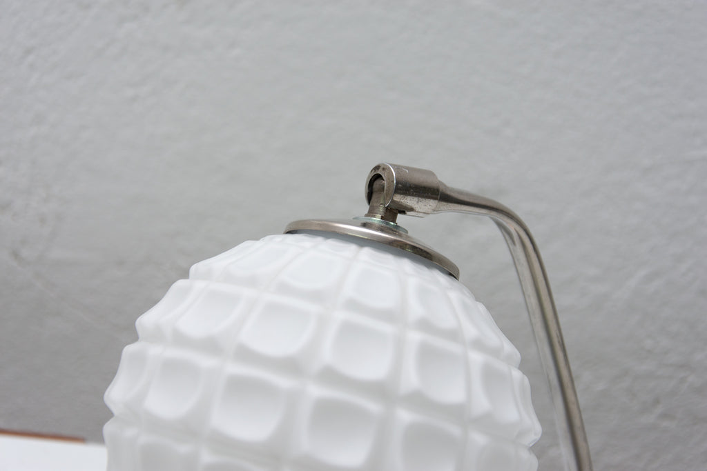 Pair of chrome and opaline glass table lamps, made in Bohemia in the 1930´s. In very good Vintage condition, chrome structure has been cleaned and the lamps have a new wiring. Price is for the pair.