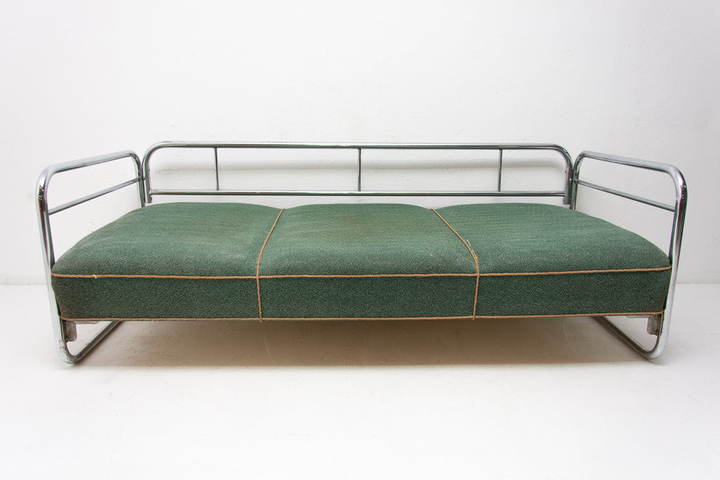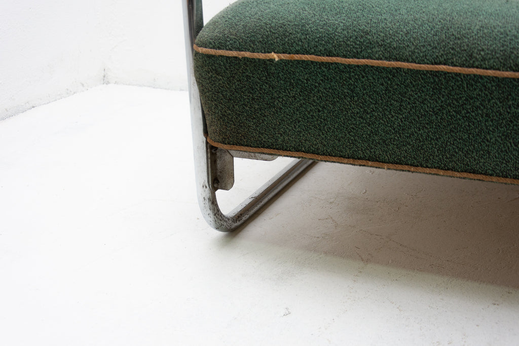Chromed tubular steel sofa from the Bauhaus period, 1930s, Bohemia. Probably made by Hynek Gottwald company. Chrome and upholstery are in good Vintage condition, bearing signs of age and using.