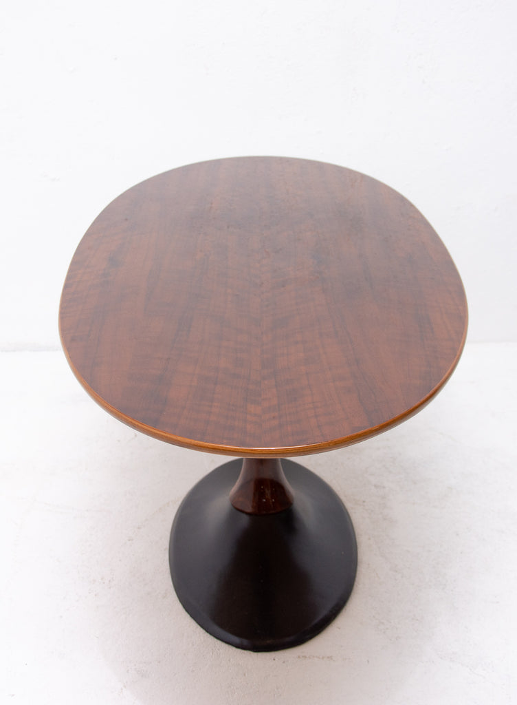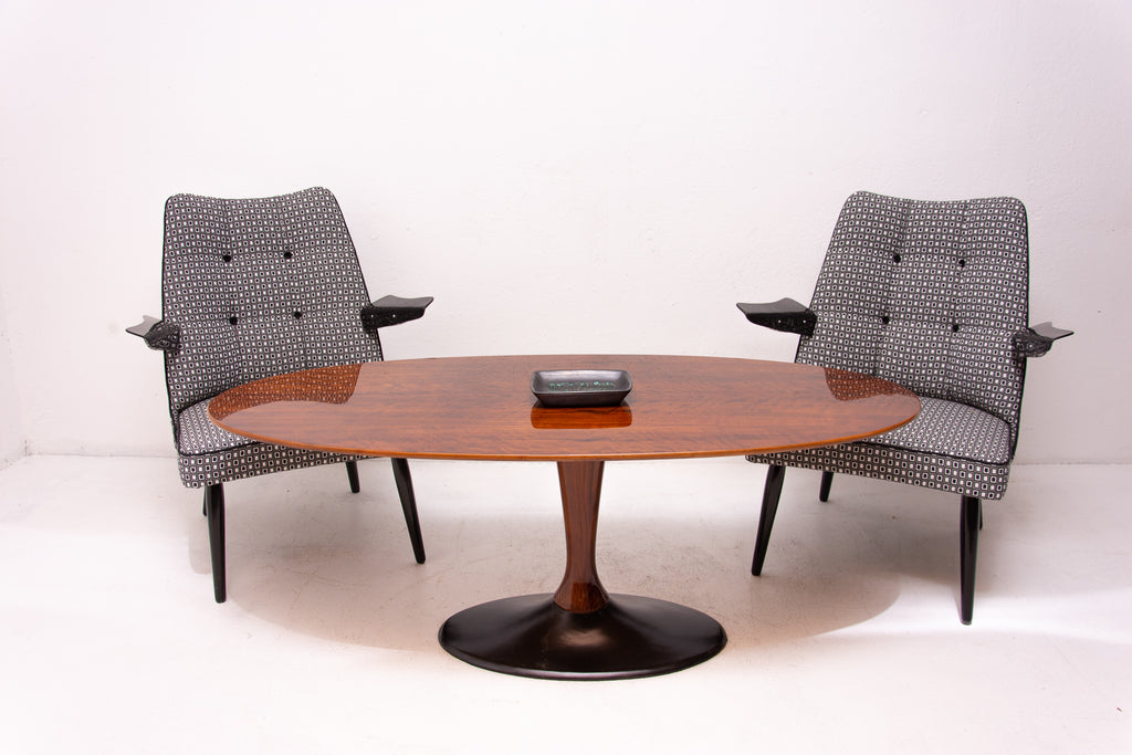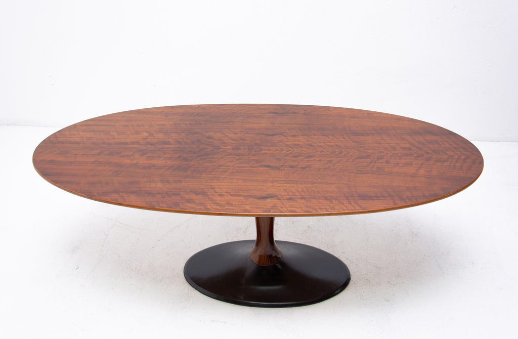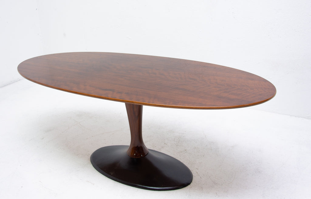 This coffee/occasional table was made in the former Czechoslovakia in the 1970´s. The table top is in the shape of a long oval and stands on a narrow leg with a pedestal. The table is lacquered to high gloss with a polyurethane. The gross weight of the table is about 35 kg. Very elegant design. It can be also used as a dining table. The table is fully refurbished, in excellent condition.