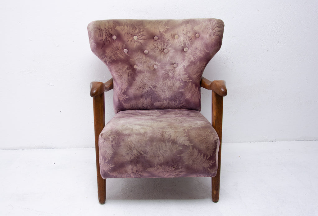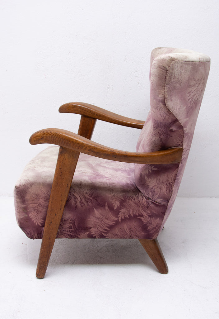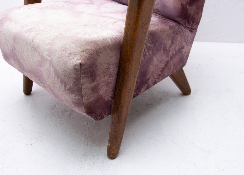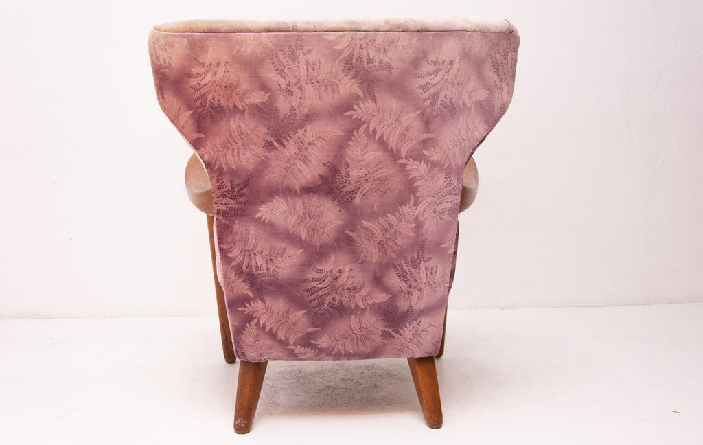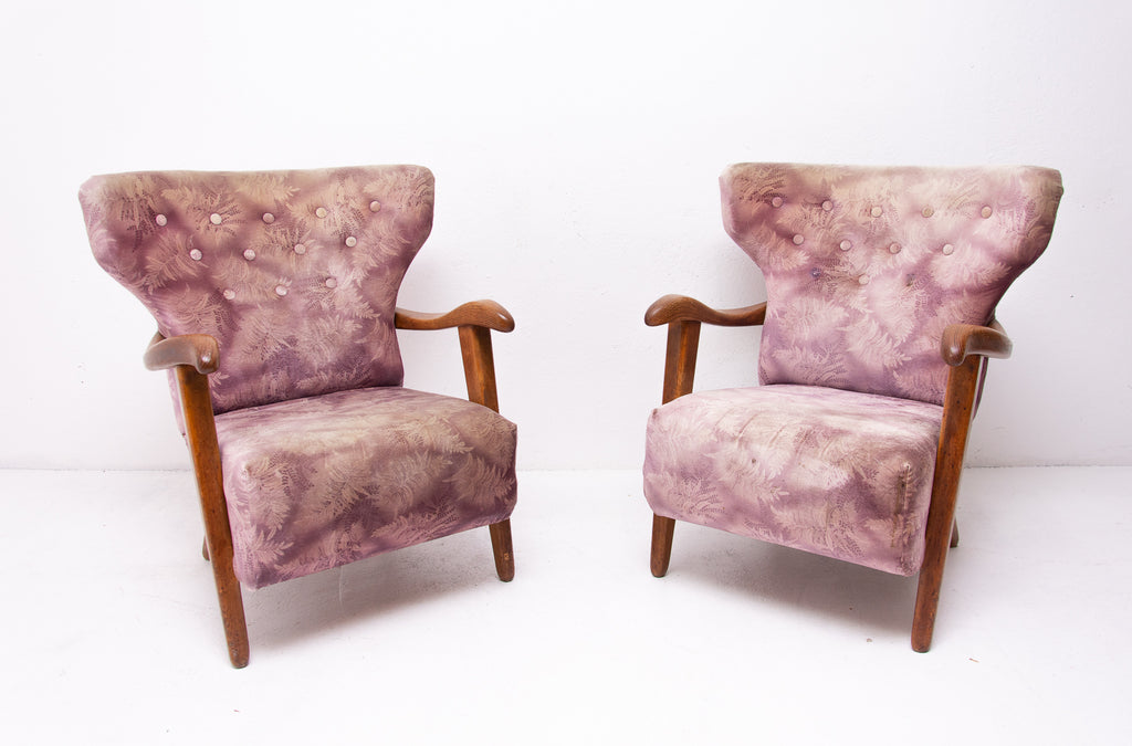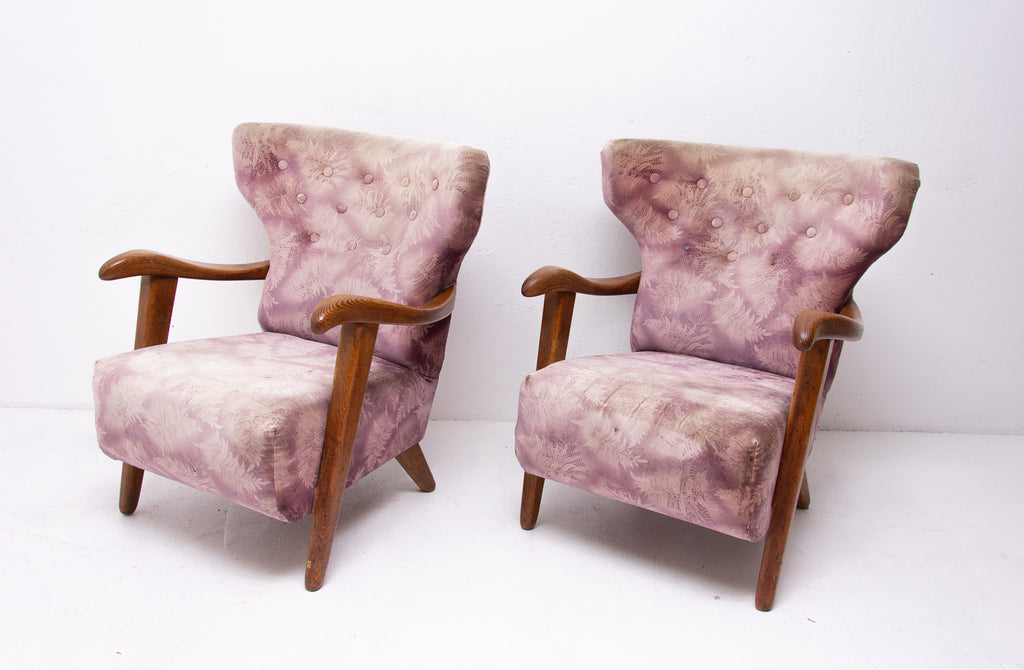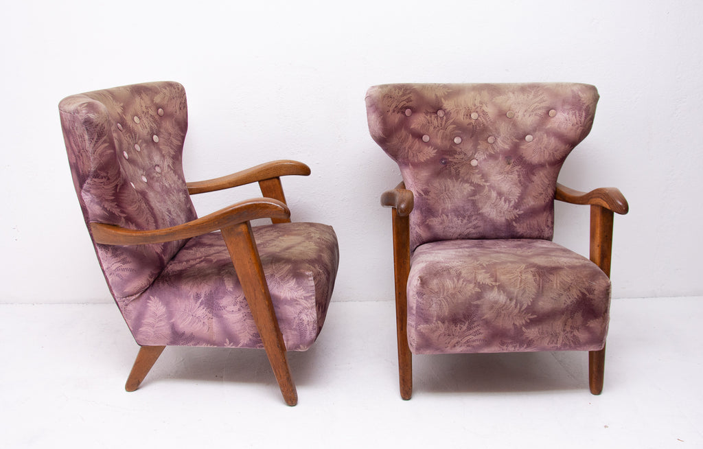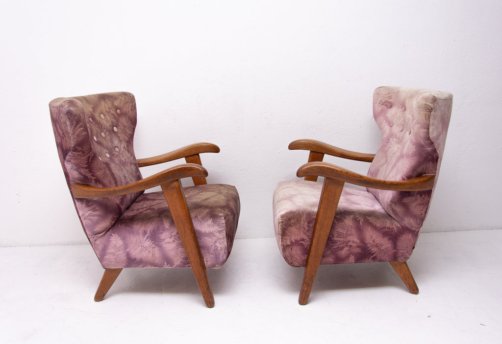 A pair of wingback armchairs, produced by Krásná Jizba company, made in the former Czechoslovakia in the 1950´s. The structure is made of oak wood, the armchairs were reupholstered in the past. The armchairs are in good Vintage condition.