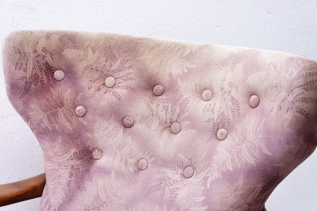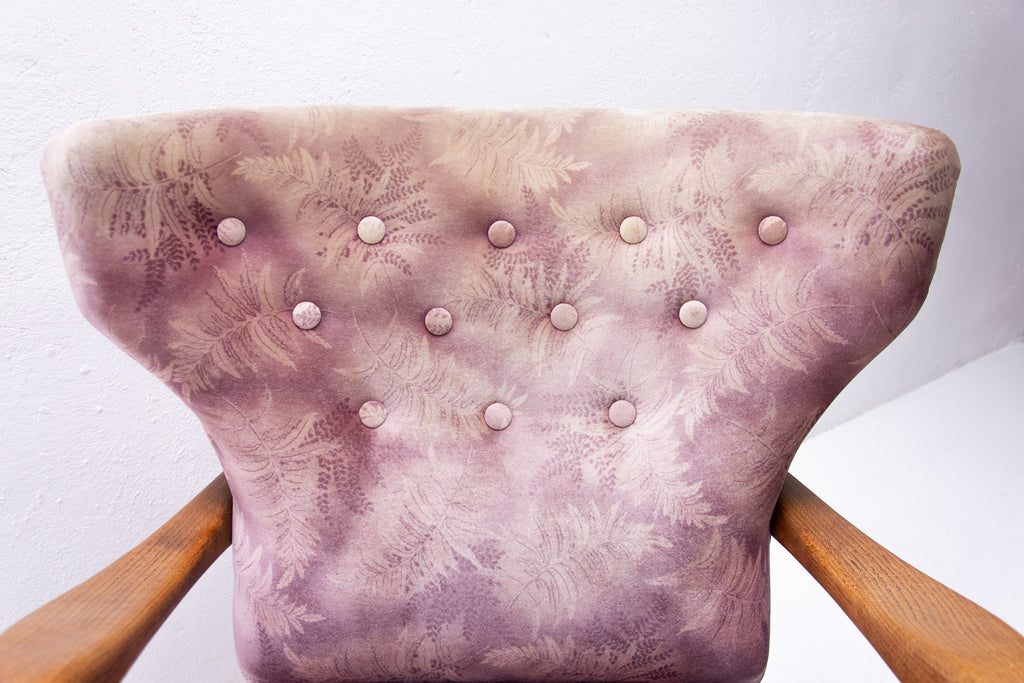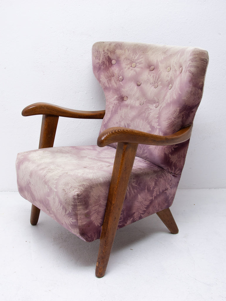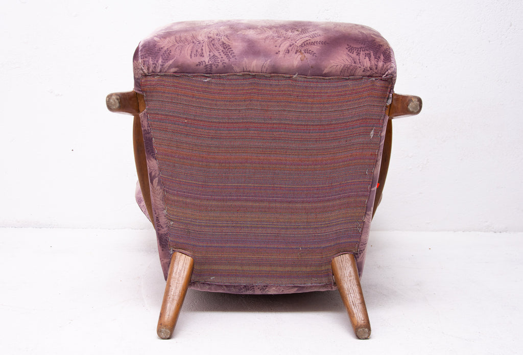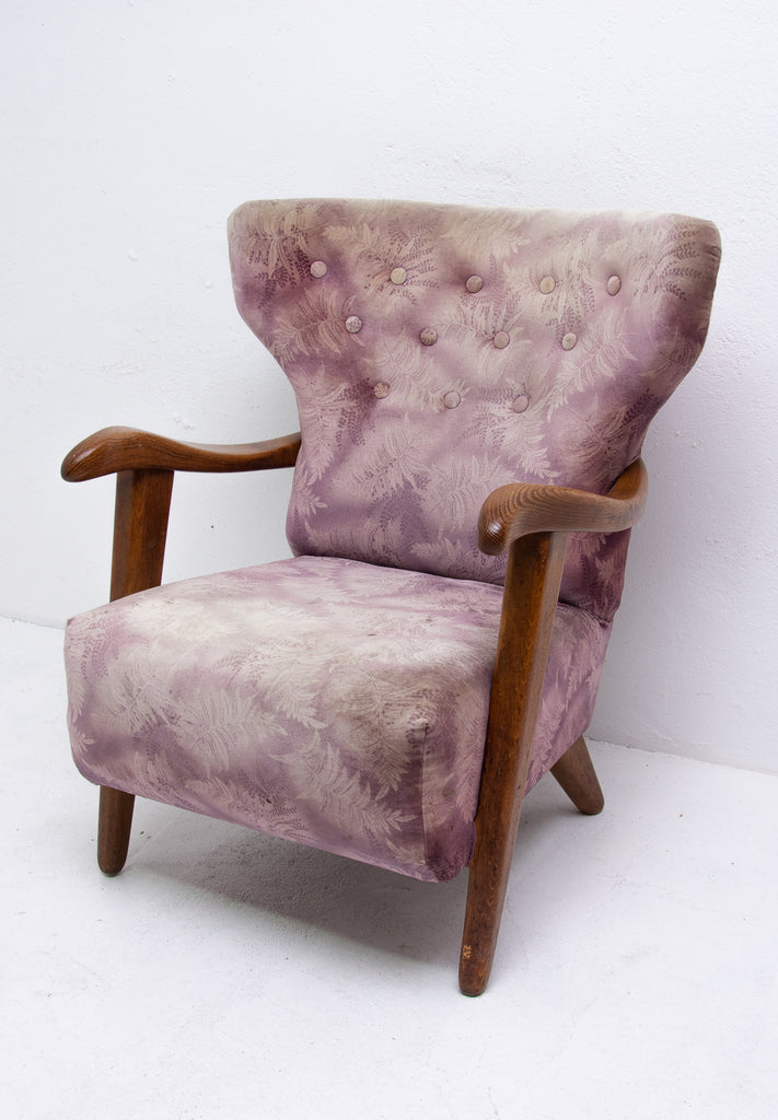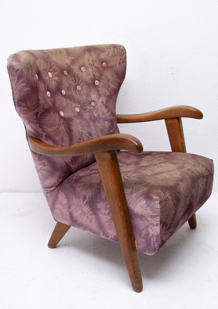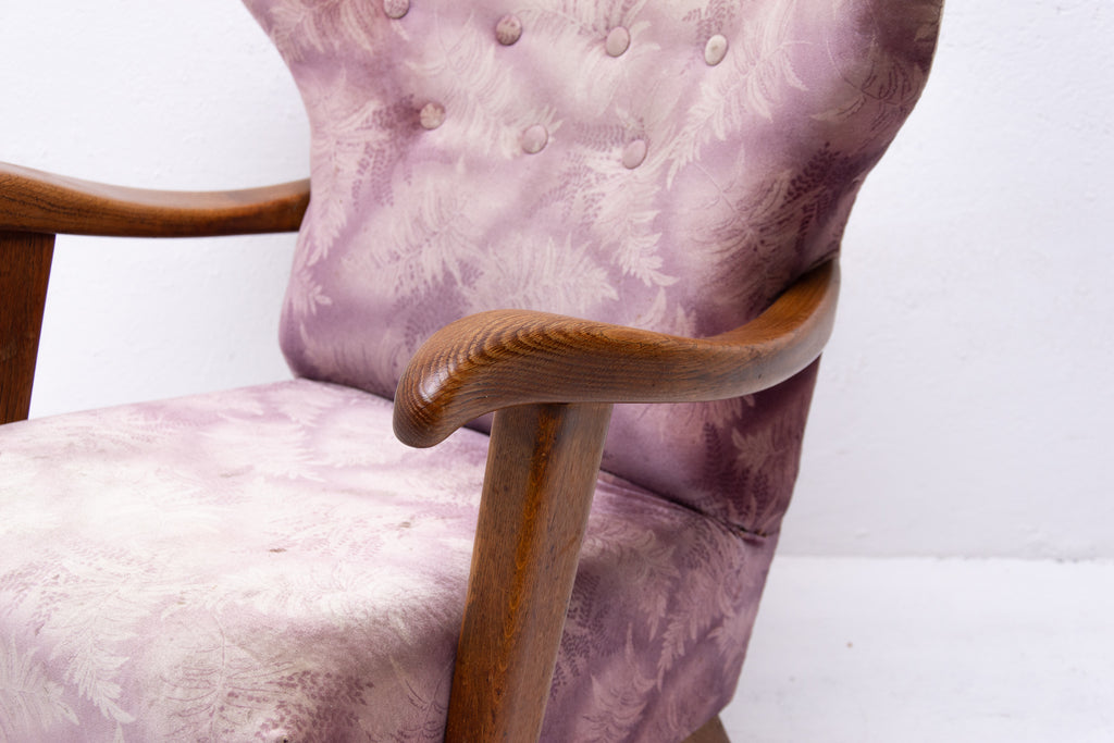 A pair of wingback armchairs, produced by Krásná Jizba company, made in the former Czechoslovakia in the 1950´s. The structure is made of oak wood, the armchairs were reupholstered in the past. The armchairs are in good Vintage condition.