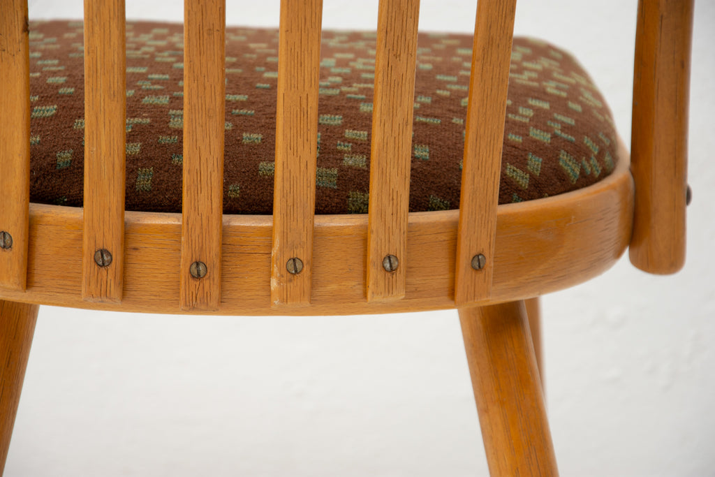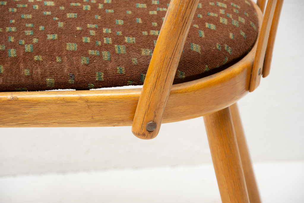 Mid century bentwood chairs designed by Antonin Suman for JITONA company They were made in the former Czechoslovakia in the 1960´s. The chairs features an original upholstery and are made of bent beechwood. structurally, the chairs are perfectly fine. The upholstery is damaged in several places, the surface bears signs of wear.