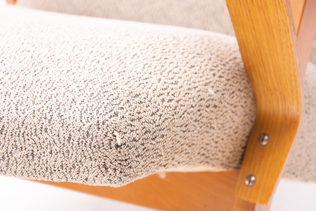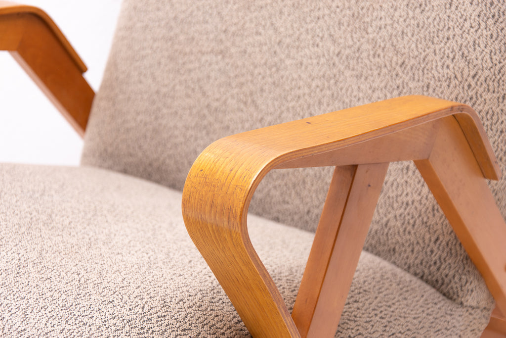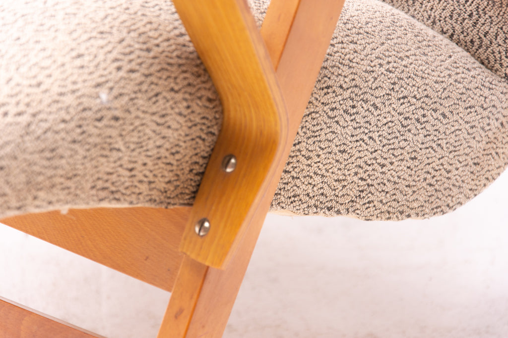 The armchairs features an original bent plywood armrests and the wooden structure is in beech veneer . These items are in very good Vintage condition, bears signs of age and using.