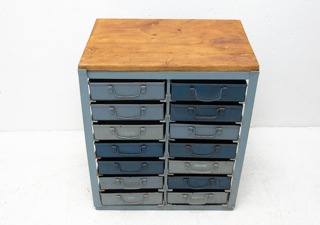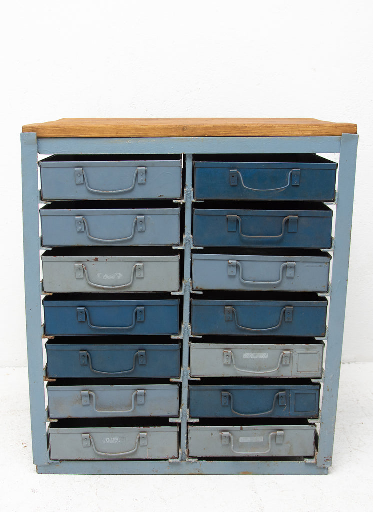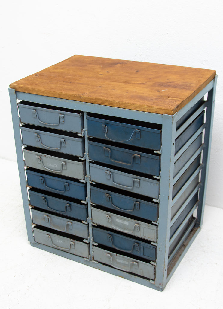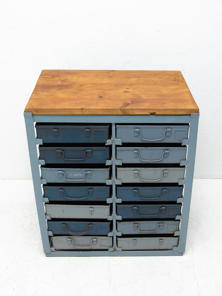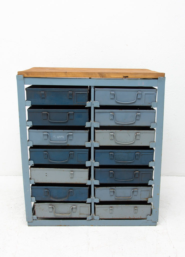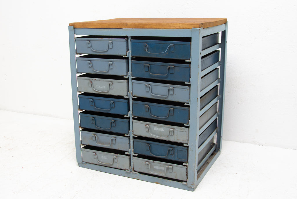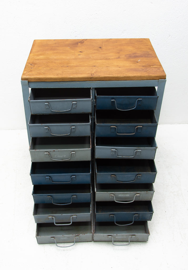 This vintage Industrial iron chest of drawers was made during the 1950s. It features an iron construction, an old wooden top, and 14 metal drawers. In very good vintage condition, patina consistent with age and use. Gross weight: 45 kg.