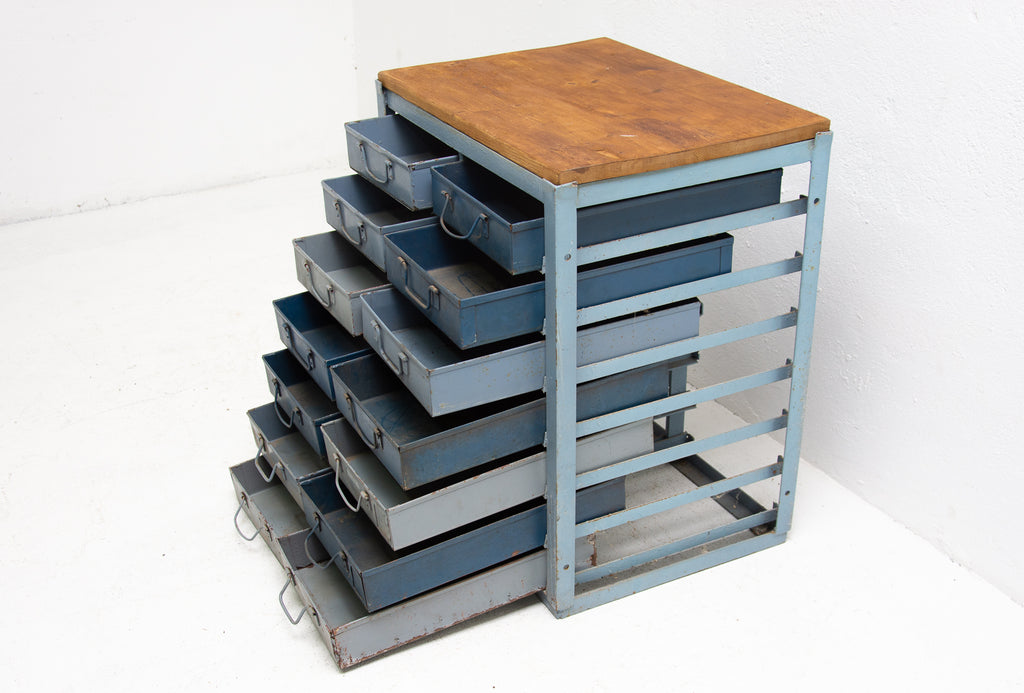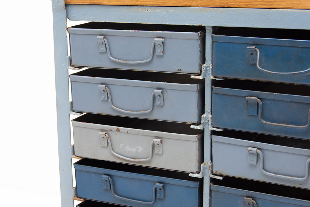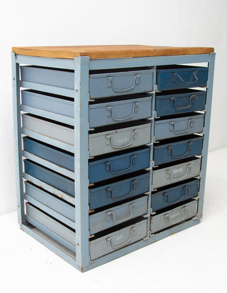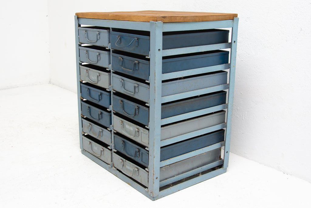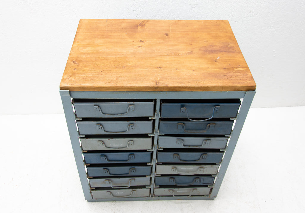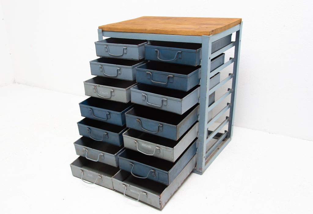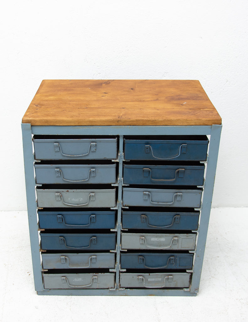 This vintage Industrial iron chest of drawers was made during the 1950s. It features an iron construction, an old wooden top, and 14 metal drawers. In very good vintage condition, patina consistent with age and use. Gross weight: 45 kg.
