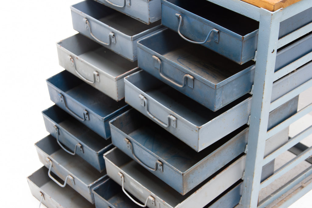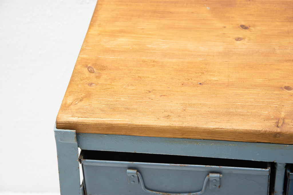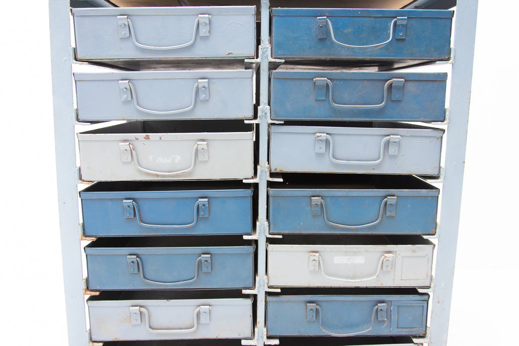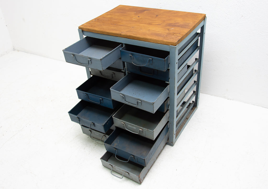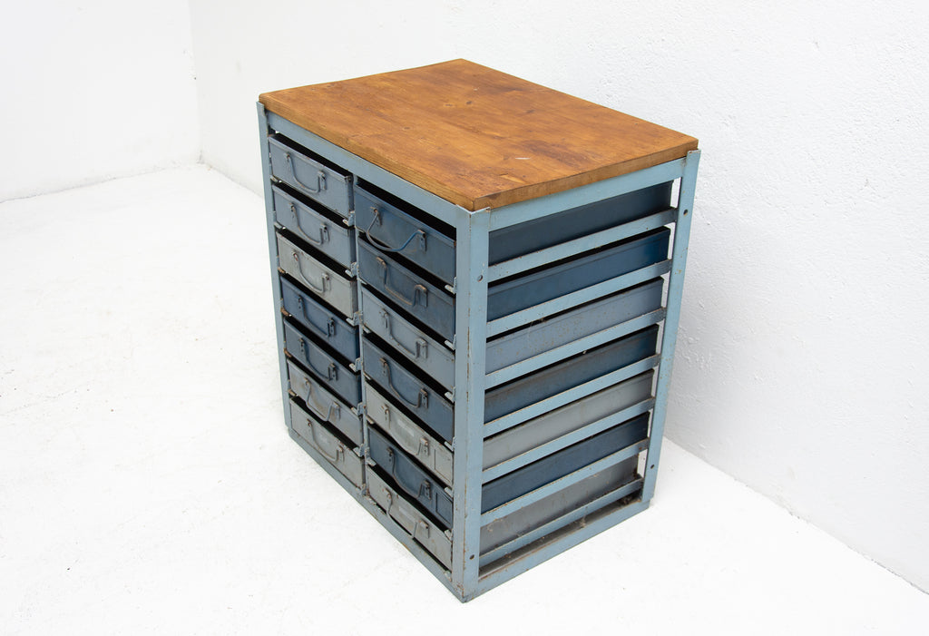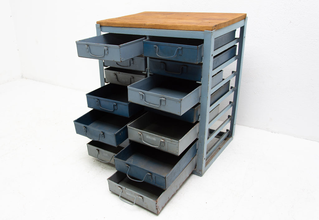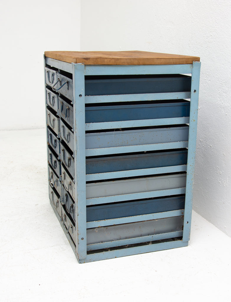 This vintage Industrial iron chest of drawers was made during the 1950s. It features an iron construction, an old wooden top, and 14 metal drawers. In very good vintage condition, patina consistent with age and use. Gross weight: 45 kg.