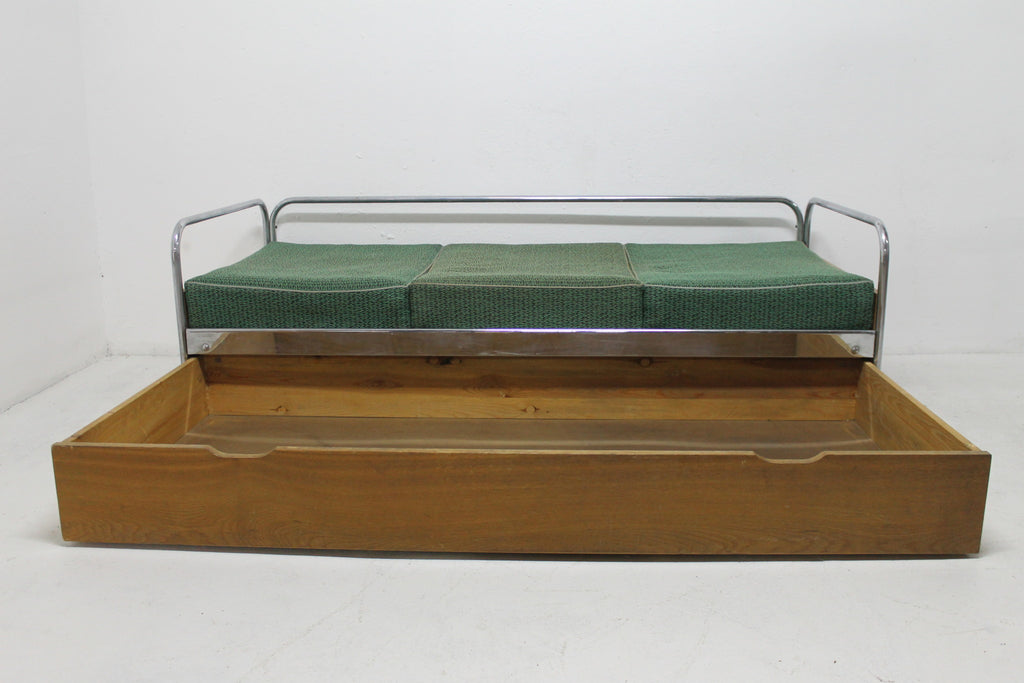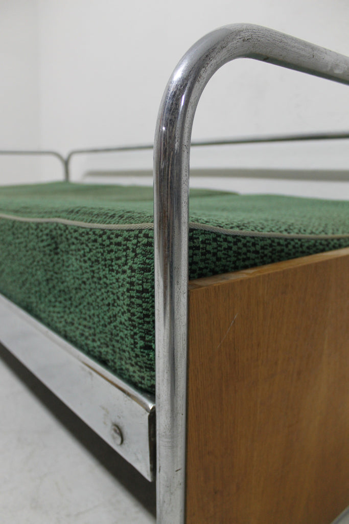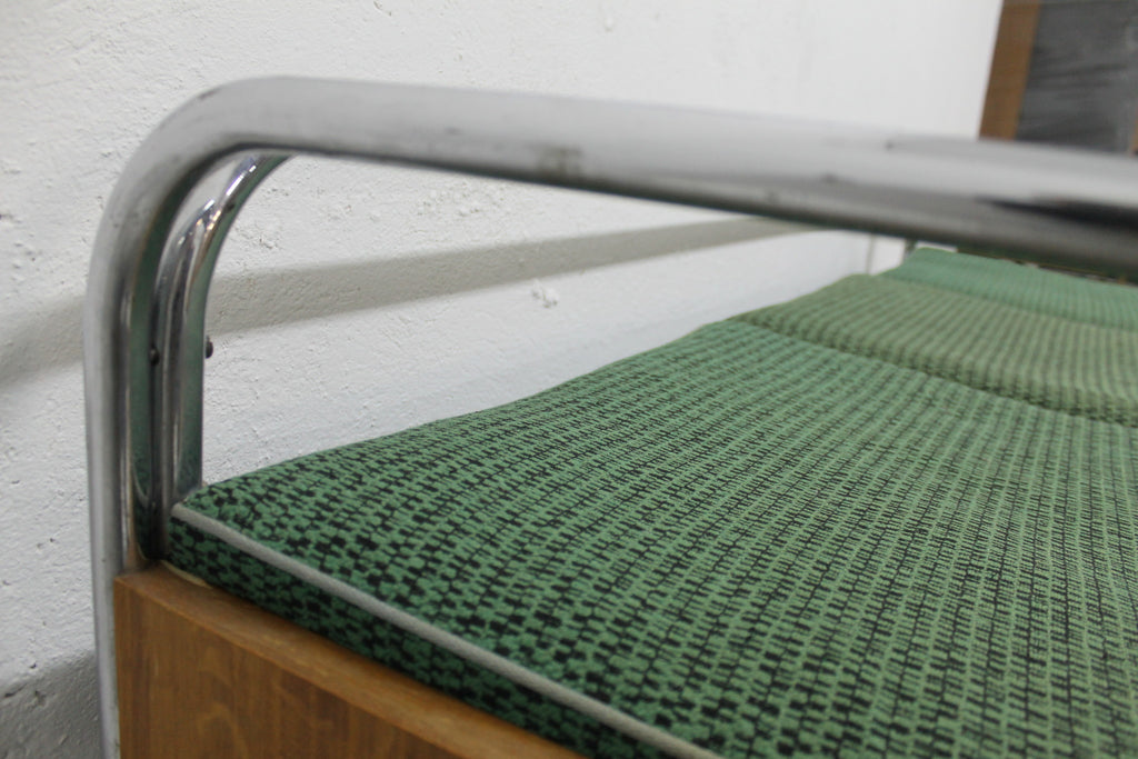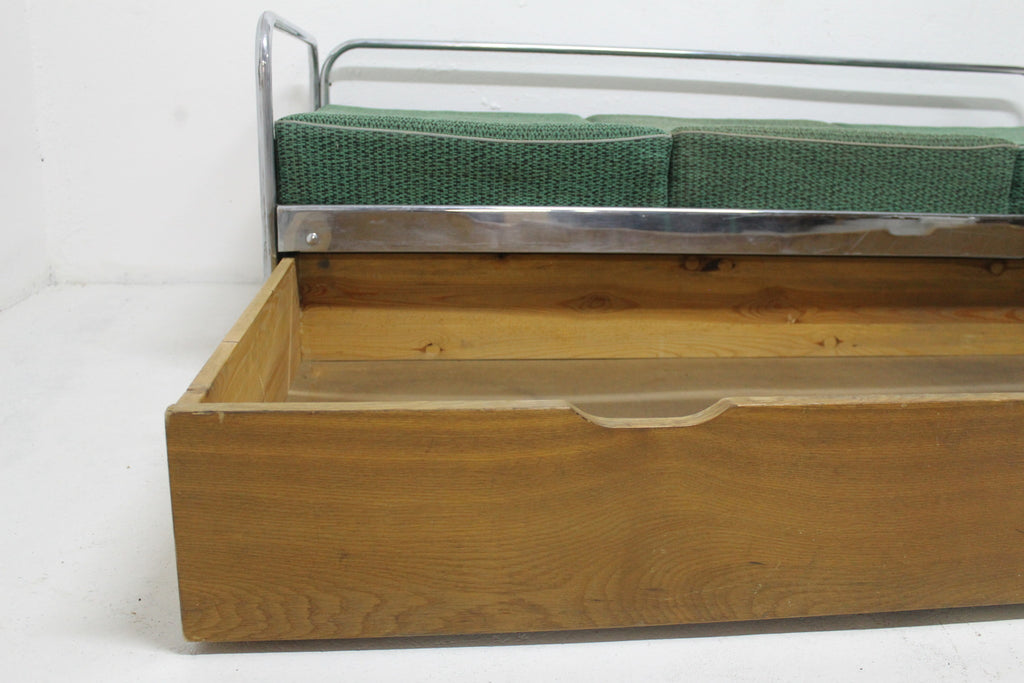This mid-century functionalist tubular sofa was made by Kovona in the former Czechoslovakia in the 1950s. It features a simple design, beech wood panels on the sides, a pull-out storage drawer, the mattresses are original and well-preserved.