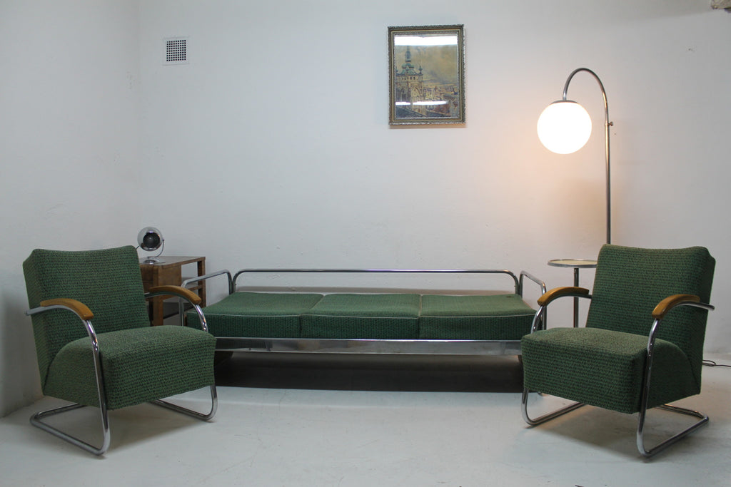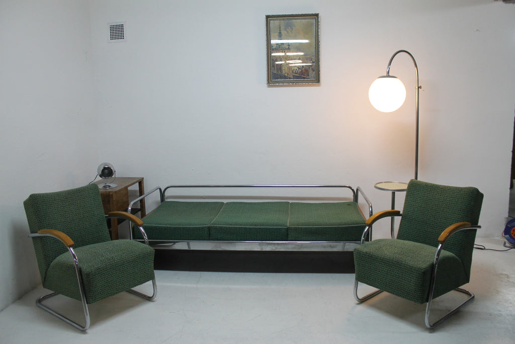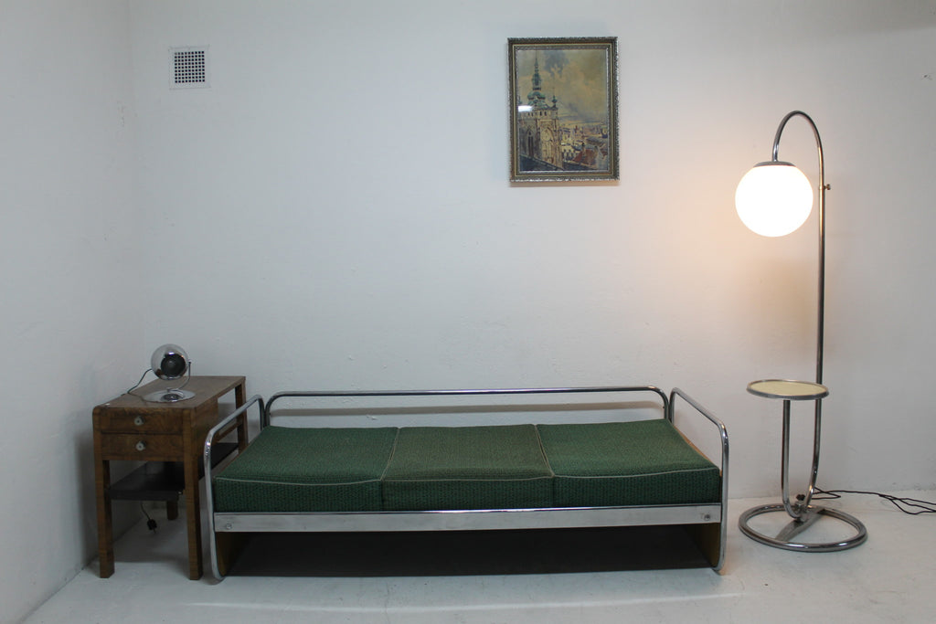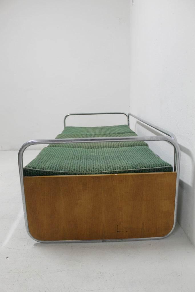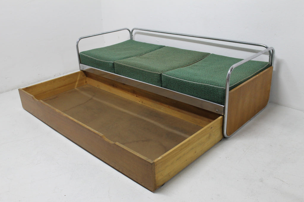This mid-century functionalist tubular sofa was made by Kovona in the former Czechoslovakia in the 1950s. It features a simple design, beech wood panels on the sides, a pull-out storage drawer, the mattresses are original and well-preserved.