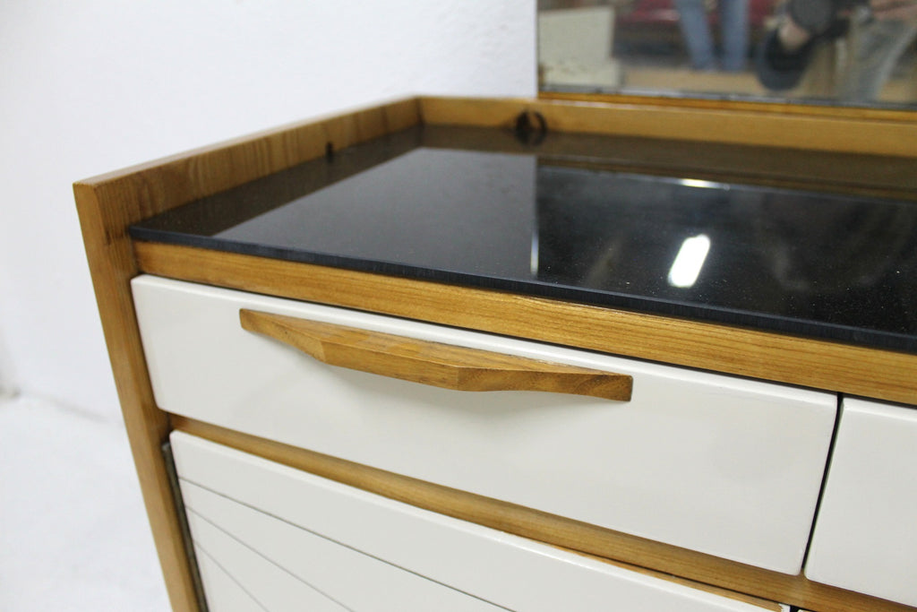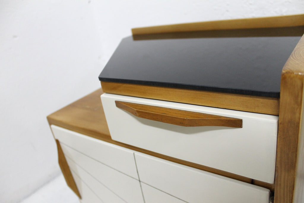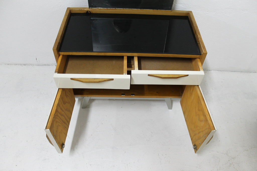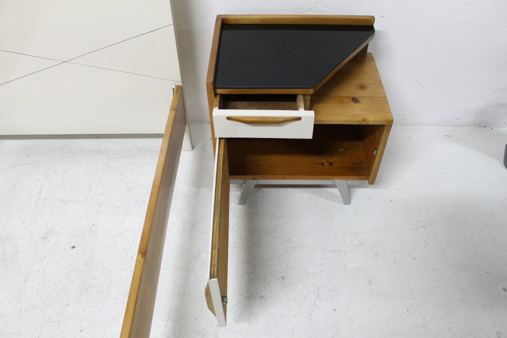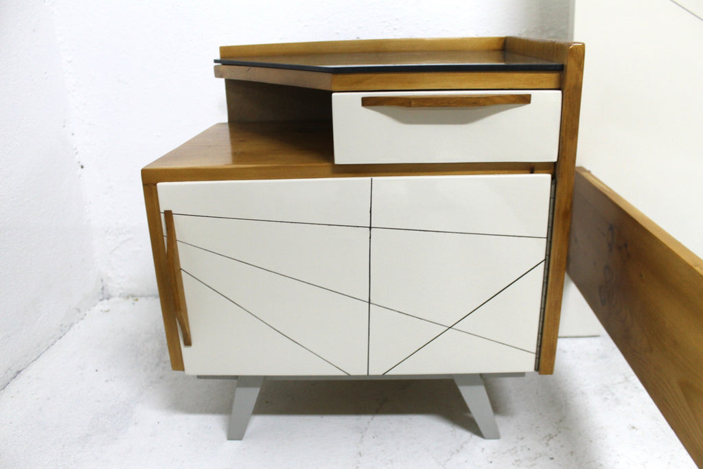 This bedroom set is a beautiful and characteristic example of Czechoslovak furniture design in connection with the so-called Brussels period. This period began with the huge success of the Czechoslovak Pavilion at the world-famous Expo in Brussels in 1958. It is characterized by a modernist design and lightweight materials that greatly facilitate the handling of furniture. This bedroom set was made in the 1960s. It has undergone a complete refurbishment while retaining all original features. The black lines were highlighted, the wood was sanded and varnished and the colored parts were also newly varnished. The furniture is in excellent condition