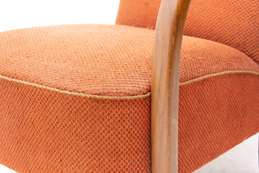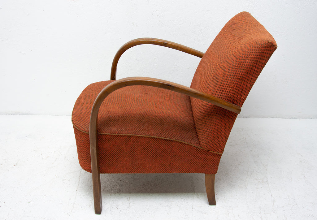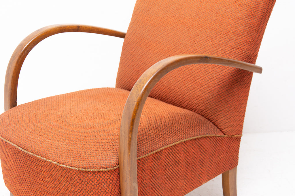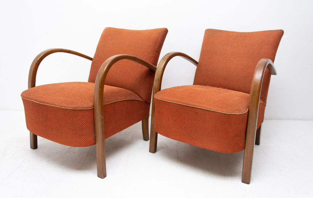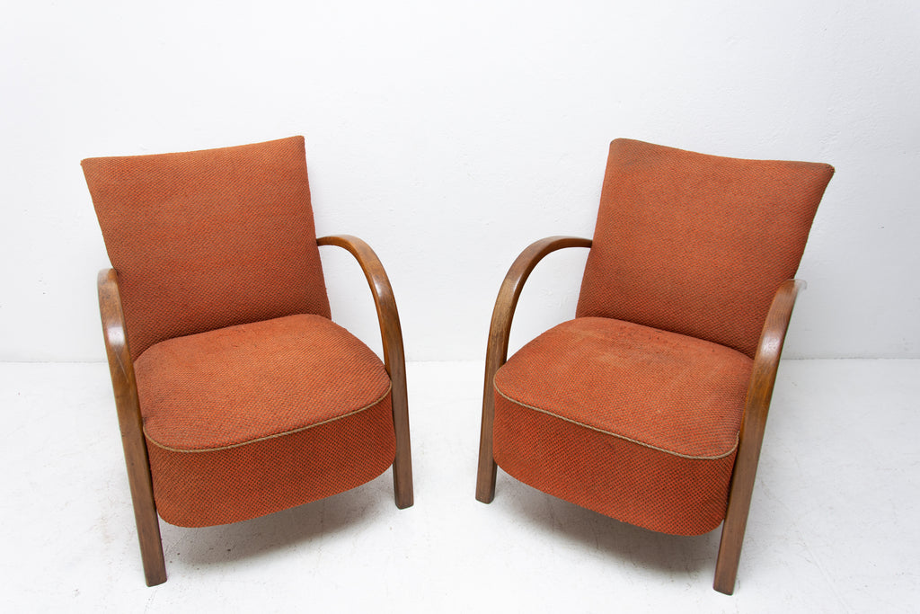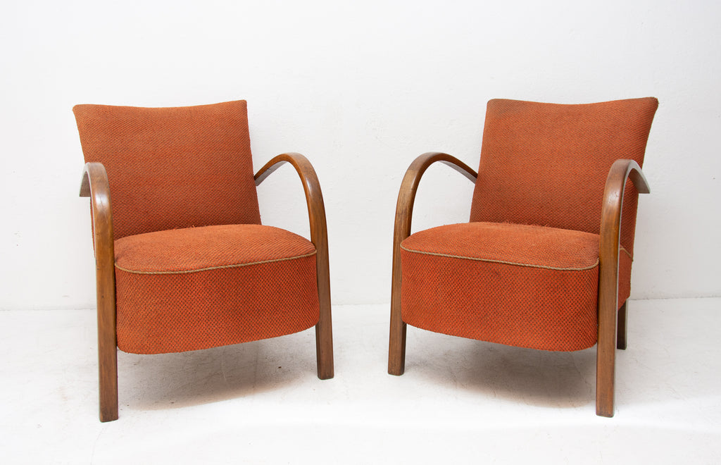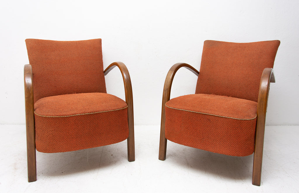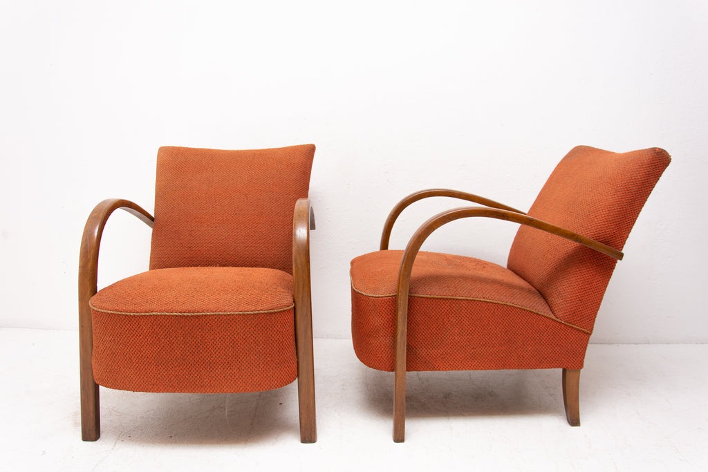 These bentwood armchairs Cataloque No. H-213 were designed by Jindřich Halabala and produced by UP Závody in the 1930´s. The chairs are stable and comfortable. The Structure and upholstery are in good Vintage condition, the fabric bears signs of age and using but without damage. See pictures. Price is for the pair.
