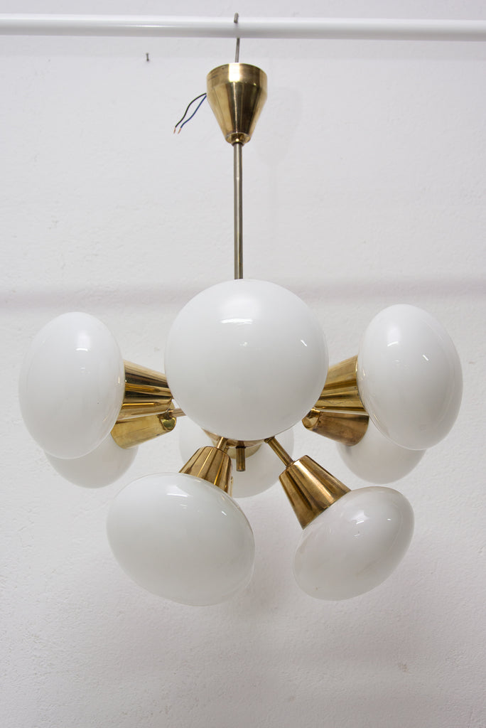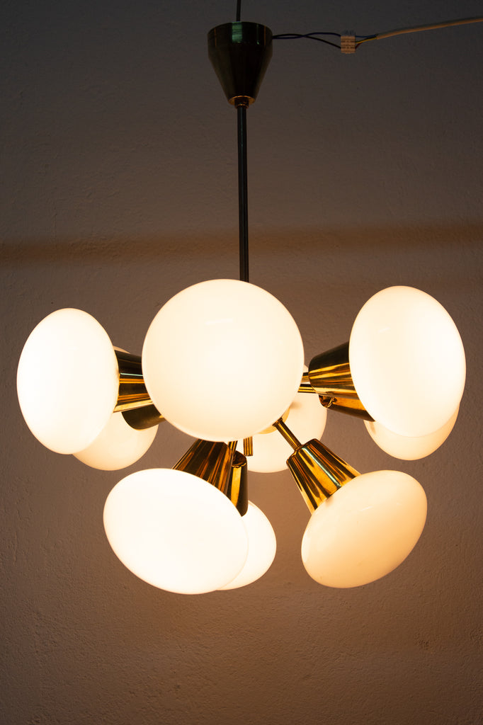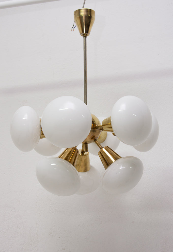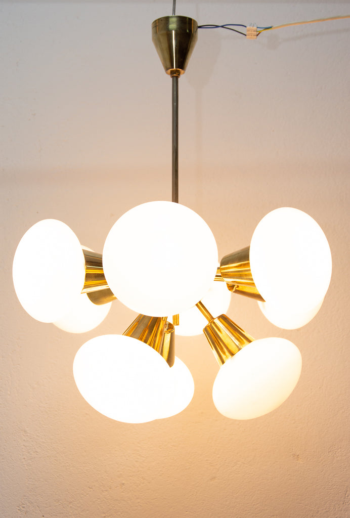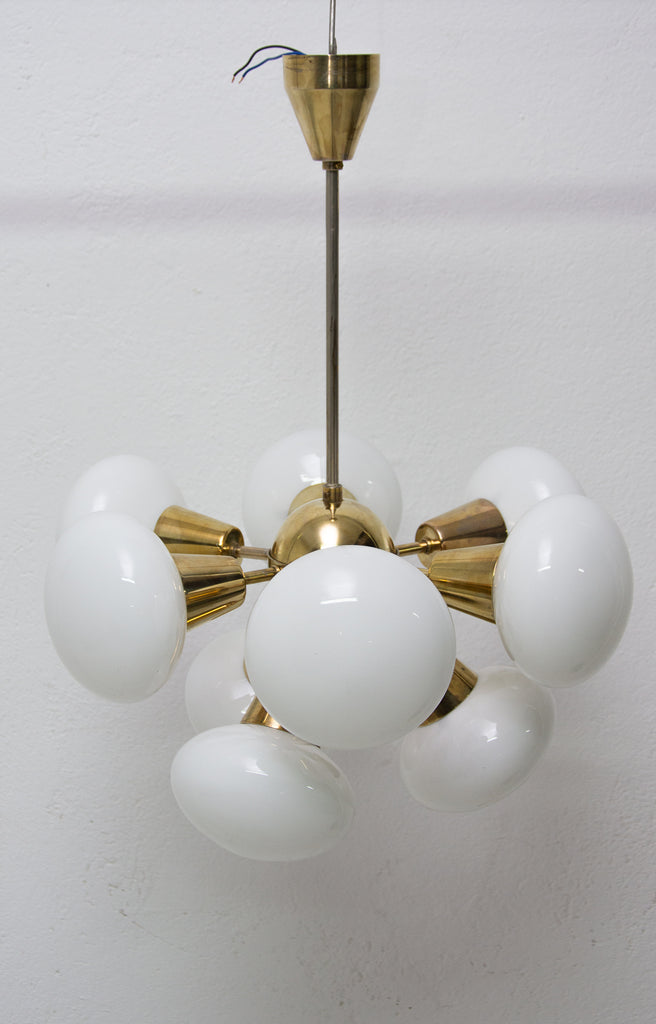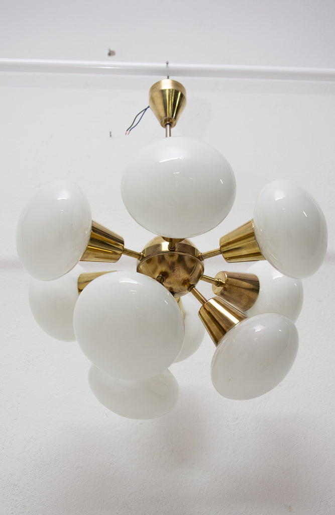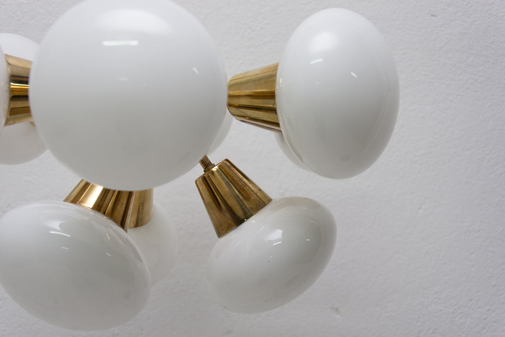 Czechoslovak milky glass and brass ceiling lamp "Sputnik", made in Czechoslovakia in the 1970´s. It features 9 arms. Manufactured by Kamenicky senov. In very good condition, new wiring.