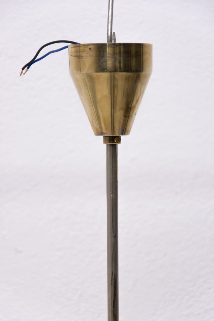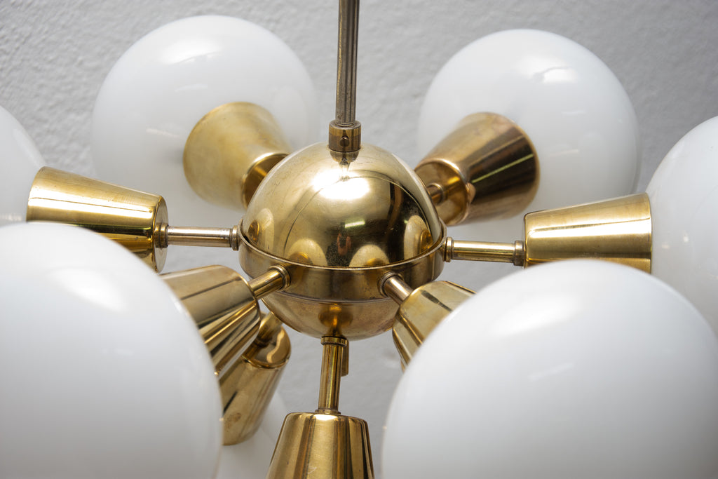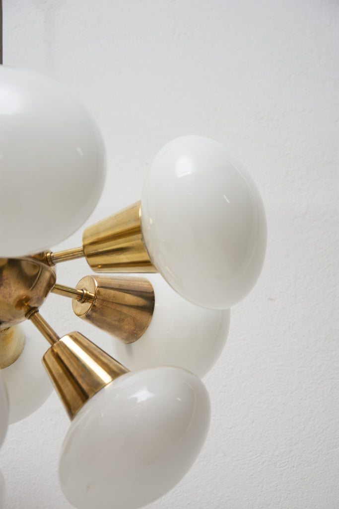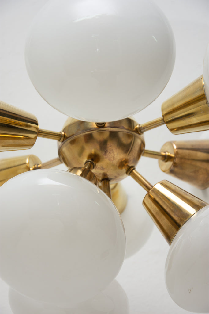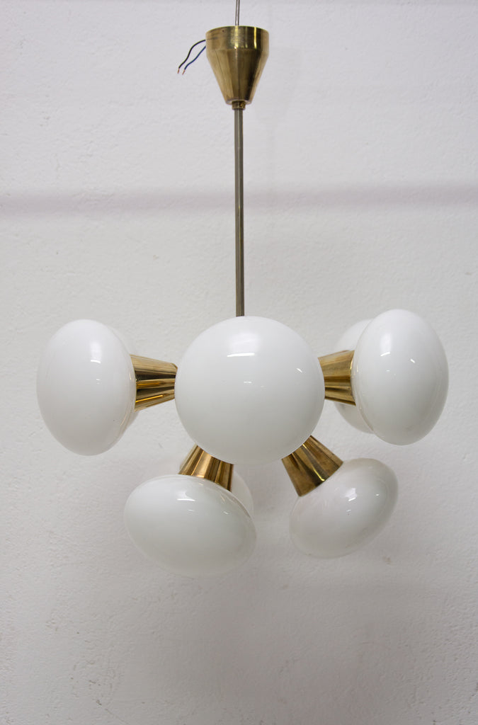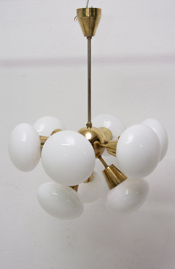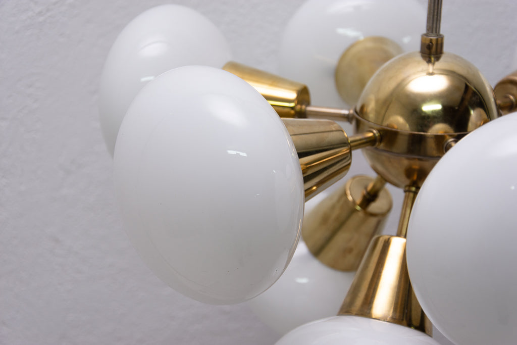 Czechoslovak milky glass and brass ceiling lamp "Sputnik", made in Czechoslovakia in the 1970´s. It features 9 arms. Manufactured by Kamenicky senov. In very good condition, new wiring.