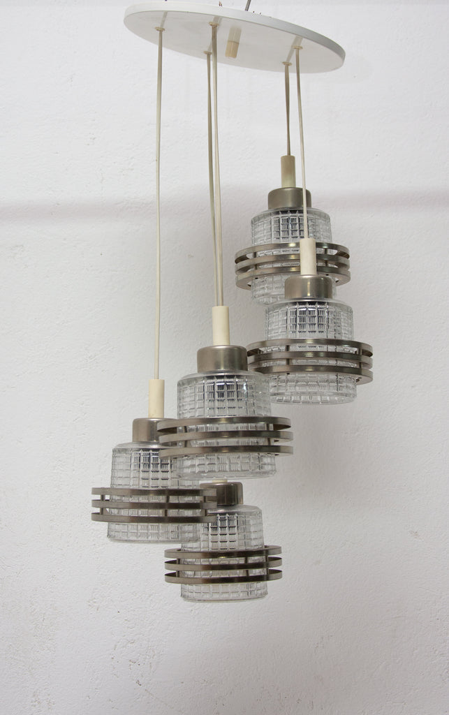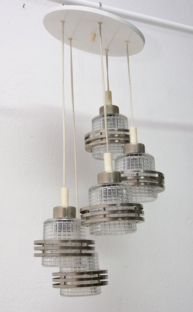 Vintage hanging chandelier with five glass lampshades, Pokrok ¦ilina, Czechoslovakia