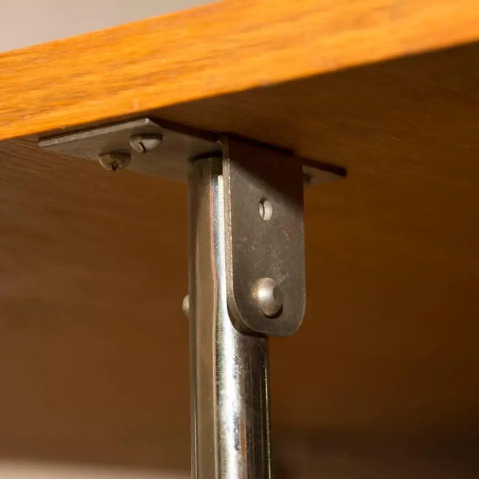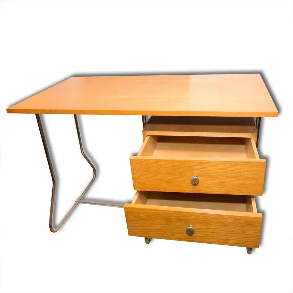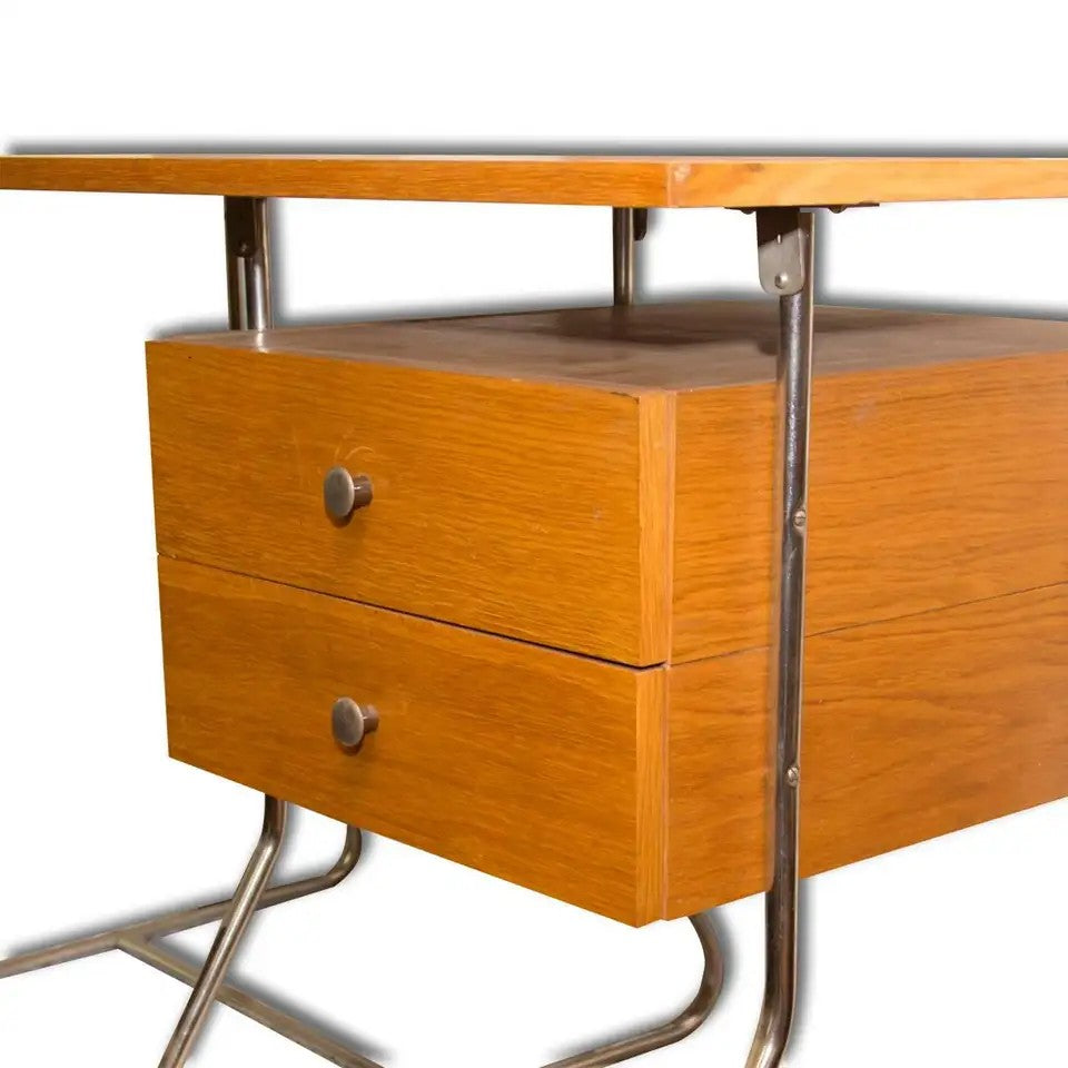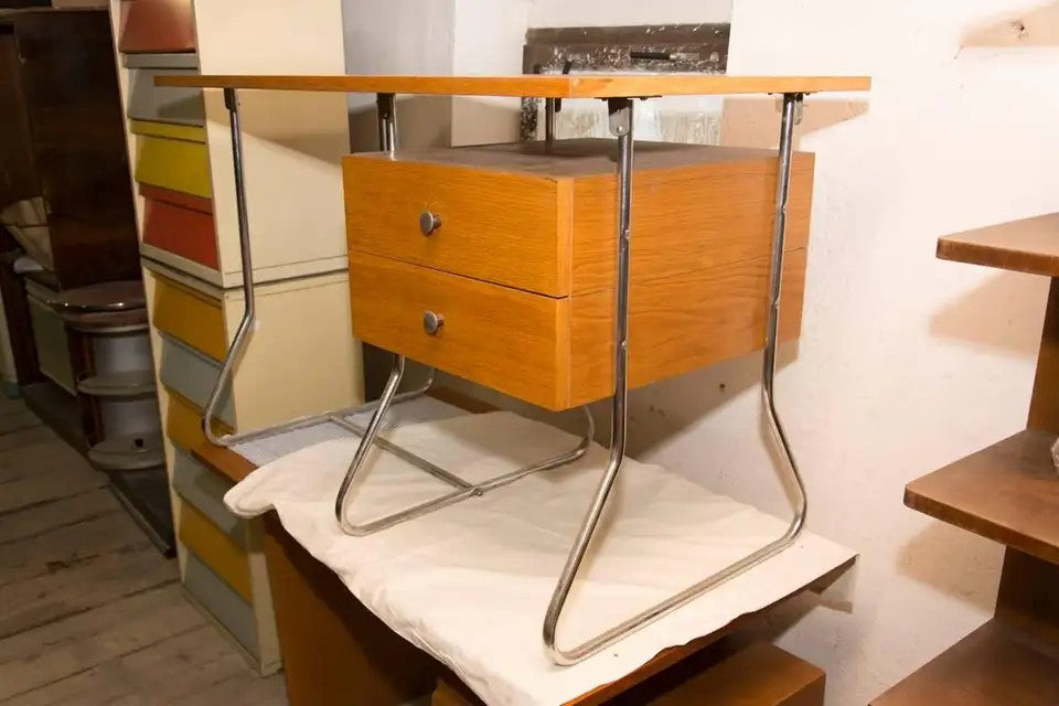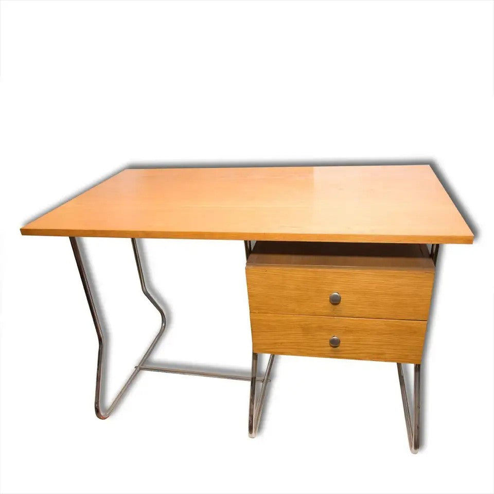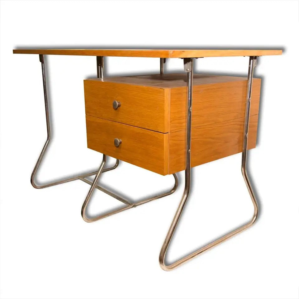 This writing desk was manufactured in the 1950s in post-war Czechoslovakia and produced by Kovona - a company producing metal and chrome-plated furniture. It features a simple design, made of bent chrome-plated steel and veneered plywood. In original and good vintage condition.