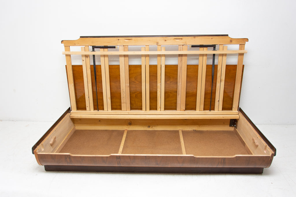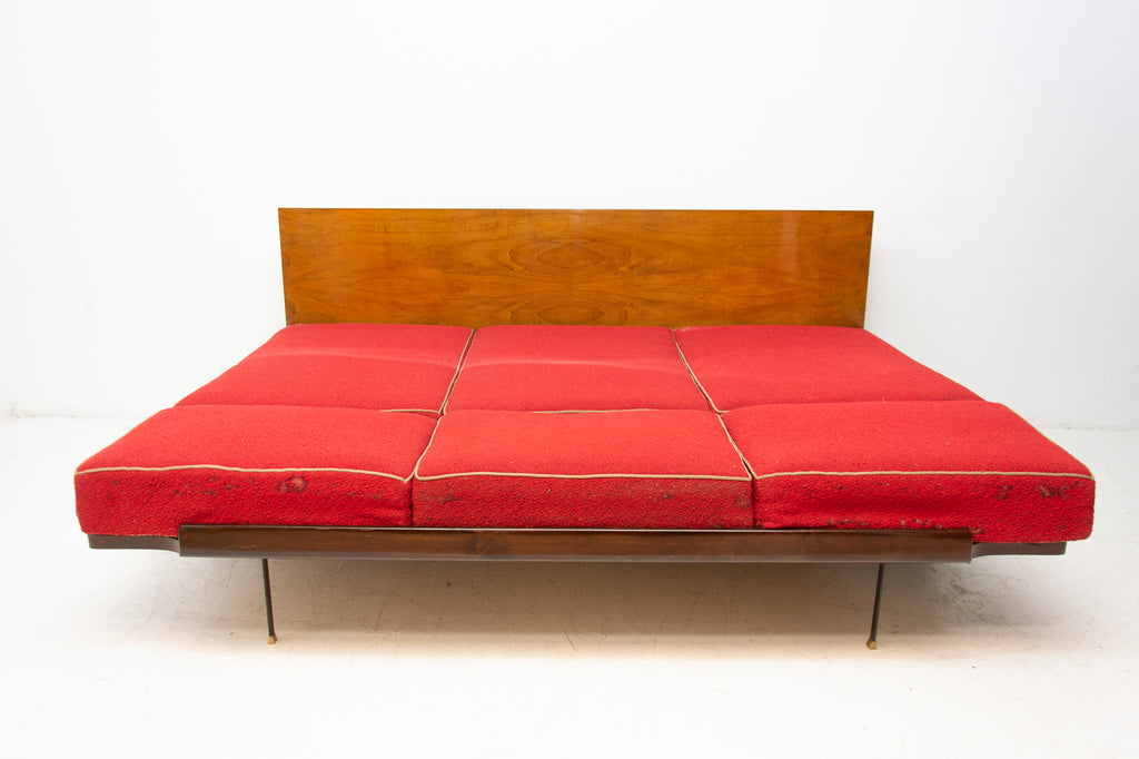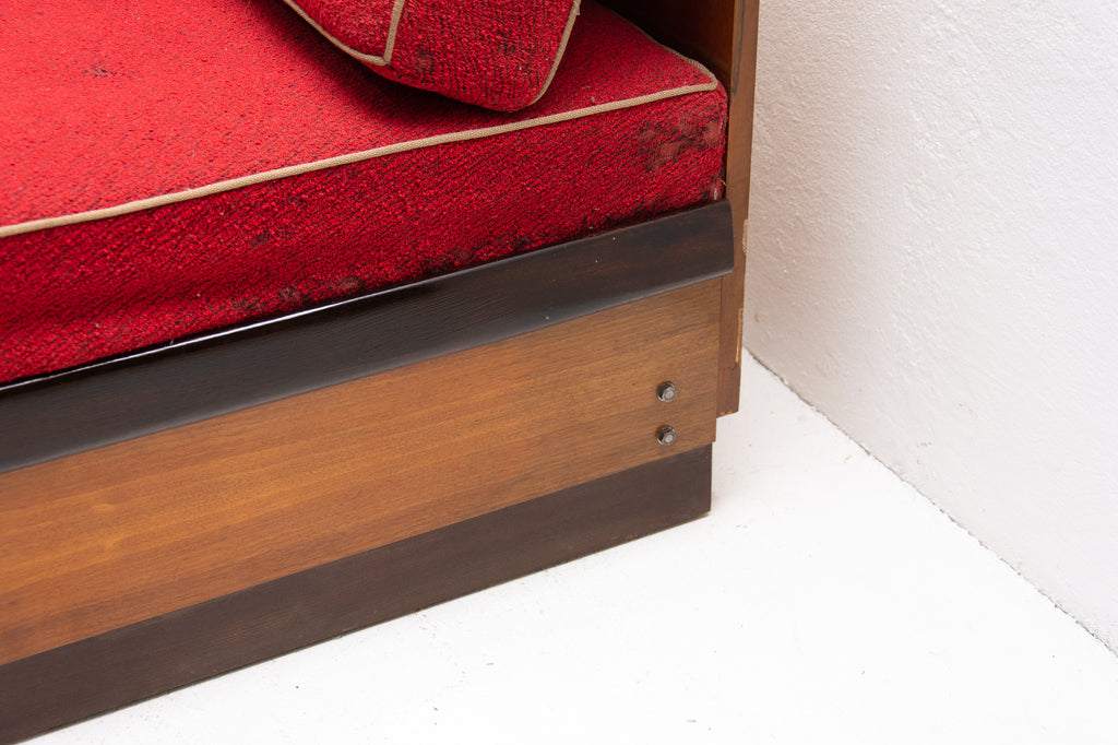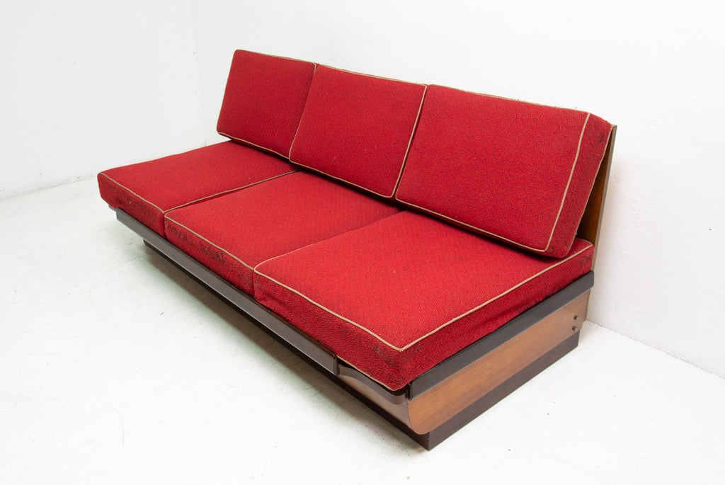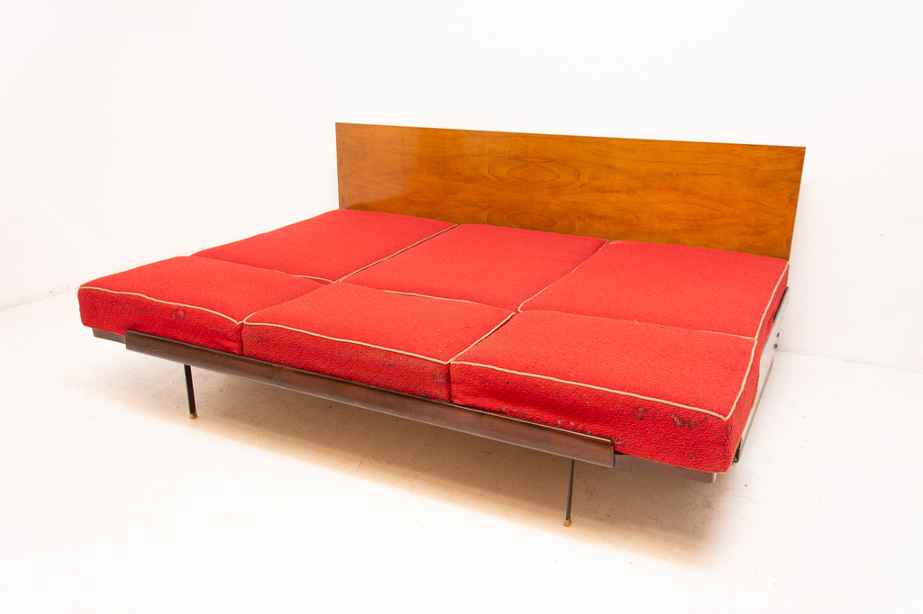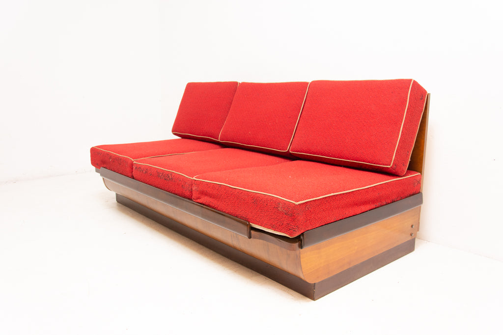 Mid century sofabed designed by Jindřich Halabala. It was made in the former Czechoslovakia in the 1950´s. This sofa features a wooden structure that is veneered in the walnut and a storage space for bedding. Sofa is adjustable for sleeping. The sofa is structurally in good condition, the veneer is in very good condition. The fabric is damaged in several places, new upholstery would be appropriate.