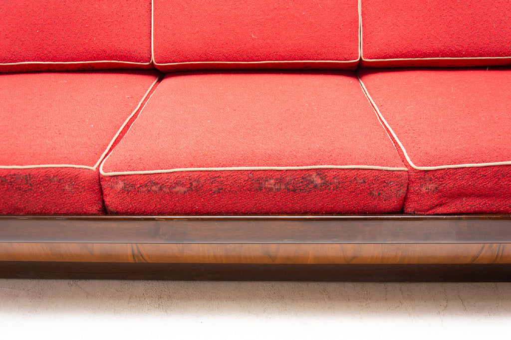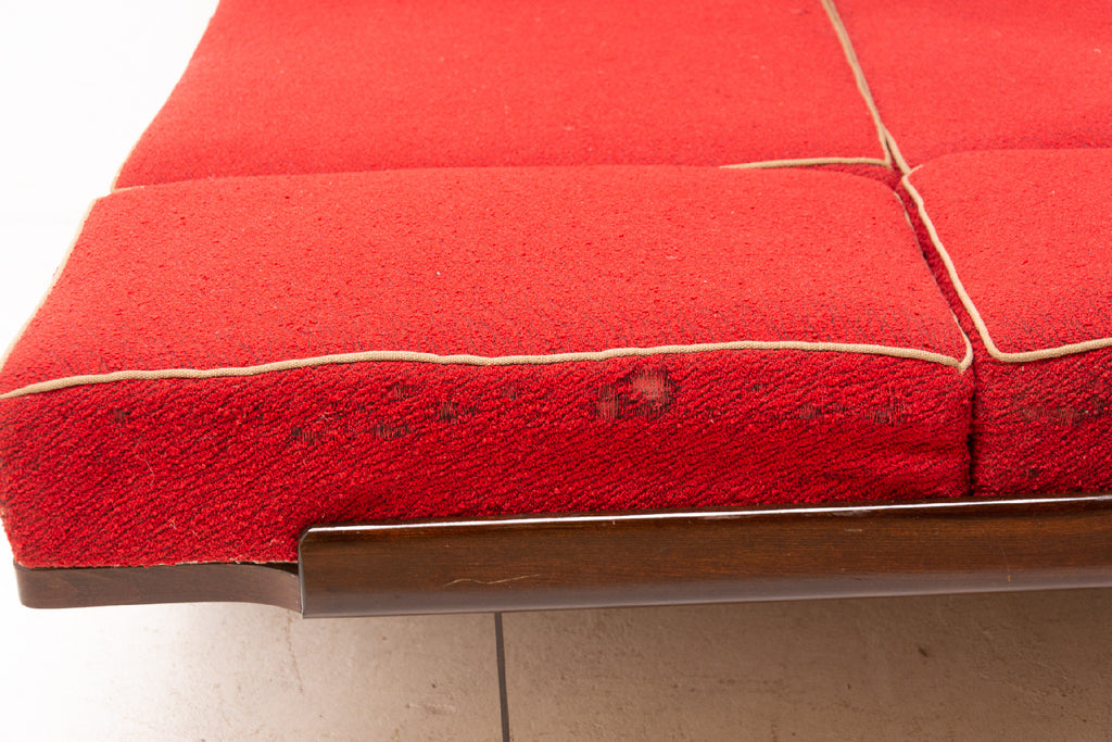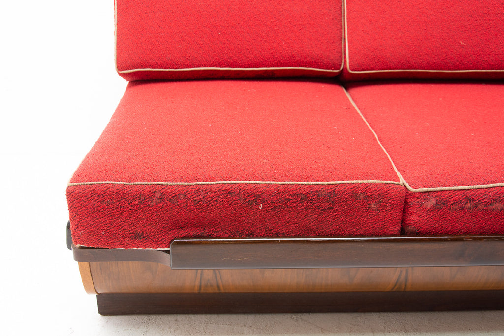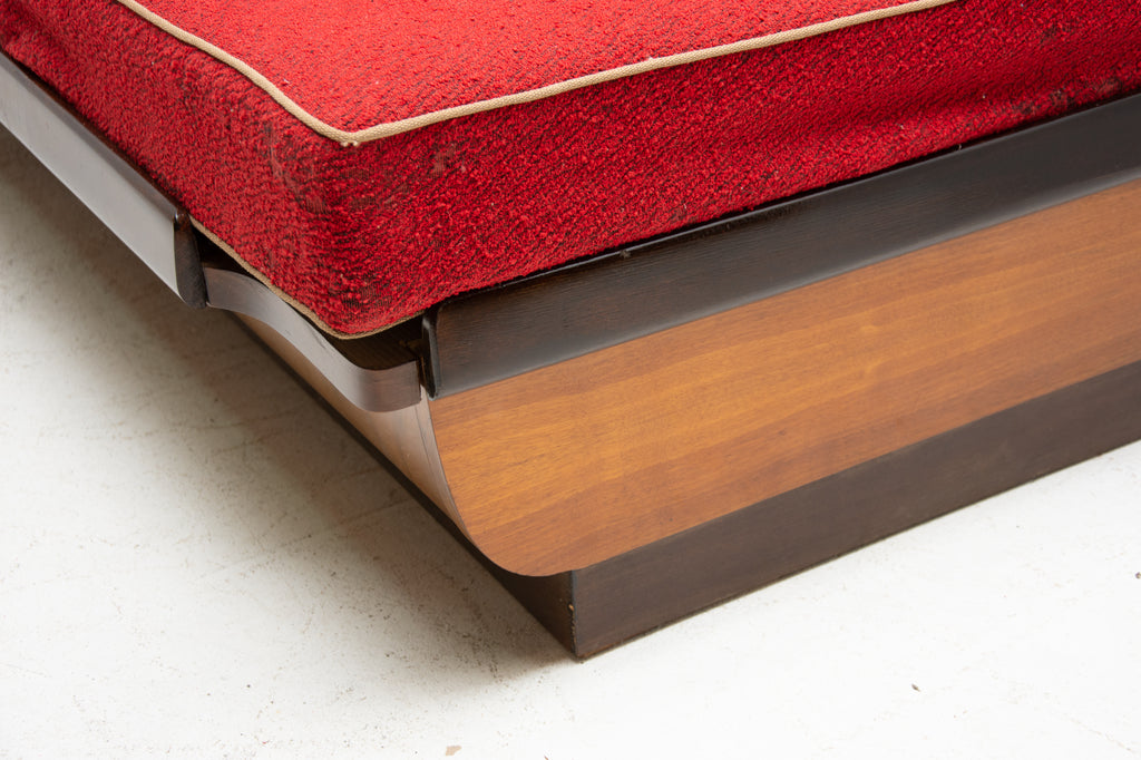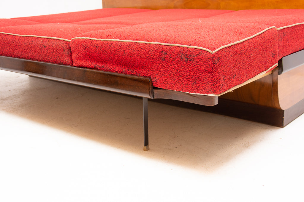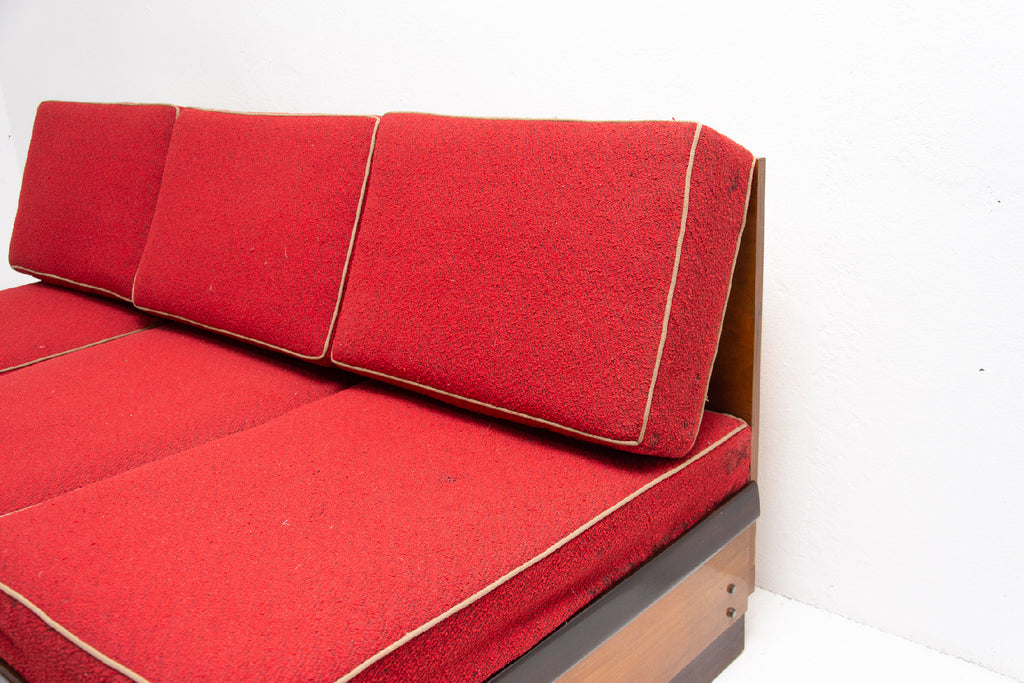 Mid century sofabed designed by Jindřich Halabala. It was made in the former Czechoslovakia in the 1950´s. This sofa features a wooden structure that is veneered in the walnut and a storage space for bedding. Sofa is adjustable for sleeping. The sofa is structurally in good condition, the veneer is in very good condition. The fabric is damaged in several places, new upholstery would be appropriate.