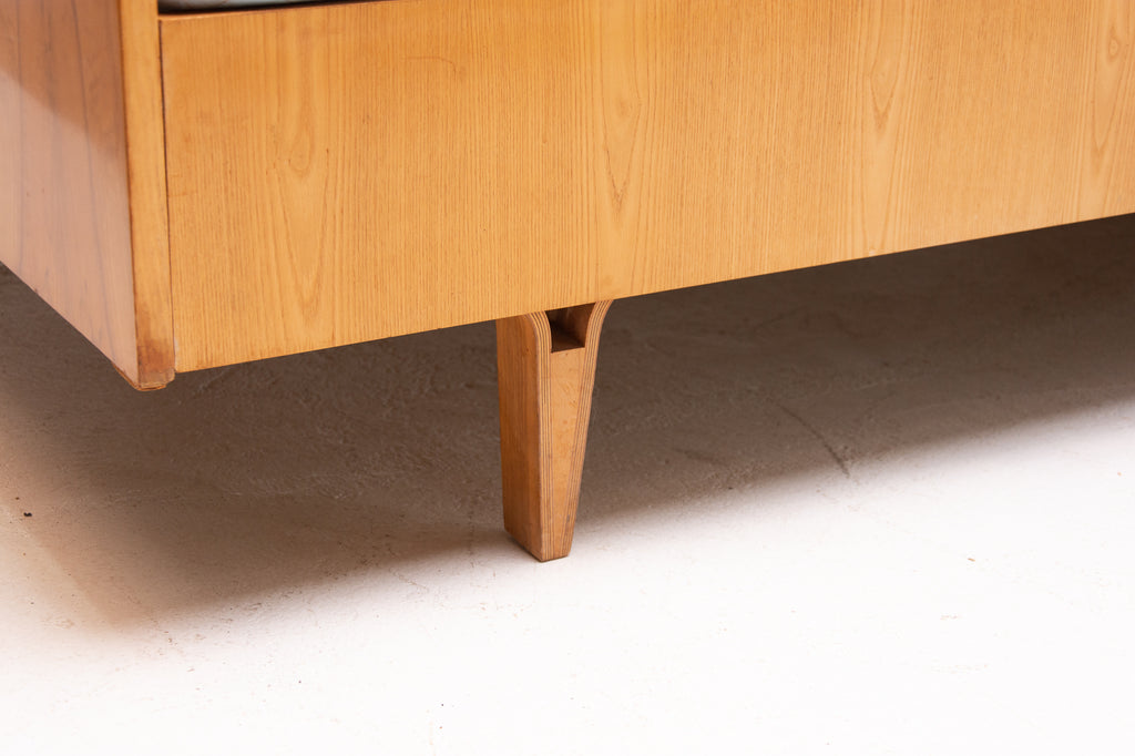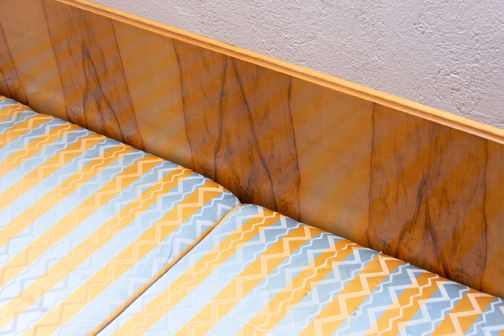 Polished veneer. Very interesting and simple design. This item is in very good Vintage condition. Original mattresses.