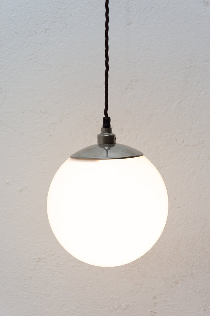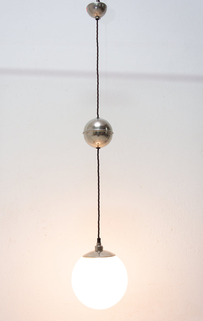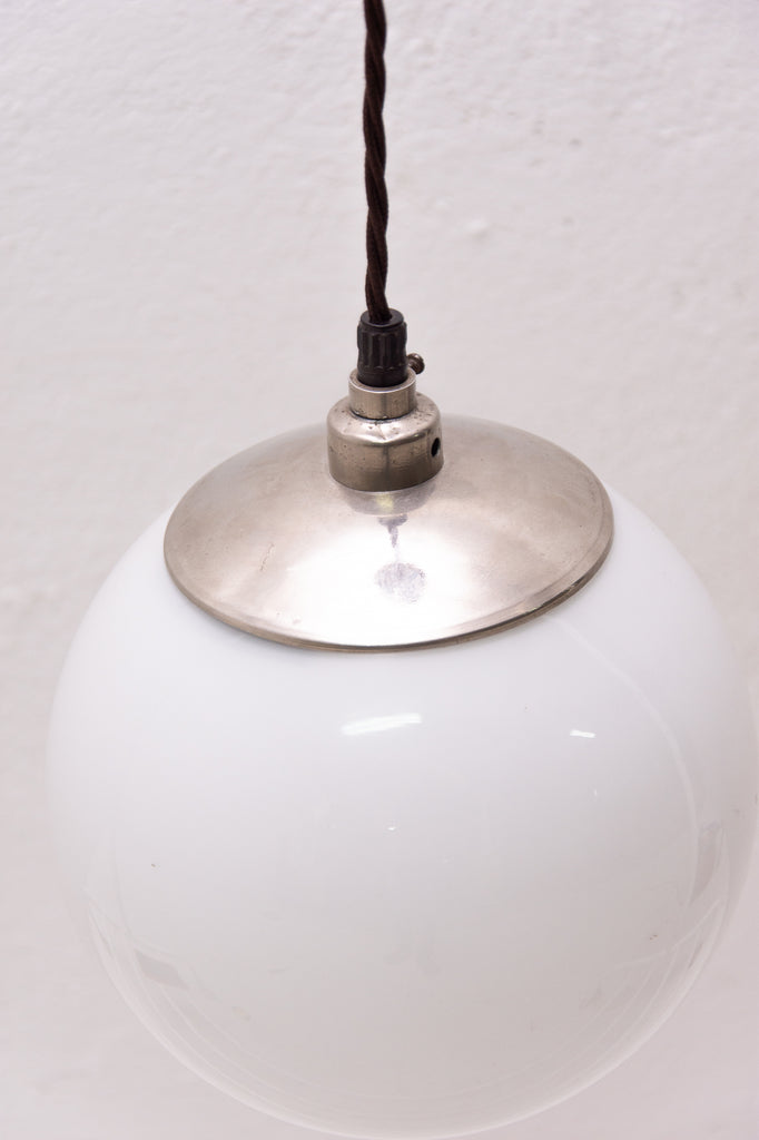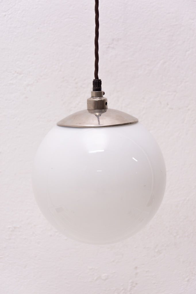 Bauhaus pendant lamp, made in the former Czechoslovakia in the 1940´s. Round opaque glass on a hanging conductive cable. In very good condition. New wiring.