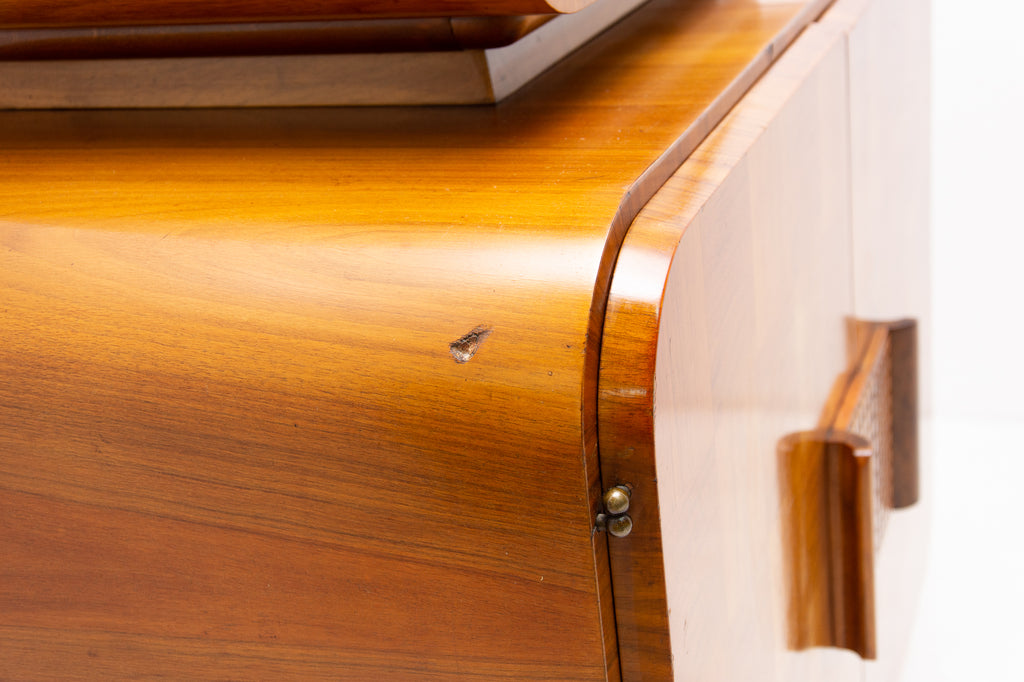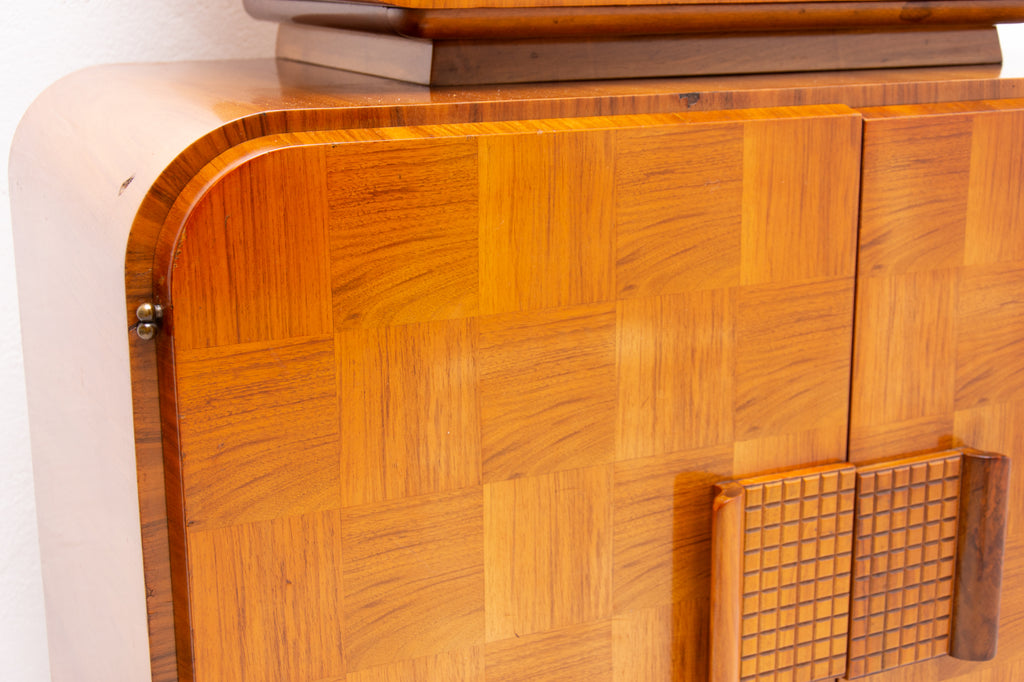 This is an extremely successful piece of design. Rounded edges along the sides of the sideboard, tapered - angled legs, chess pattern on walnut veneer.